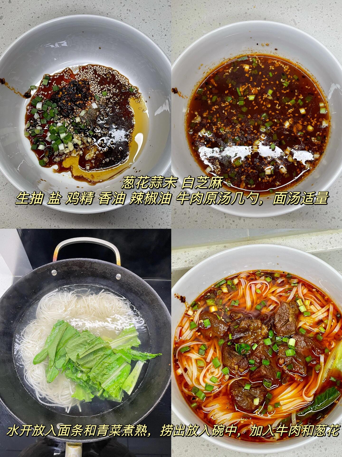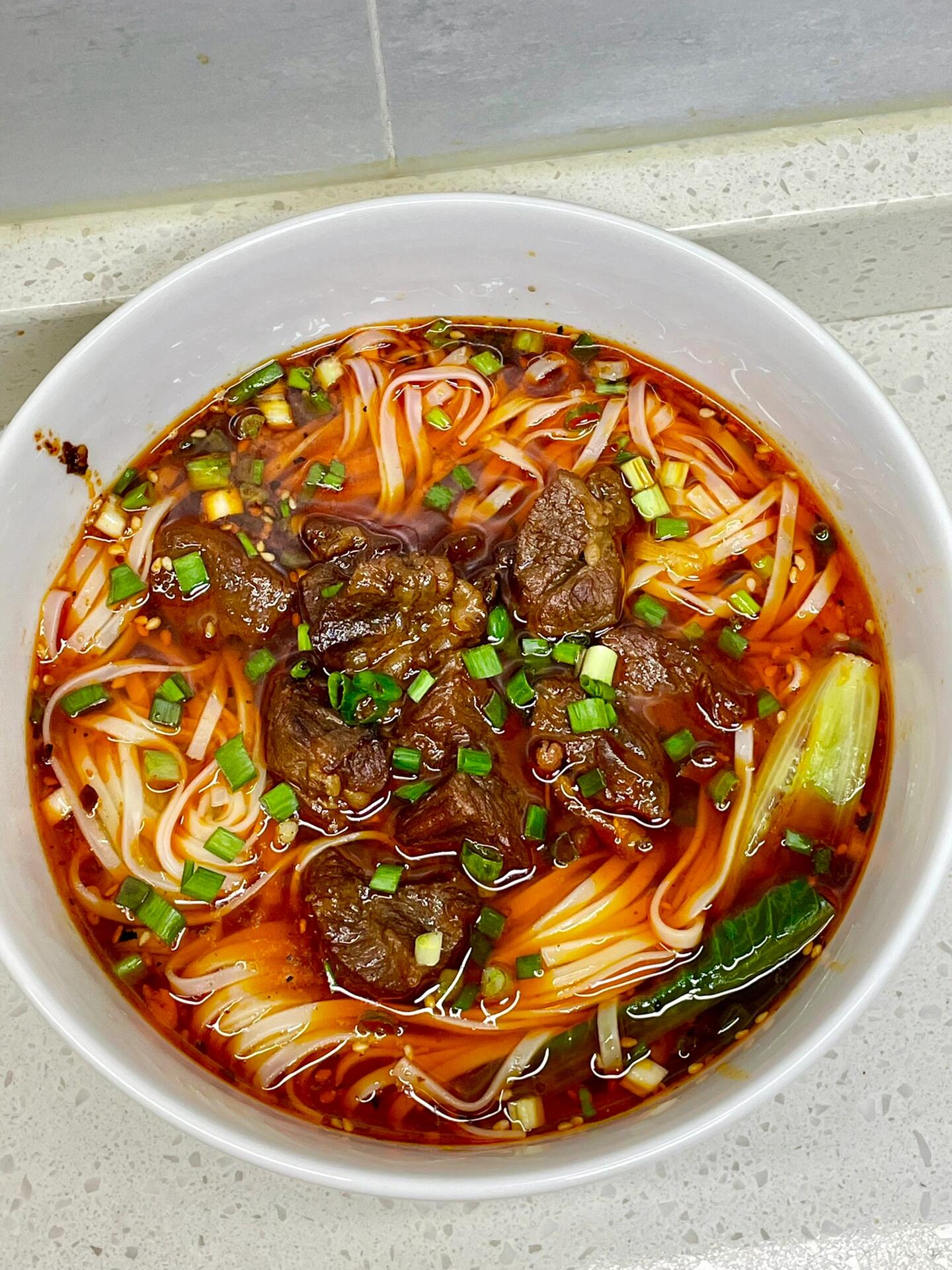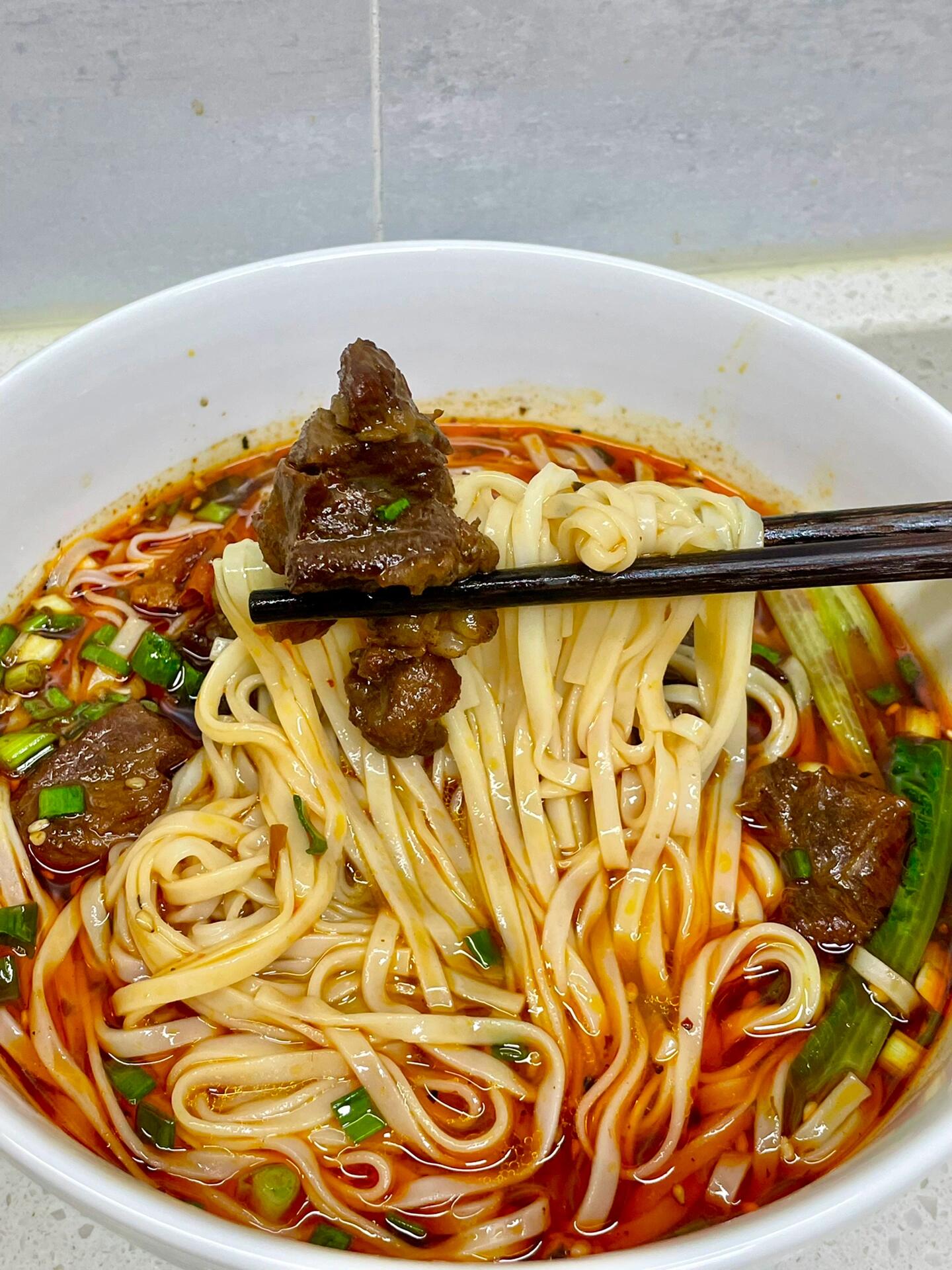 麻辣鲜香的原汤牛肉面,附详细做法~ 红烧牛肉yyds,原汤浓郁,拌个面条也太好吃了,想吃多少肉就加多少,主打一个吃过瘾 1、牛肉洗净切块冷水下锅,放入葱姜料酒焯水去腥,捞出控干水分 2、锅中油热倒入冰糖,转小火炒至枣红色起泡状态,倒入焯好的牛肉翻炒上色,倒入姜蒜炒香,倒入火锅底料炒化,加一勺豆瓣酱炒出红油,再倒入桂皮八角香叶 干花椒 干辣椒炒香,加入一勺生抽 一勺老抽炒匀 3、转入压力锅,加入适量开水没过食材,盖盖炖煮45分钟,挑出大料,加点点盐和鸡精即可 4、碗中加入葱花 蒜末 白芝麻 少许生抽 盐 鸡精 香油 一小勺辣椒油 再加入两勺牛肉原汤 适量面汤,面条和青菜煮熟捞出放入碗中,放入牛肉和葱花即可