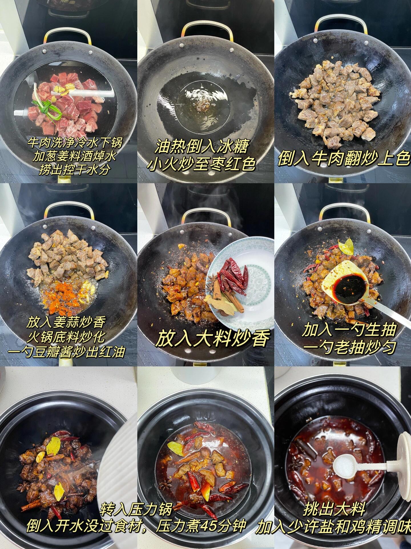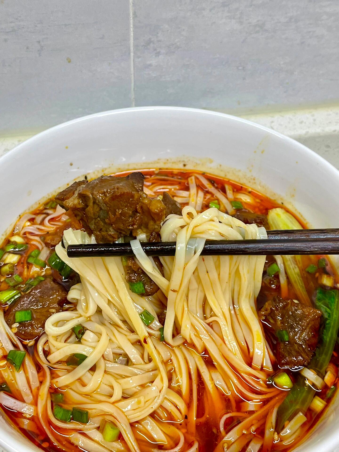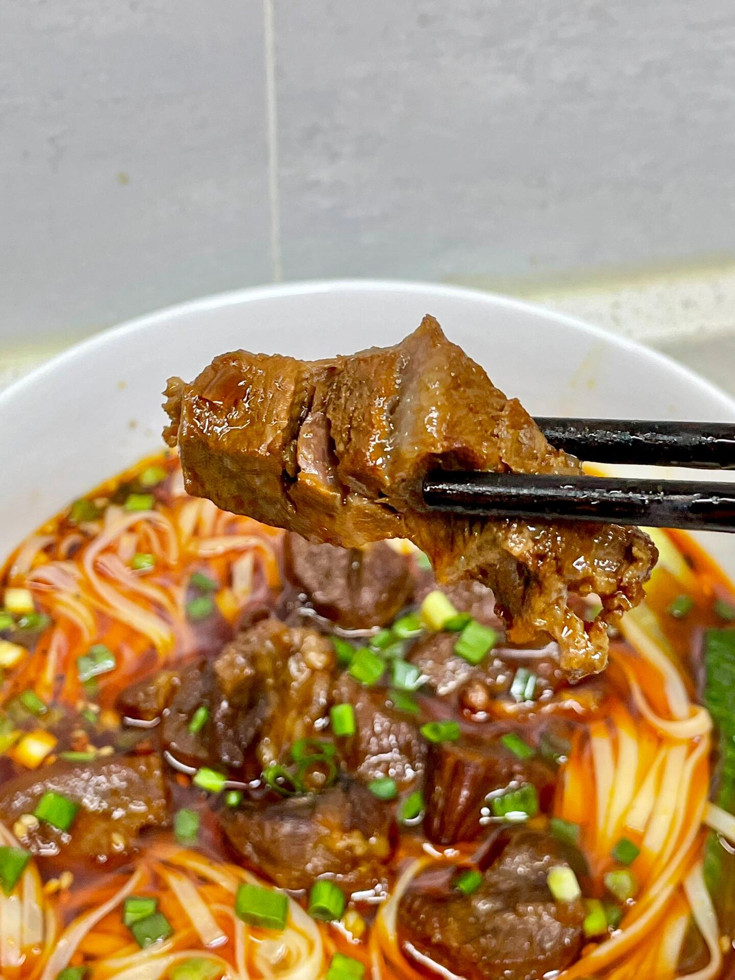 麻辣鲜香的原汤牛肉面,附详细做法~ 红烧牛肉yyds,原汤浓郁,拌个面条也太好吃了,想吃多少肉就加多少,主打一个吃过瘾 1、牛肉洗净切块冷水下锅,放入葱姜料酒焯水去腥,捞出控干水分 2、锅中油热倒入冰糖,转小火炒至枣红色起泡状态,倒入焯好的牛肉翻炒上色,倒入姜蒜炒香,倒入火锅底料炒化,加一勺豆瓣酱炒出红油,再倒入桂皮八角香叶 干花椒 干辣椒炒香,加入一勺生抽 一勺老抽炒匀 3、转入压力锅,加入适量开水没过食材,盖盖炖煮45分钟,挑出大料,加点点盐和鸡精即可 4、碗中加入葱花 蒜末 白芝麻 少许生抽 盐 鸡精 香油 一小勺辣椒油 再加入两勺牛肉原汤 适量面汤,面条和青菜煮熟捞出放入碗中,放入牛肉和葱花即可
