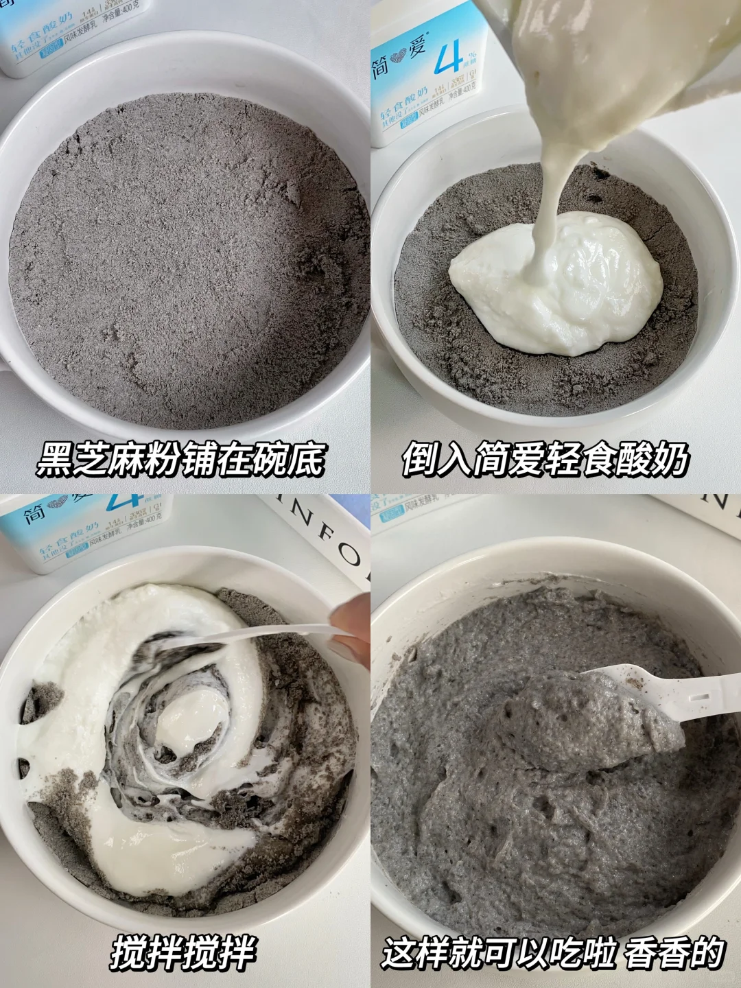 想长头发的姐妹attention! 长头发变漂亮的搭配让我找到了! 就是这个大火的黑芝麻粉配上酸奶,又好吃又长头发 最近尝试了一下黑芝麻粉+酸奶,真嘟好搭啊! - 关于黑芝麻养头发,很多古代医学典籍里都有记载” 所以黑芝麻搭配酸奶,可以说是强强联合了,好喝还养头发,就是说爱美这块我不服输h h - 酸奶我用的是简爱轻食酸奶0% 蔗糖版的 它的配料表敲干净,只有99%生牛乳和乳酸菌,其他没了 有2 款可以选择~ 日常低糖入门,建议姐妹👭入手4%蔗糖版的!糖份减半 还可以当作下午茶 淡淡的自然清甜空口吃都很赞! 健身刷脂宝们真嘟要试试0% 蔗糖版的 0 糖0 代糖,好入口一点也不酸! 都是低 GI 低GL的,饱腹感超强👍,做代餐太绝了 热量也很低,每百克热量只有69大卡! - 还有谁没试过简爱轻食酸奶的,我真的会😭 想刷脂作代餐吃的👭,可以闭眼冲!