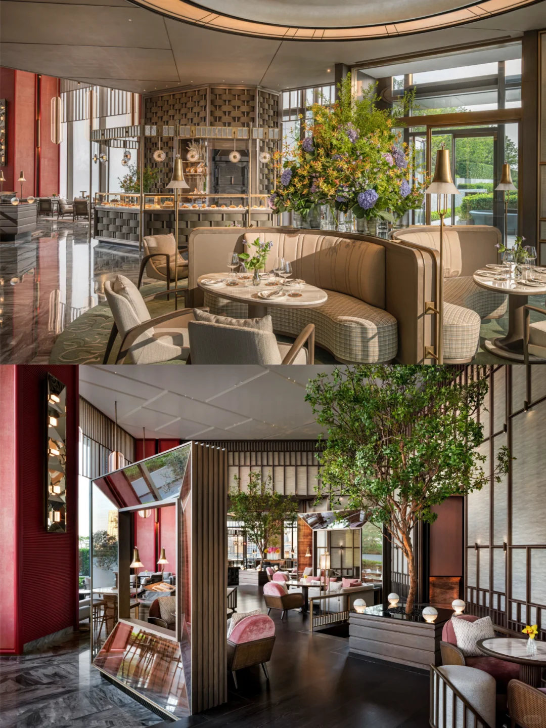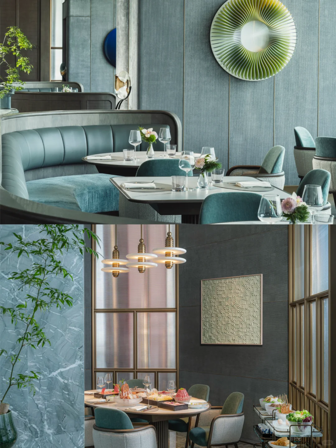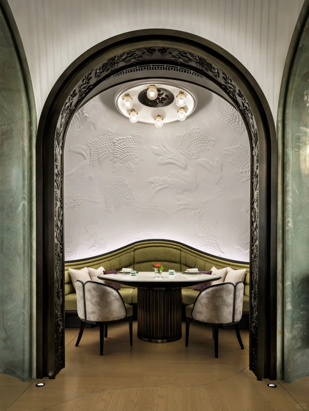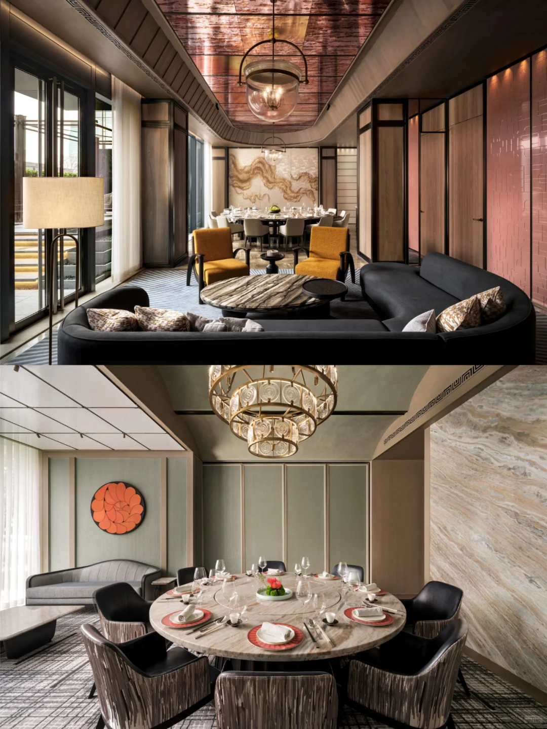 中餐厅「颂」内外景观设计皆延续江南园林的意境,以水、石材及植栽勾勒出平和宁静的氛围,重现古代文人茶宴的诗意。四间私人包厢分别以「琴、棋、书、画」为主题,将中式艺术的精髓融入设计细节,营造低调奢华之感。