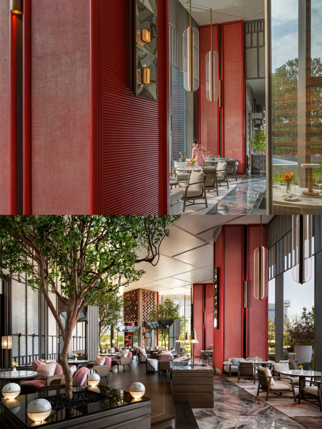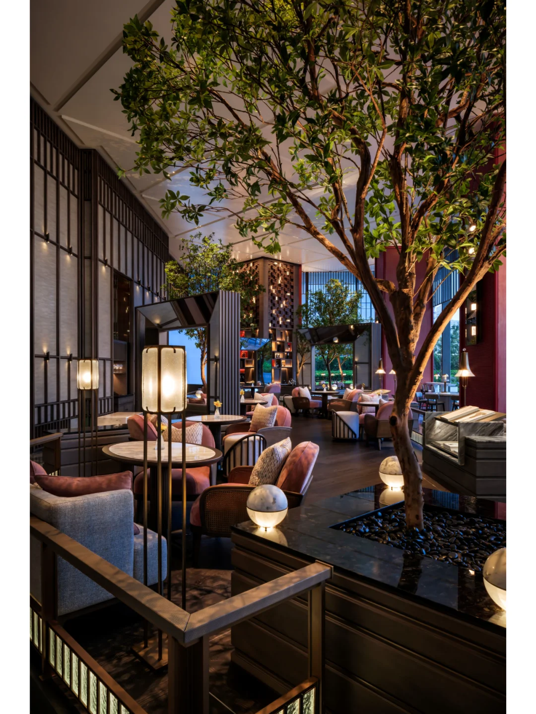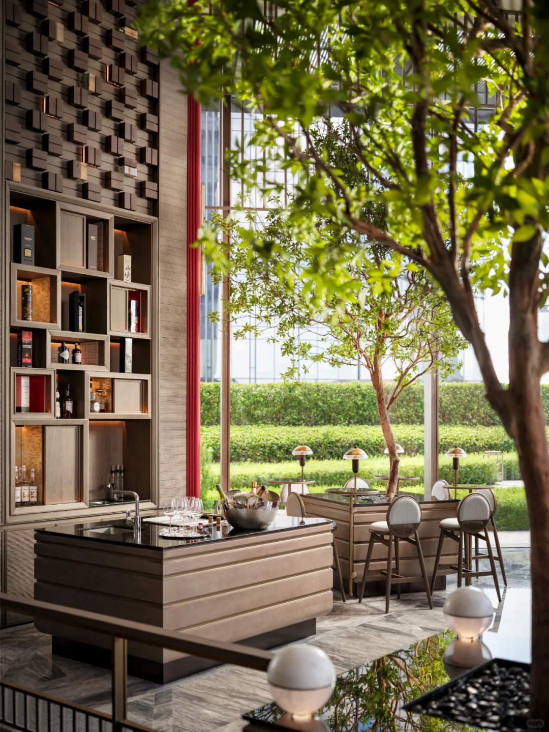 中餐厅「颂」内外景观设计皆延续江南园林的意境,以水、石材及植栽勾勒出平和宁静的氛围,重现古代文人茶宴的诗意。四间私人包厢分别以「琴、棋、书、画」为主题,将中式艺术的精髓融入设计细节,营造低调奢华之感。