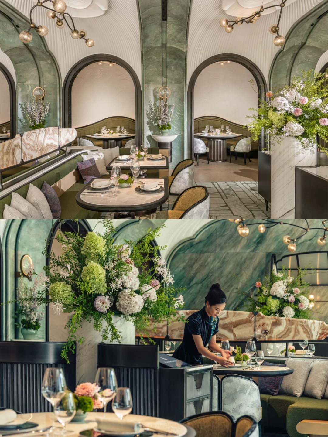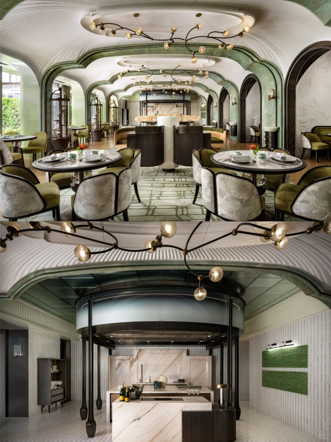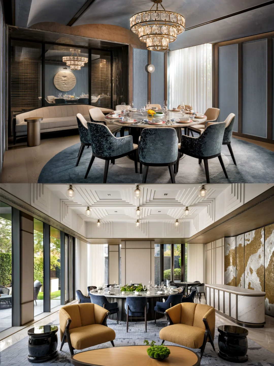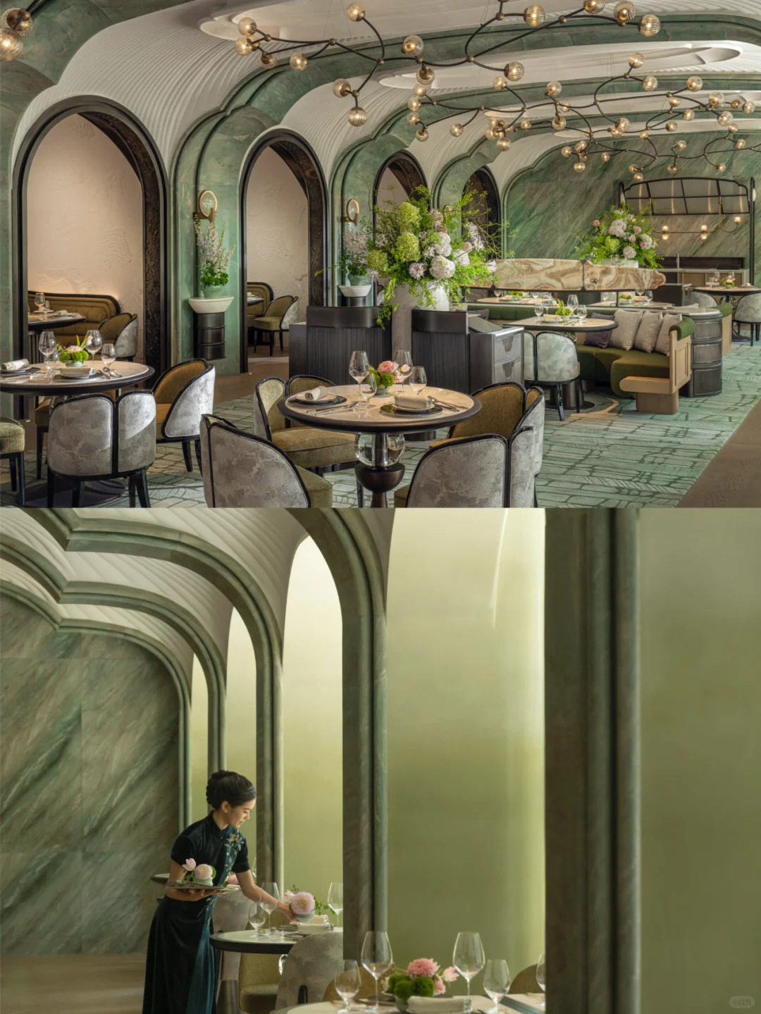 中餐厅「颂」内外景观设计皆延续江南园林的意境,以水、石材及植栽勾勒出平和宁静的氛围,重现古代文人茶宴的诗意。四间私人包厢分别以「琴、棋、书、画」为主题,将中式艺术的精髓融入设计细节,营造低调奢华之感。