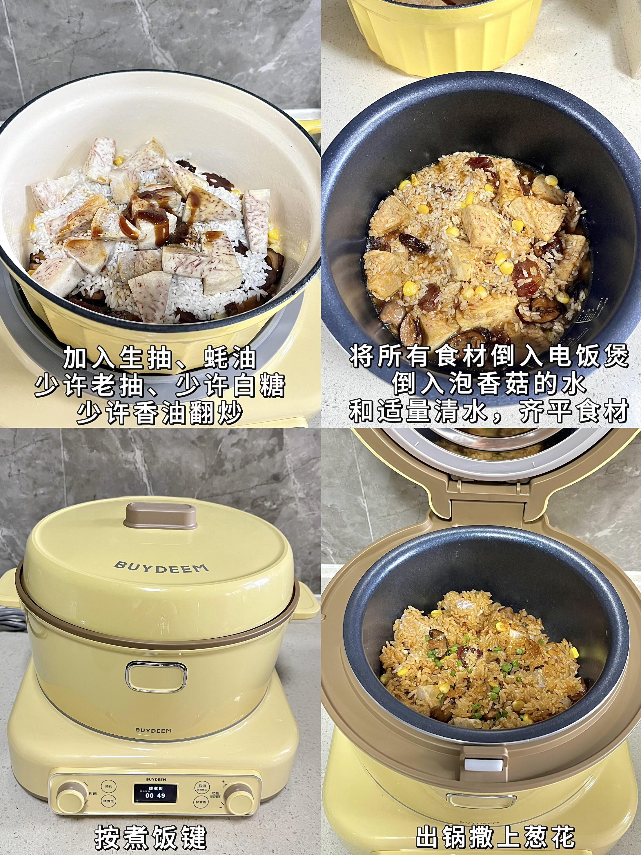 简单快手的芋头腊肠焖饭,粉甜的芋头加上咸香的腊肠,主打一个好吃不腻,一口就爱上,做法简单,谁做谁好吃 食材:大米、芋头、腊肠、干香菇、玉米粒、葱 做法: 1、大米用冷水浸泡一小时 2、油热下芋头,煎至微微发黄盛出 3、再放入腊肠、泡发好的香菇、玉米粒炒香,倒入大米、芋头 4、加入生抽、蚝油、少许老抽、少许白糖、少许香油翻炒 5、将所有食材倒入电饭煲中,倒入泡香菇的水和适量清水,齐平食材 6、按煮饭键,出锅撒上葱花即可