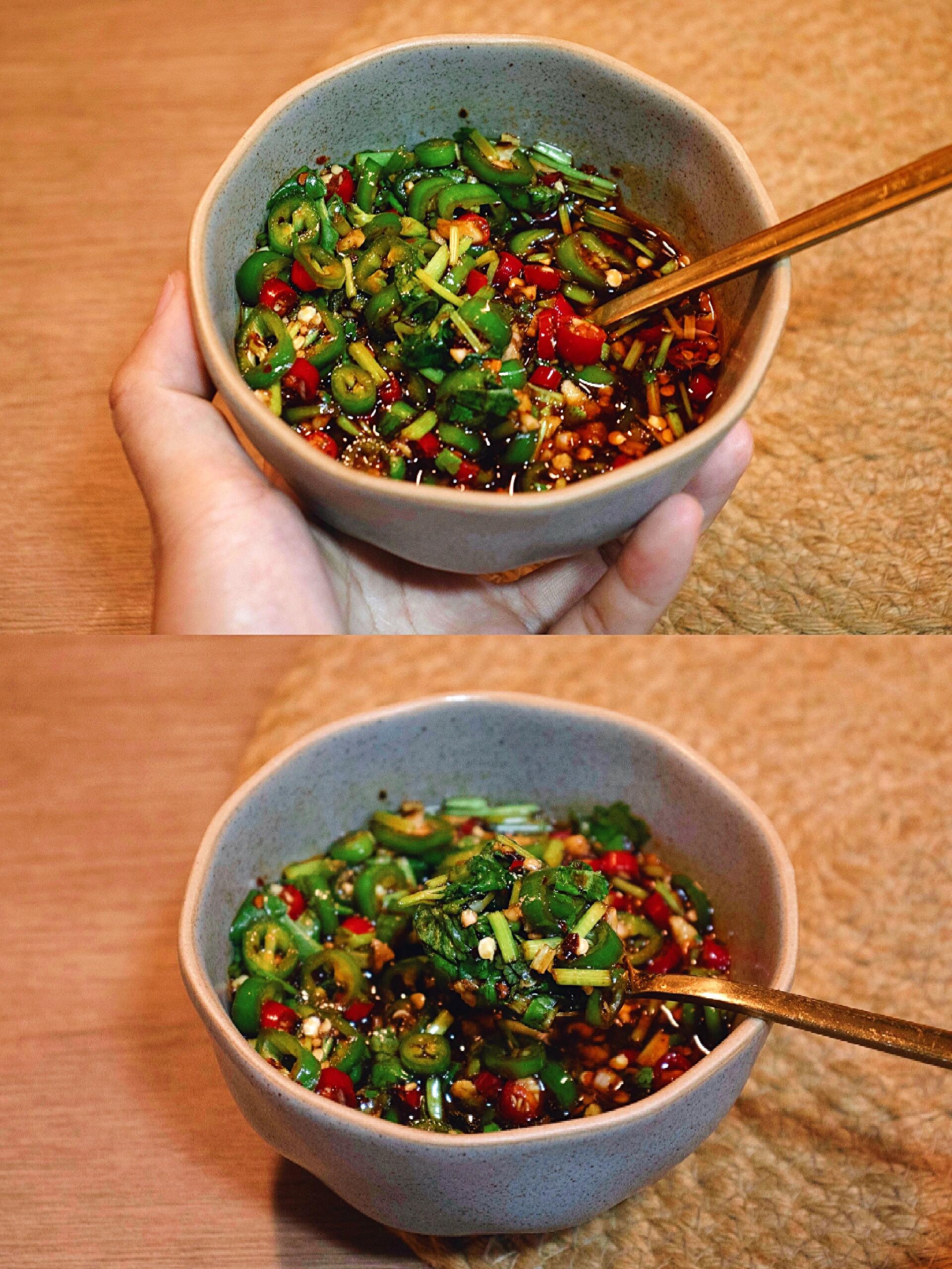 没想到这样做的腌辣椒,全家都喜欢~ 做法很简单,调料随便拌一拌,做好之后立马就可以食用了,也不用特意冷藏,拌饭班吗,都贼香~ 做法:碗中加入蒜末,青红辣椒,香菜,五勺生抽,一勺白砂糖,一勺陈醋,一勺芝麻油,一勺油泼辣子,搅拌均匀就可以了; 喜欢的姐妹,赶紧试一下~