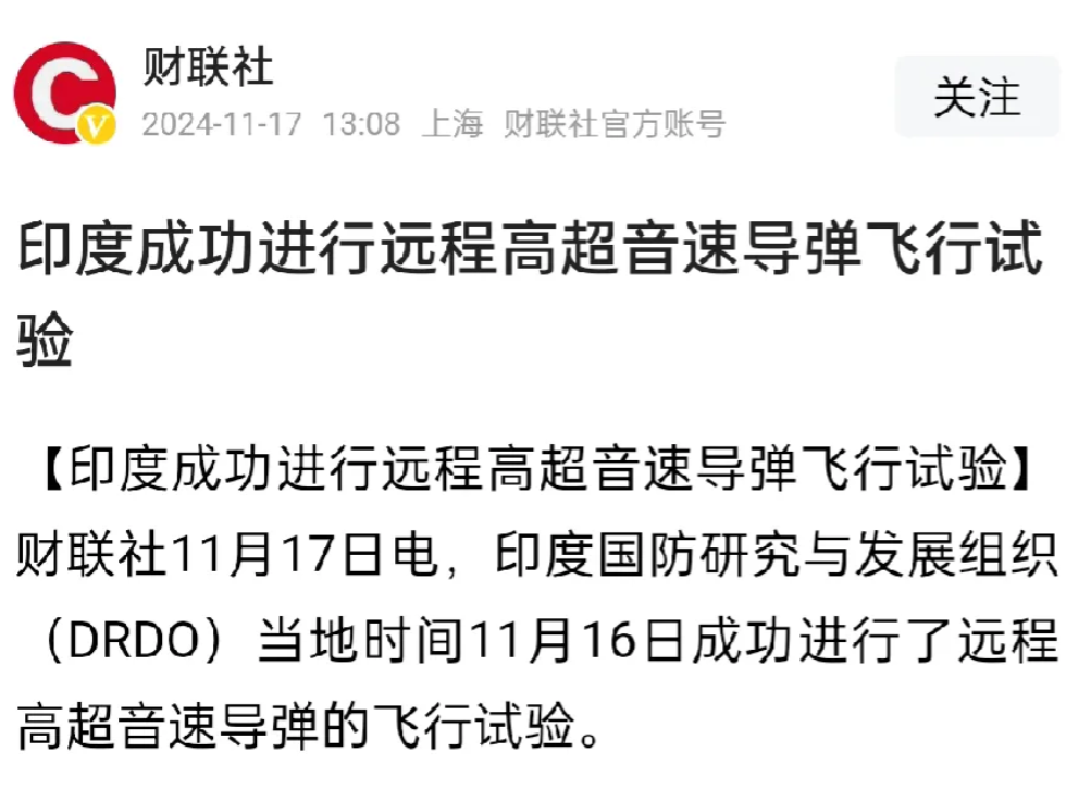据媒体报道,印度与当地时间16日,成功进行了高超音速导弹飞行试验。