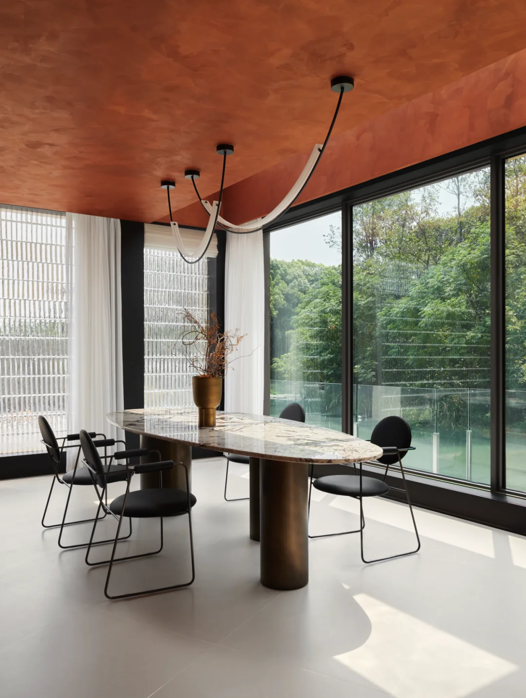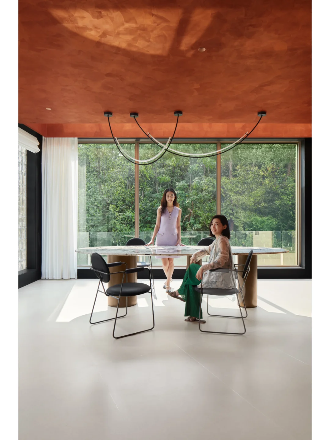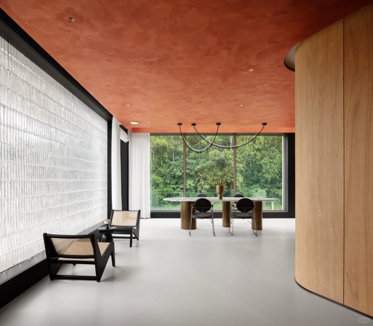 住宅的茶室、会客厅和餐厅充分纳入周围的森林景观,落地窗如同天然画框,让人在现代空间中尽情领略自然之美。