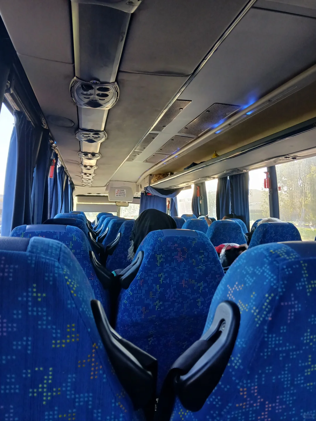 坐一整天还是挺难受的,特别是晚上!但是人数不多不少,基本可以一个人两个位置,车上主要是阿宝,有卫生间!有空调!也有一些阿宝们的味道和脚臭[满月R]