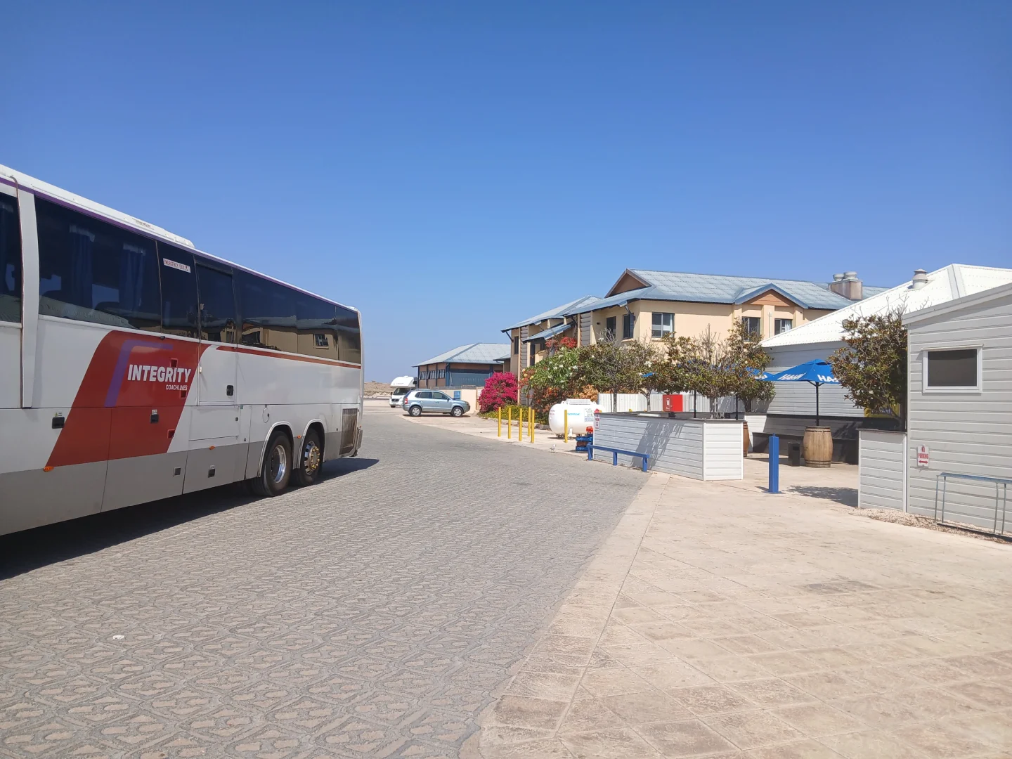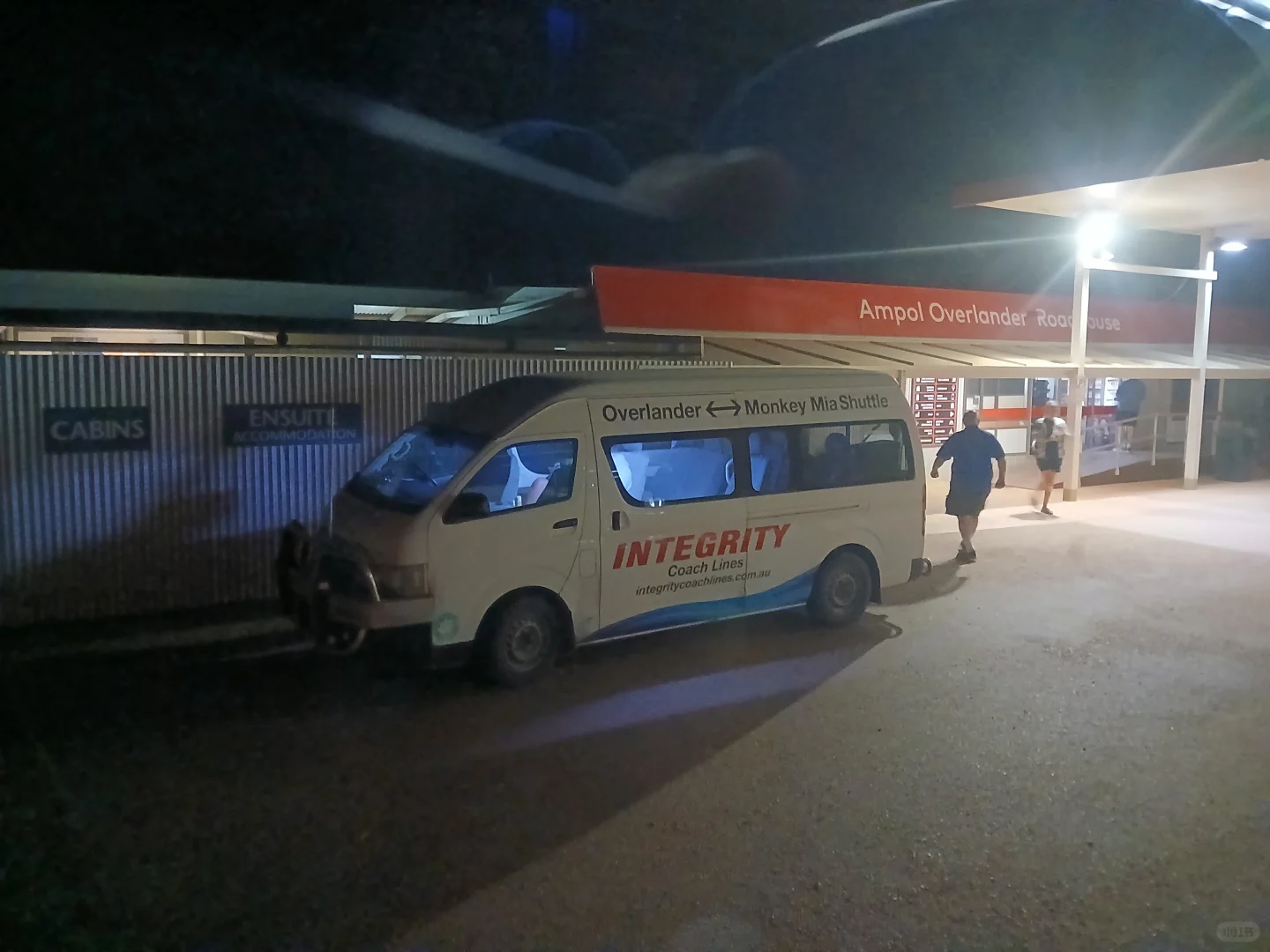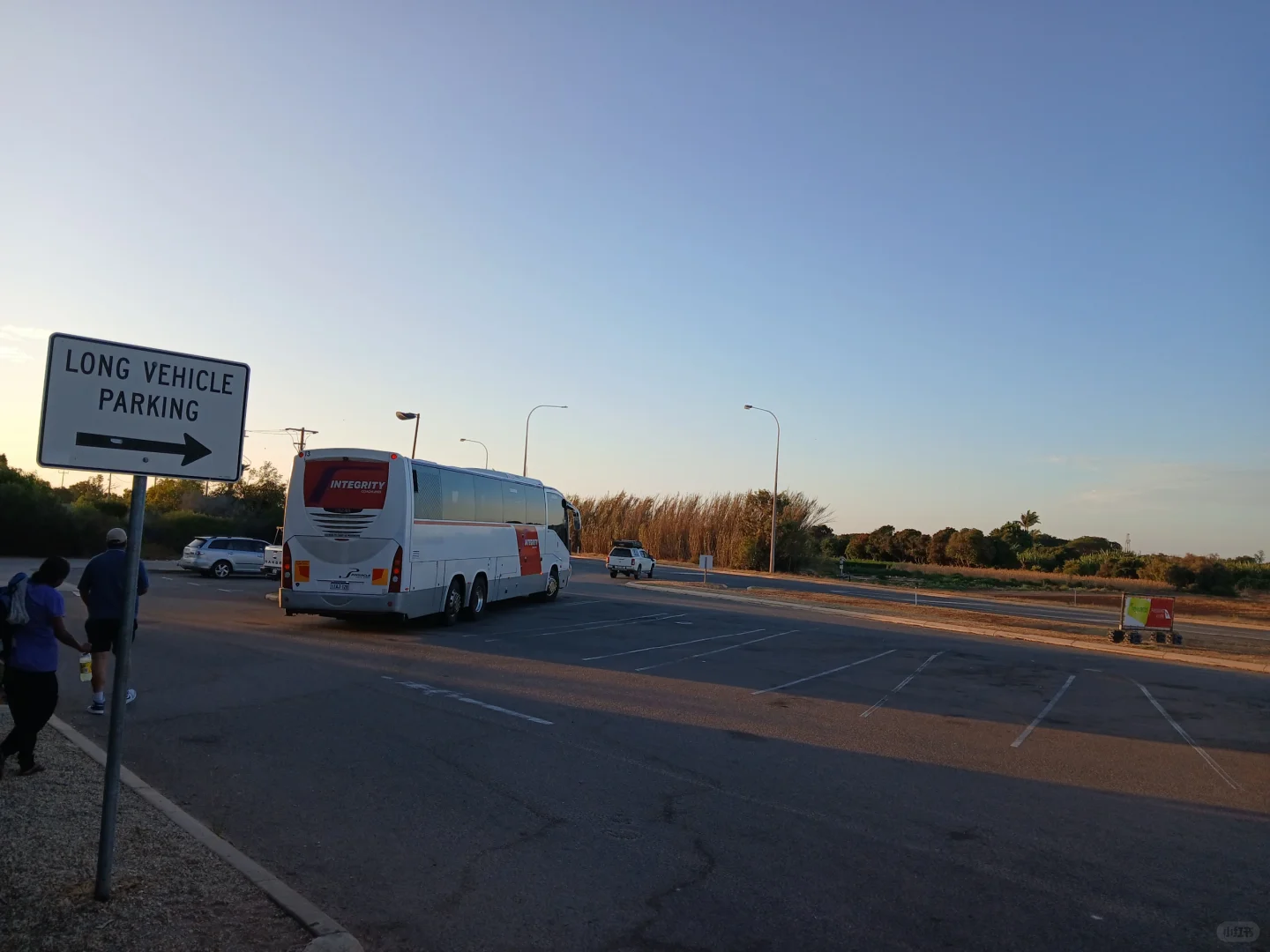 3.沿路会停很多站,每站25分钟,司机会提前说。比如刚开出去没多久,去一个加油站加油,所有人下车,停了25分钟。专门绕去Exmouth,停在IGA附近25分钟,去Coral bay的Yha附近又停了25分钟(图6),你可以中途有足够时间买吃的!晚饭时间停在了卡那封附近的bp加油站给半小时吃晚饭(图7)!之后到卡那封city停车半小时(图8),感觉卡那封上的人最多!晚上到去Shark bay的路口附近加油站,去Shark bay的人会换乘小面包车进去(图9),最终第二天早上6点不到就到达目的地珀斯东站!