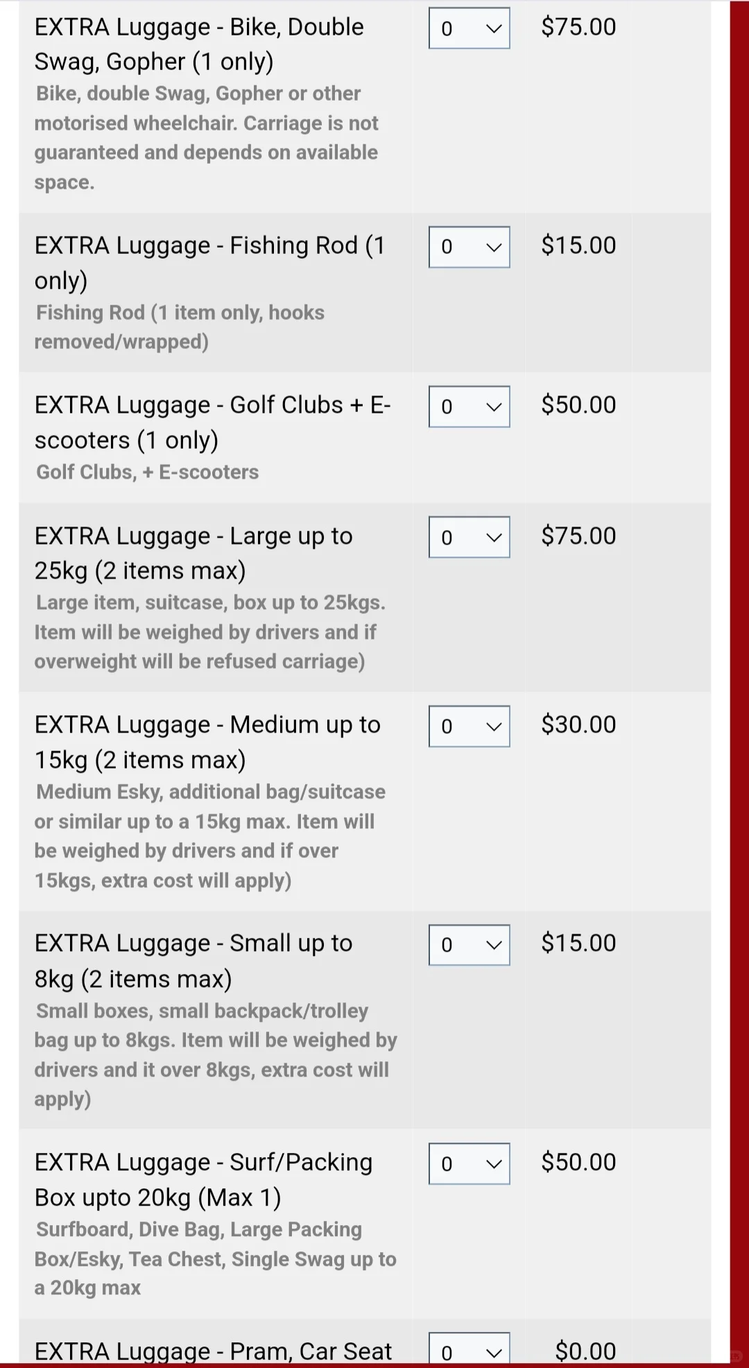 2.如果你有两件大行李,需要额外加行李额,但是最多只能➕一件大行李,总共两件!不同重量收费不一样(图2),虽然说司机会称重,15kg的30刀,超过15kg75刀,但实际上司机没有管的很严格,你只要不是太超重一般不会说,然后自己的8kg左右随身包可以带上车,不用额外买行李额!(tips:如果你和同伴一起坐车,同伴没行李,你多个行李,他的行李额可以给你用,不用也浪费了,可以和你同伴商量一下)