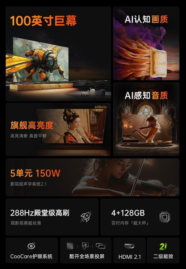 创维酷开100K3 Pro 2025款电视上市,各种优惠完后的到手价为5949元。这对于一款100英寸超大屏电视来说是非常划算的。 这款电视的分辨率为3840×2160,采用新一代背光灯珠,亮度达到470nits,最高支持288Hz超高刷新率,兼容144Hz/120Hz高刷。它支持AI认知画质,可以提供对比度提升、超级清晰度、色彩校准和动态增稳等功能,通过杜比视界、杜比全景声、HDR 10等认证。 此外,它配备5单元150W“影院级声学系统2.1”,支持AI空间声场校正、AI重低音增强、AI人声增强和AI动态音量均衡等功能。其标配4+128GB内存组合,预装酷开系统,支持AI智控桌面、全场景投屏(影视App、安卓手机、苹果AirPlay、HDMI)等功能。