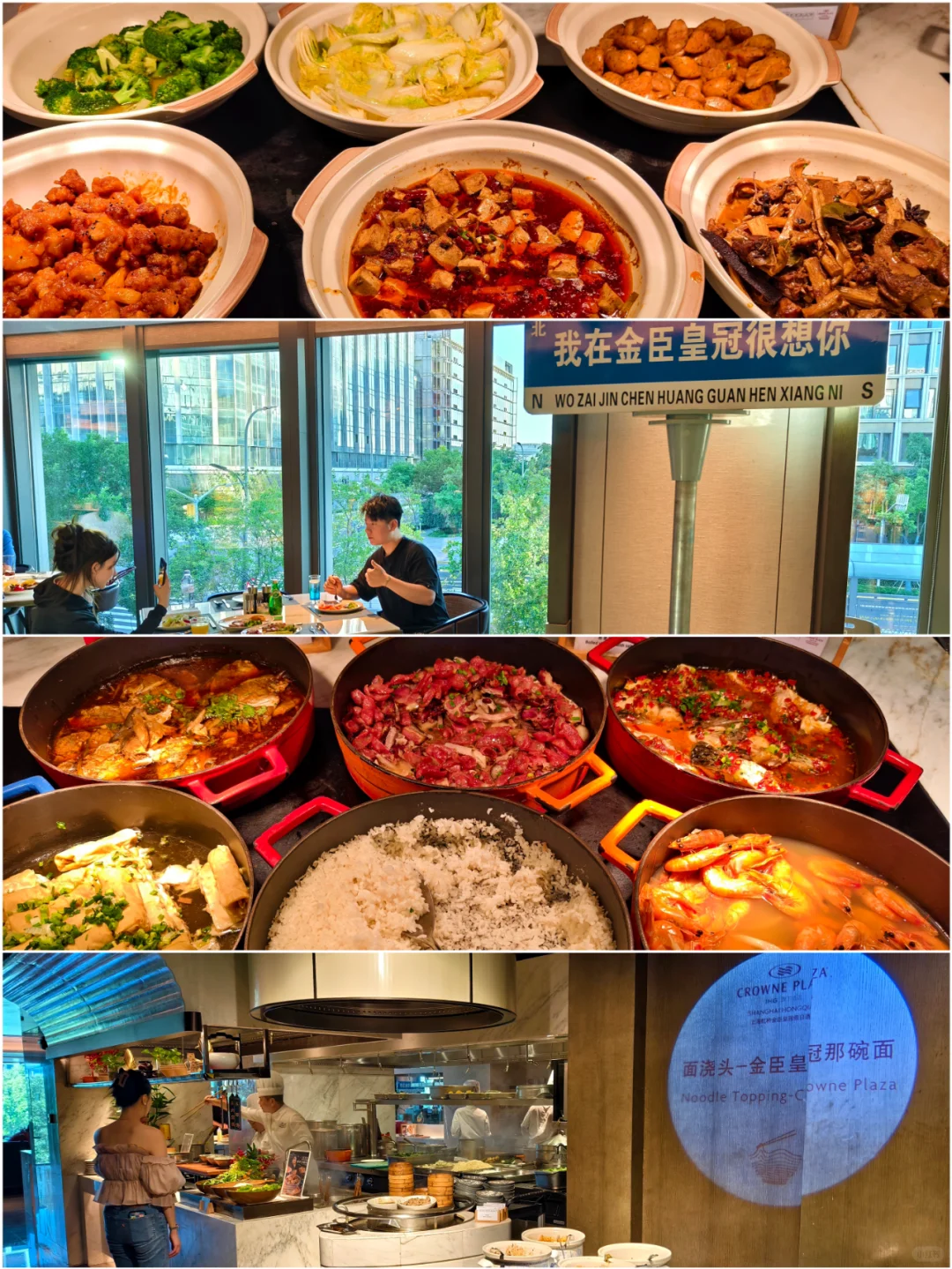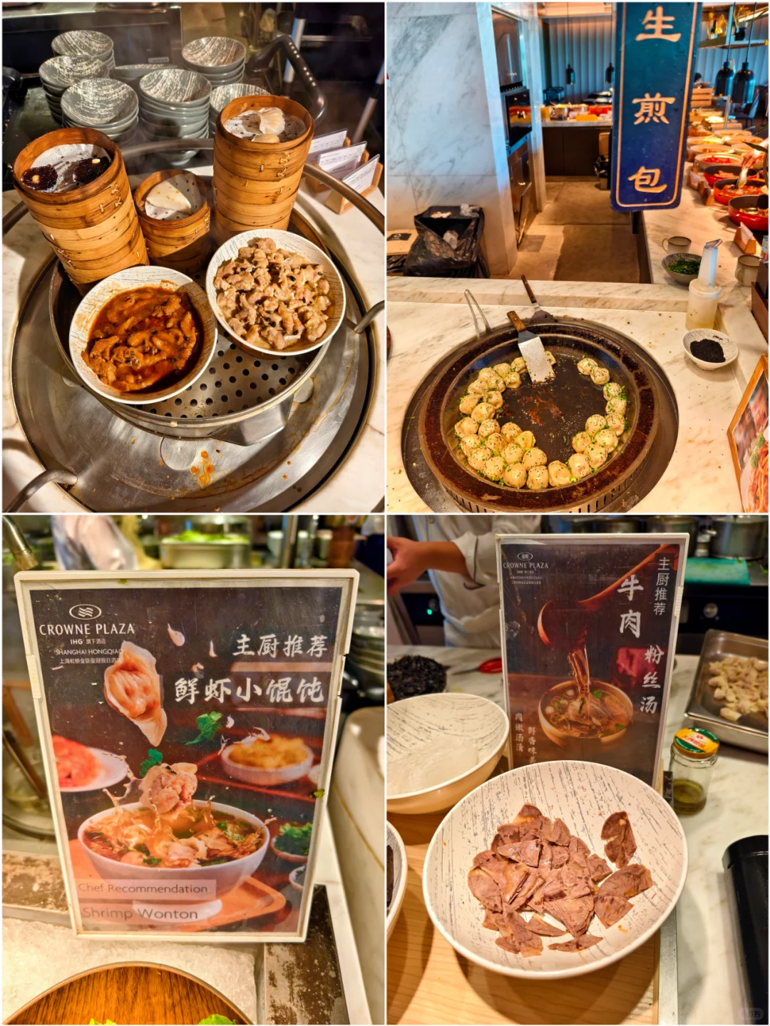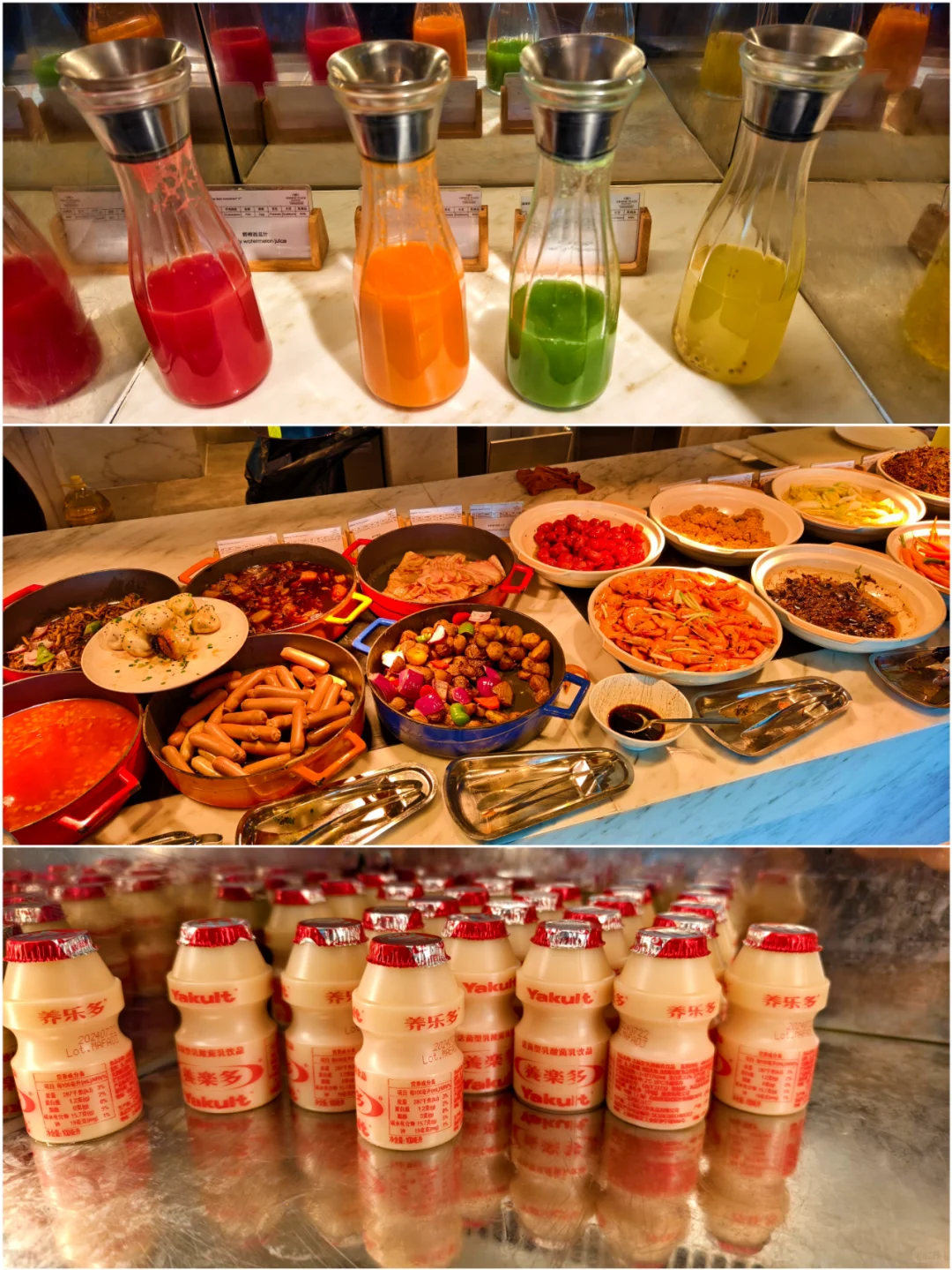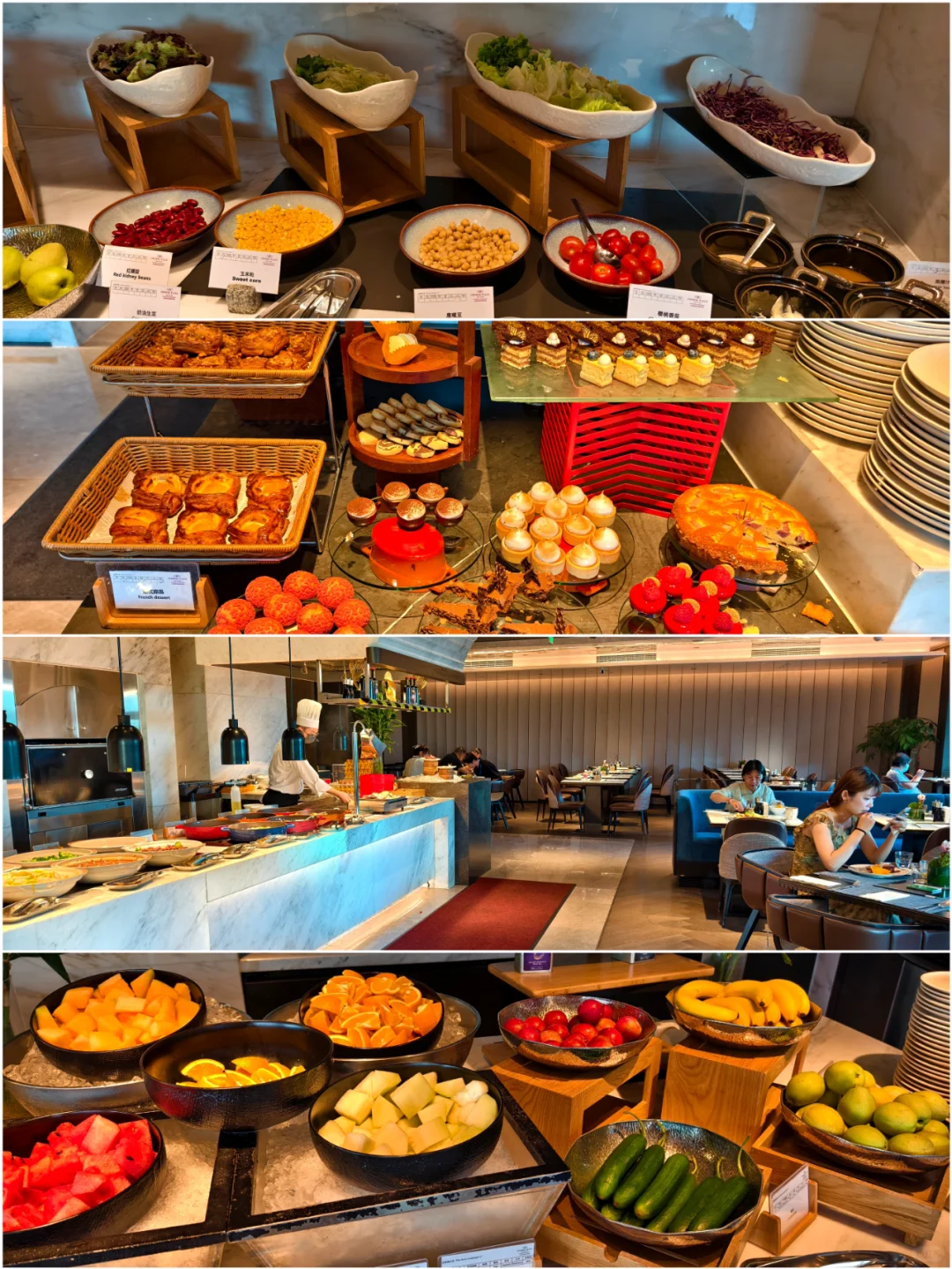 自助早餐 6:30-10:30 :有鲜榨果汁,生煎包、牛肉粉丝汤,还有虾饺等广式蒸点,有水煮虾等很多热菜。依云、巴黎水和养乐多依然畅喝。( P16~P17 )