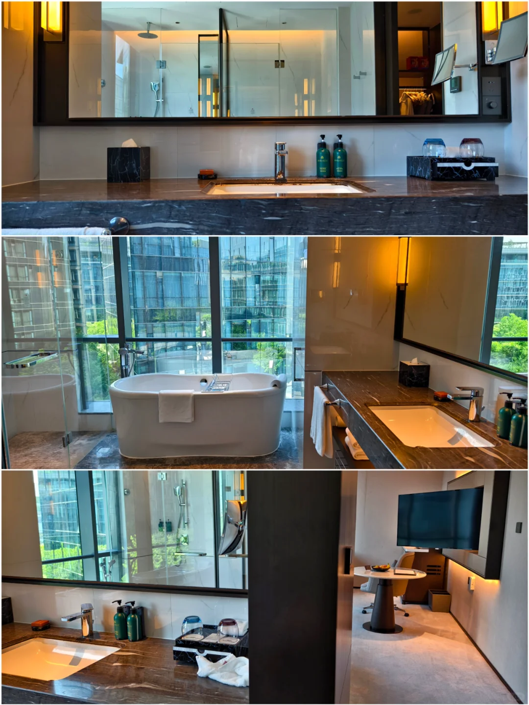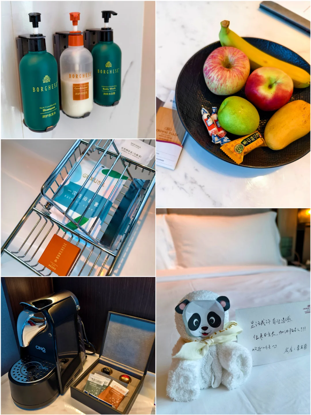 定的标准房,给到了全景大床房,房间看起来比较新,卧室和卫生间都有大大的落地窗,所以显得很通透明亮。minibar有胶囊咖啡机,床上放了欢迎卡和一只毛巾折叠的熊猫,只是熊猫脸是贴的一张纸,有点搞笑。卫生间浴缸还配了浴缸套。( P2~P4 )