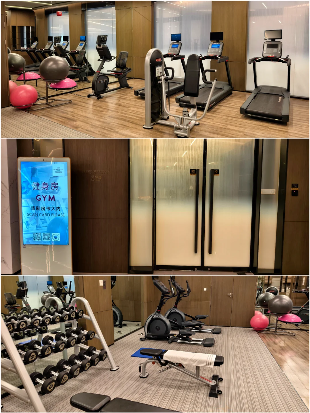 健身房在B1楼,没有游泳池。这家没有泳池属于美中不足,毕竟隔壁的凯悦嘉轩都有泳池。(P18)。