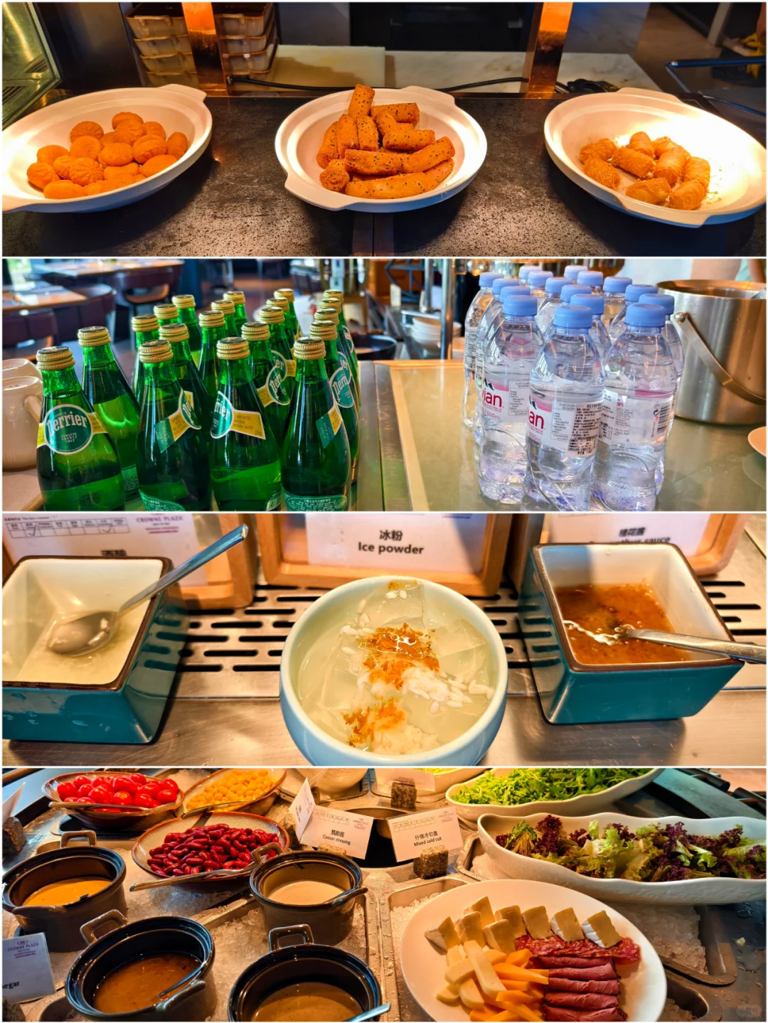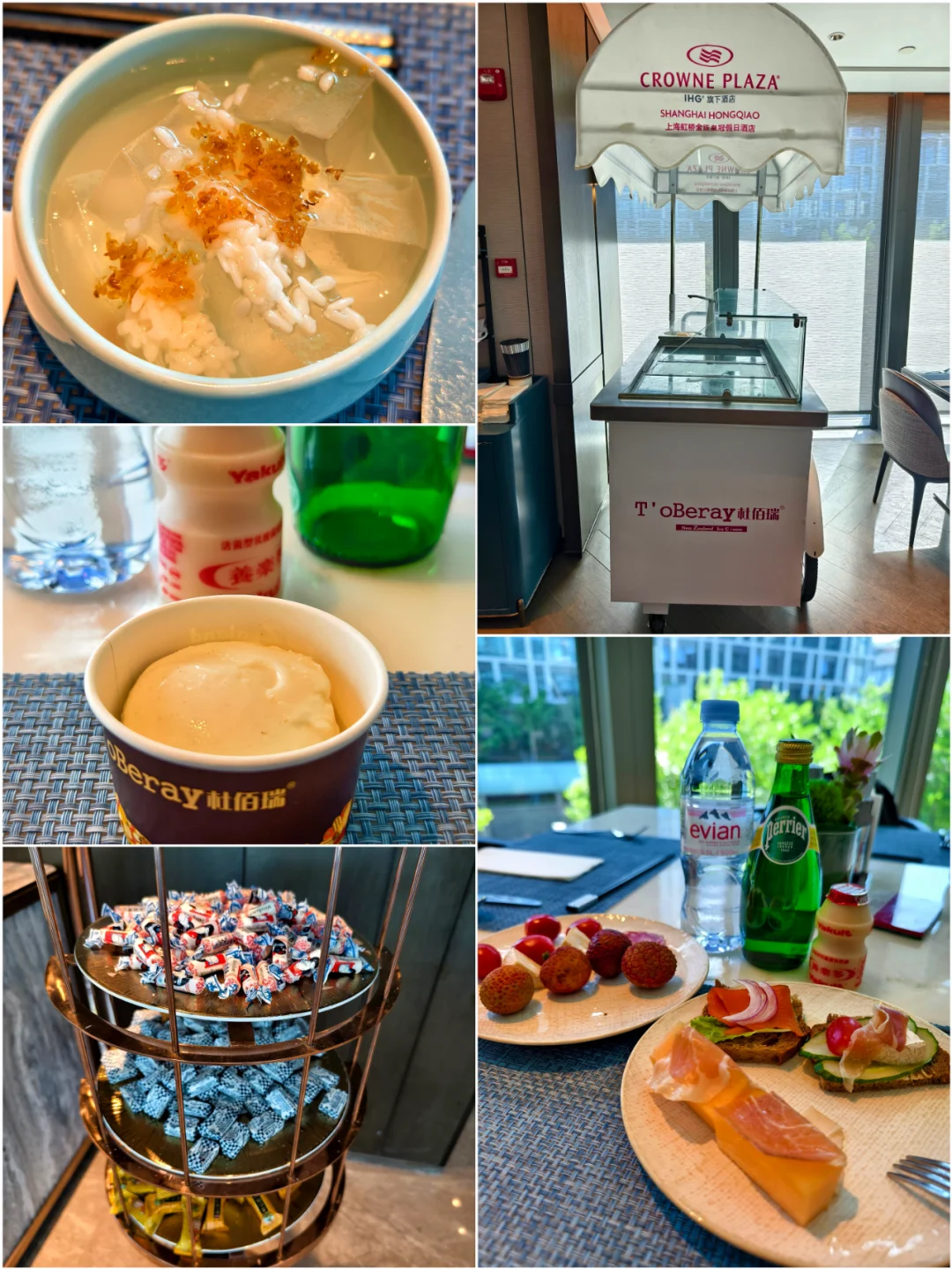 下午茶 14:30-16:30:各式甜点、咸点,多到眼花缭乱,有烟熏三文鱼、火腿蜜瓜等等,相当的丰盛,依云、巴黎水和养乐多畅喝,巴黎水还是玻璃瓶的。还有冰淇淋也是畅吃。居然还有冰粉,配了酒酿和桂花蜜。( P5~P8 )