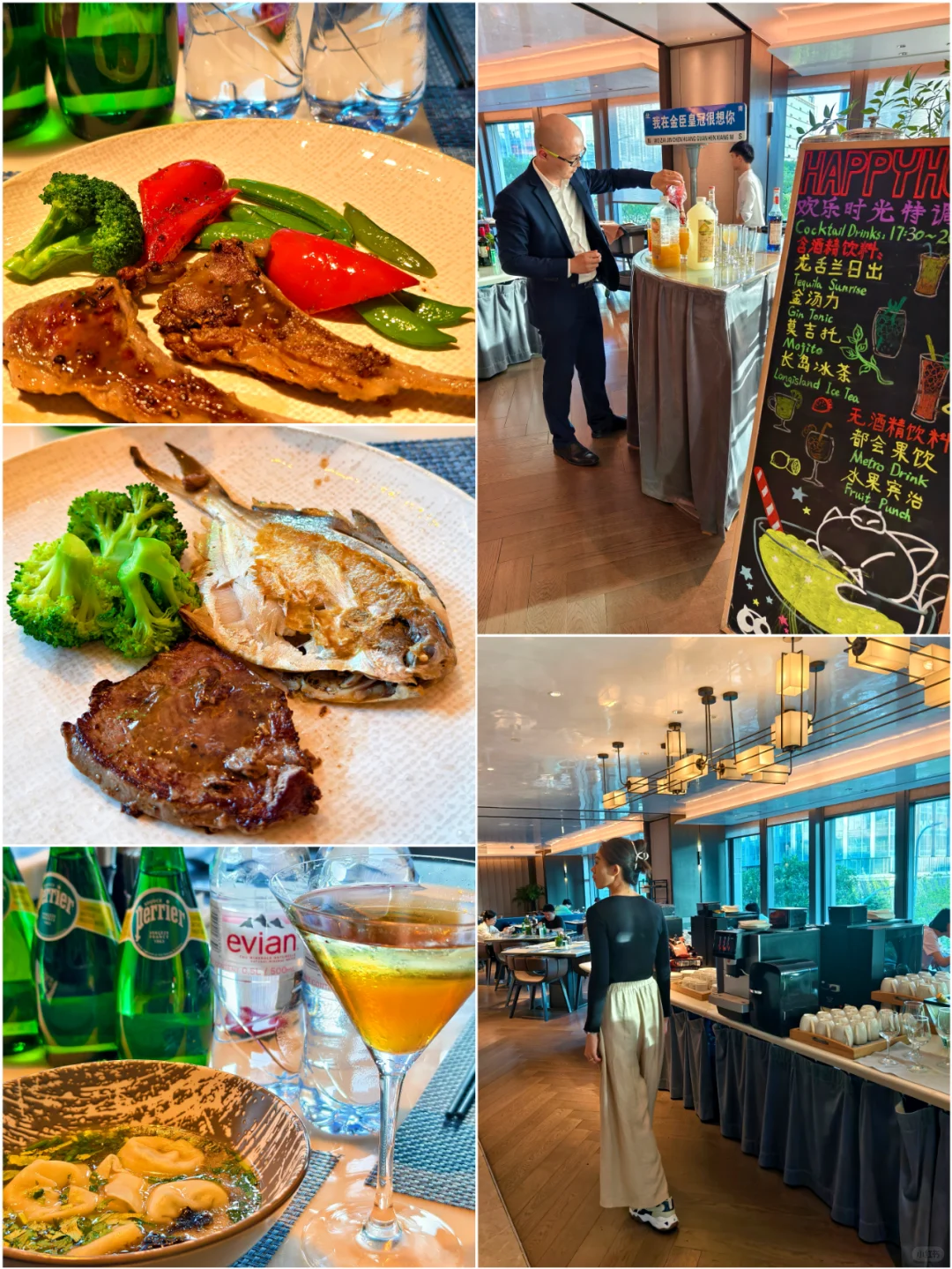 欢乐时光 17:30-20:00:调好的多种鸡尾酒,虽然调的不是很好看。有现煎小羊排、牛排、鲳鱼等等,热菜好多款,还有面档。依云、巴黎水和养乐多依然畅喝。( P9~P15 )
