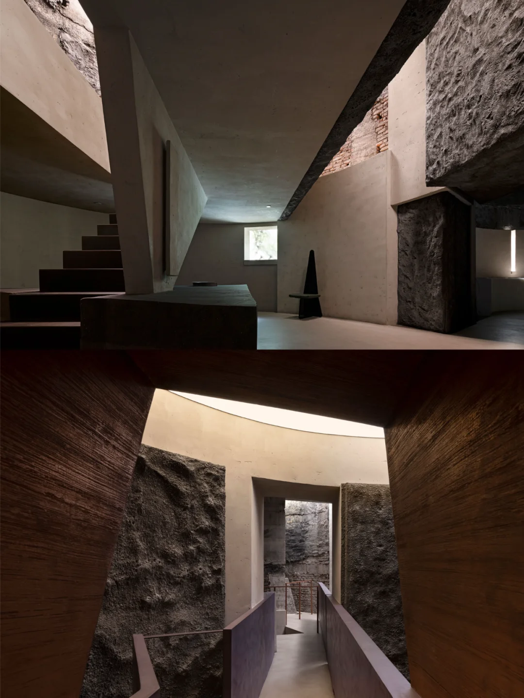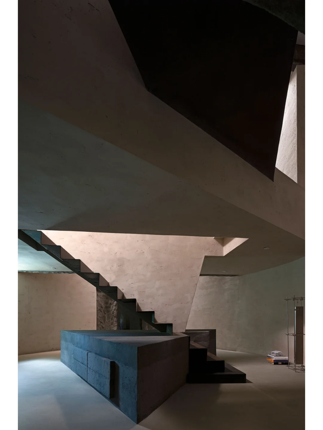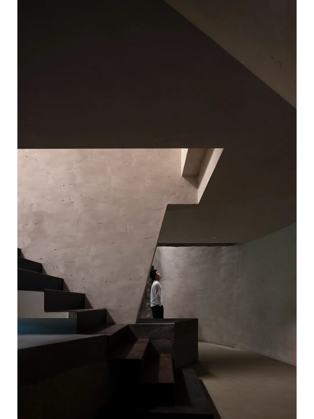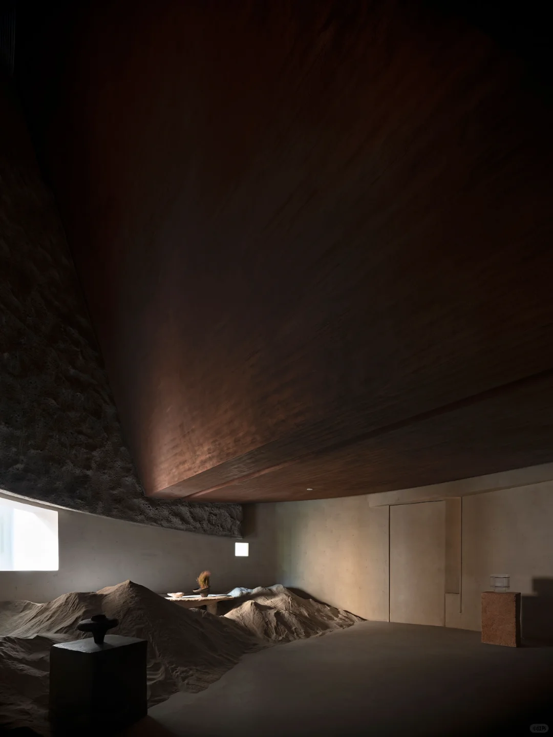 结合场地肌理,秉持现代主义的纯粹性延续时间与人文,寻找自然沙土的本源,谢培河创作了一个充满情感记忆的材料艺术创作中心。室内设计延续建筑的力量感,有分量的形体组织与强烈的材料刺激,以表现空间张力与想象空间。