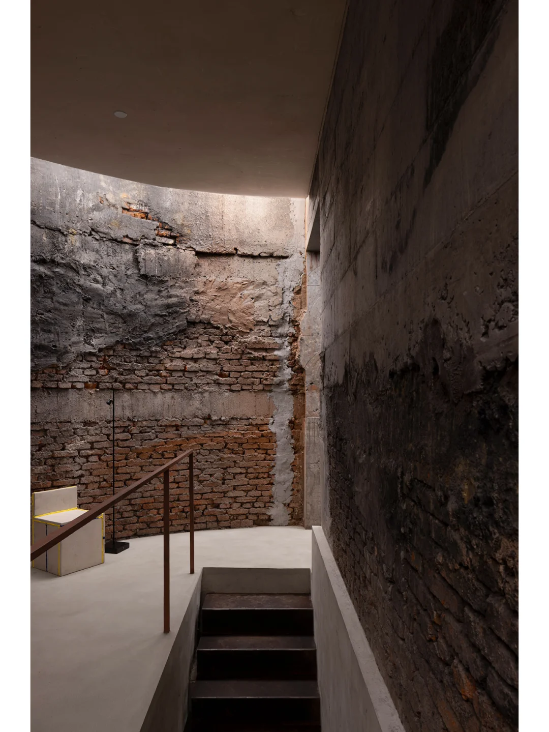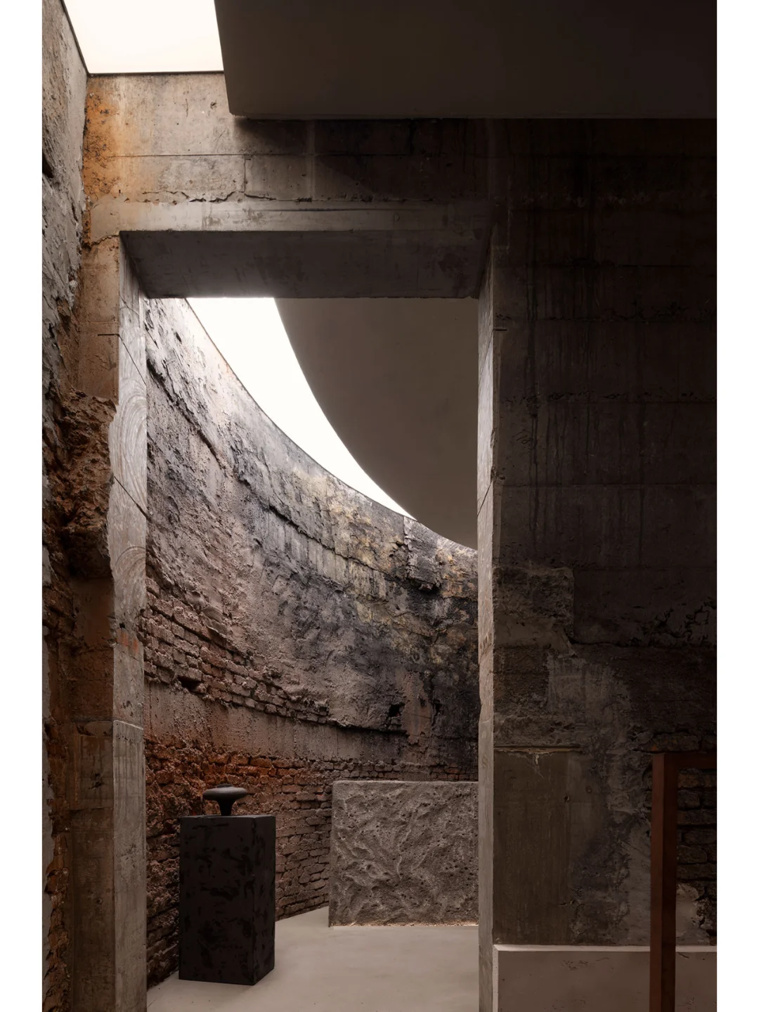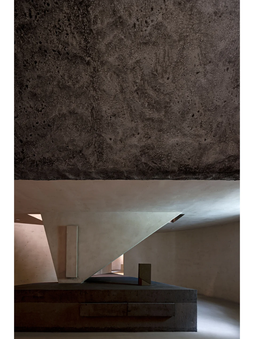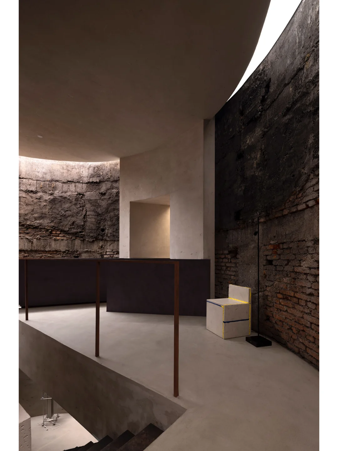 结合场地肌理,秉持现代主义的纯粹性延续时间与人文,寻找自然沙土的本源,谢培河创作了一个充满情感记忆的材料艺术创作中心。室内设计延续建筑的力量感,有分量的形体组织与强烈的材料刺激,以表现空间张力与想象空间。