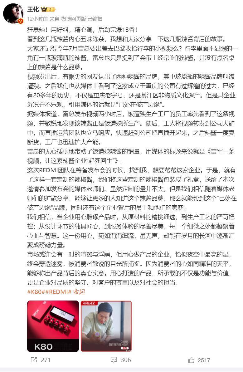 奇了怪了,我都纳闷了 本来还觉得红米K80pro明明海报上说的是骁龙8Elite,而且还是6000mAh电池+120瓦快充+50瓦无线,这些已经是大招了。但是现在看来还是我肤浅了,主要是雷军的格局。关键是你看吧,他完全没有拿出台面上来说,做好事不留名这才是低调和内敛。因为红米K80pro今天发布会邀请函上了热搜,分别是5瓶辣酱,都觉得只是描述K80pro的,太低辣,太稳辣等...但是实际上根据xiaomi高管所说,事情起因还得从雷军说起来 1:早在7月份的时候,雷军把自己准备出差去巴黎,准备行李箱的这段过程,视频分享出来了。眼尖的网友就发现雷军的行李箱里面有一瓶辣椒酱。雷军只是说自己去国外会带,没有任何品牌,甚至镜头就是一扫而过也没有特写,但是眼尖的网友发现了,名字叫做饭遭殃 2:本身这是个就是重庆綦江非物质文化遗产,老字号了。濒临破产,但是在雷军把视频发出去两个小时之后,竟然救活了过来。本身这个企业看到雷军的视频之后,也赶紧把直播开了起来,最后辣椒酱卖断货了 3:根据小米高管所说,这次REDMI团队在筹备发布会的时候,突然找到他,想要帮棒这家企业,所以才有了现在发布会邀请函的五瓶辣椒酱的故事 客观点来说,雷军的格局了不起。之前在采访的时候,他就说过xiaomi最痛恨的就是品牌溢价。所以你看小米的企业文化或者是说坚持的,就是让全球每个人都享受到科技带来的快乐。所以你看xiaomi手机的性价比初心,其实从来没有变过。 而这次的K80pro,我觉得也是一种暗示。坚持做自己,从来没有被竞争对手打乱自己的节奏。其实你看吧!除了续航快充,电池和无线充电之外。K80pro还用上了超声波指纹,小米龙晶玻璃2.0和小米15pro同款,还有超声波指纹,以及小米星辰通信,包括IP69防水防尘等级。其次要知道这回6000mAh的电池容量,用的也是金沙江硅碳负极材料的电池。 关键是细节,1.9mm 超窄下巴,小米15同款的内走线方案,不仅是黑 边变窄,而且中框也用上了高强度的材料以及圆润设计,50:50配重,不会出现头重脚轻的感觉。最主要是屏幕是2k分辨率,加上圆偏振光技术护眼技术,超声波指纹。这样的机子要真是价格不超过4千,一机难求也说不定。大家怎么看