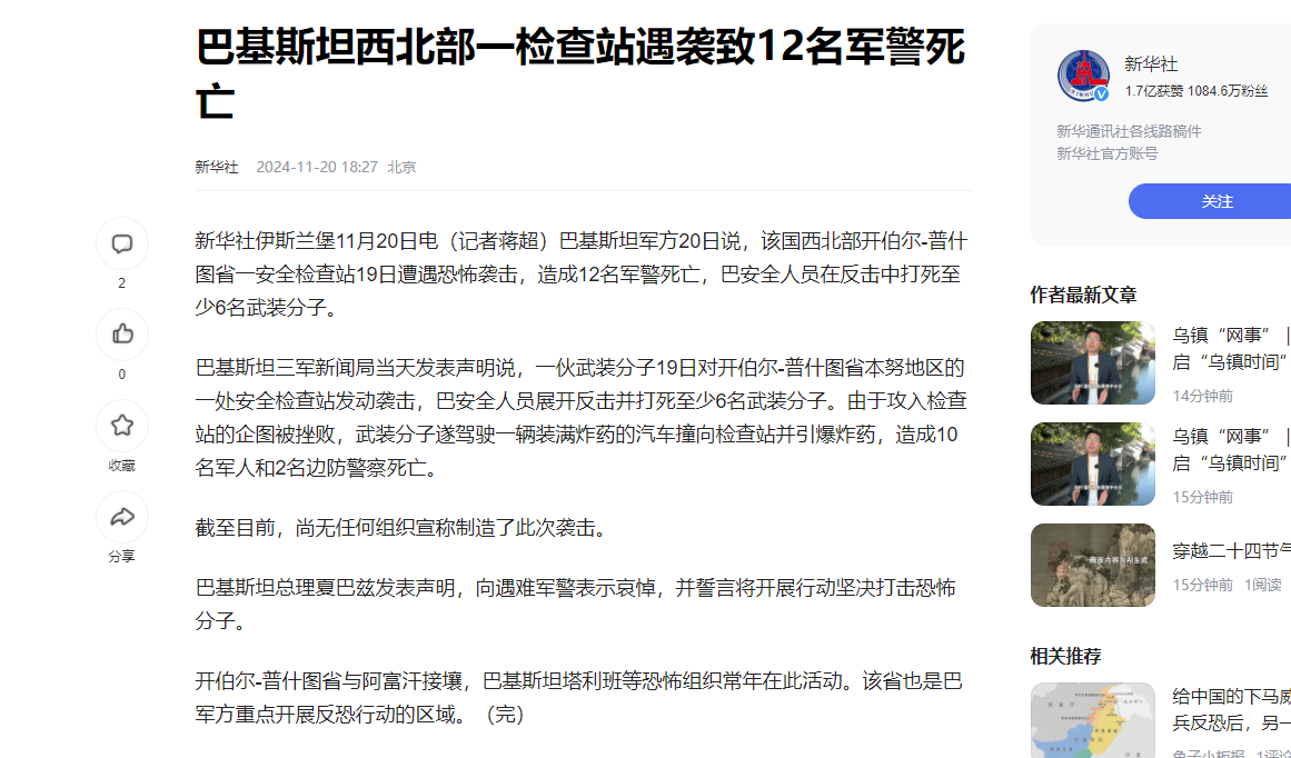 据悉,这场袭击中,共计12名巴基斯坦安保人员阵亡,反击中也击毙了六名恐怖分子。