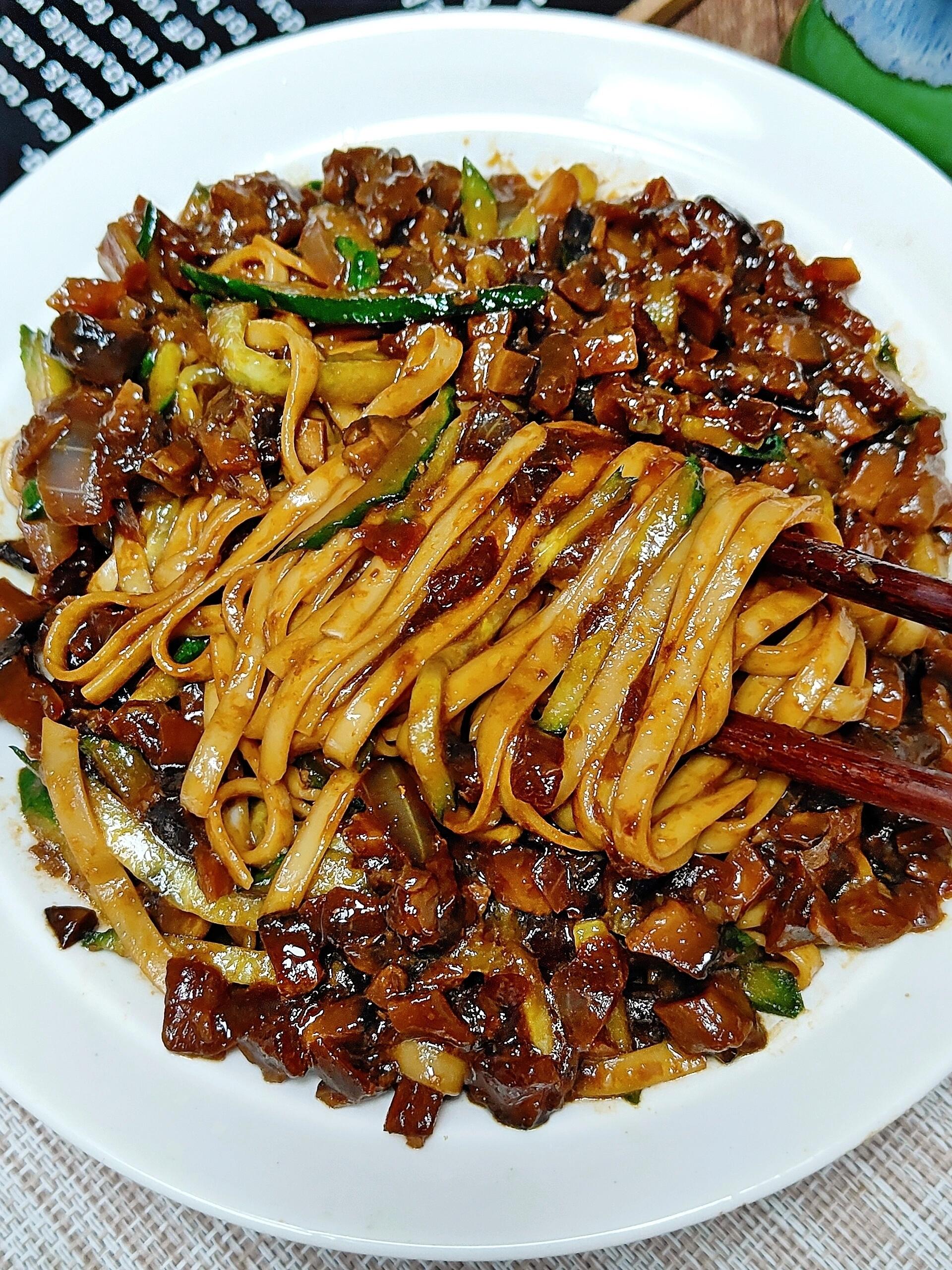 巨好吃的素炸酱面做法,绝了‼️ 素炸酱面这么做太香了,根根面条裹满浓郁的酱汁,搭配清爽的黄瓜丝,好吃到舔盘~ 食材: 面条,洋葱,香菇,黄瓜,蒜末。 做法:1、调个酱汁:3勺黄豆酱➕3勺甜面酱➕少许糖➕3勺生抽➕1勺老抽➕半碗清水调匀,黄瓜切丝、洋葱和香菇切丁备用。 2、热油炒香蒜末,放入洋葱香菇丁煸炒出水分,倒入调好的酱汁煮开后熬至粘稠。 3、面条煮熟过凉放入碗中,浇上炸酱,放入黄瓜丝拌匀即可。