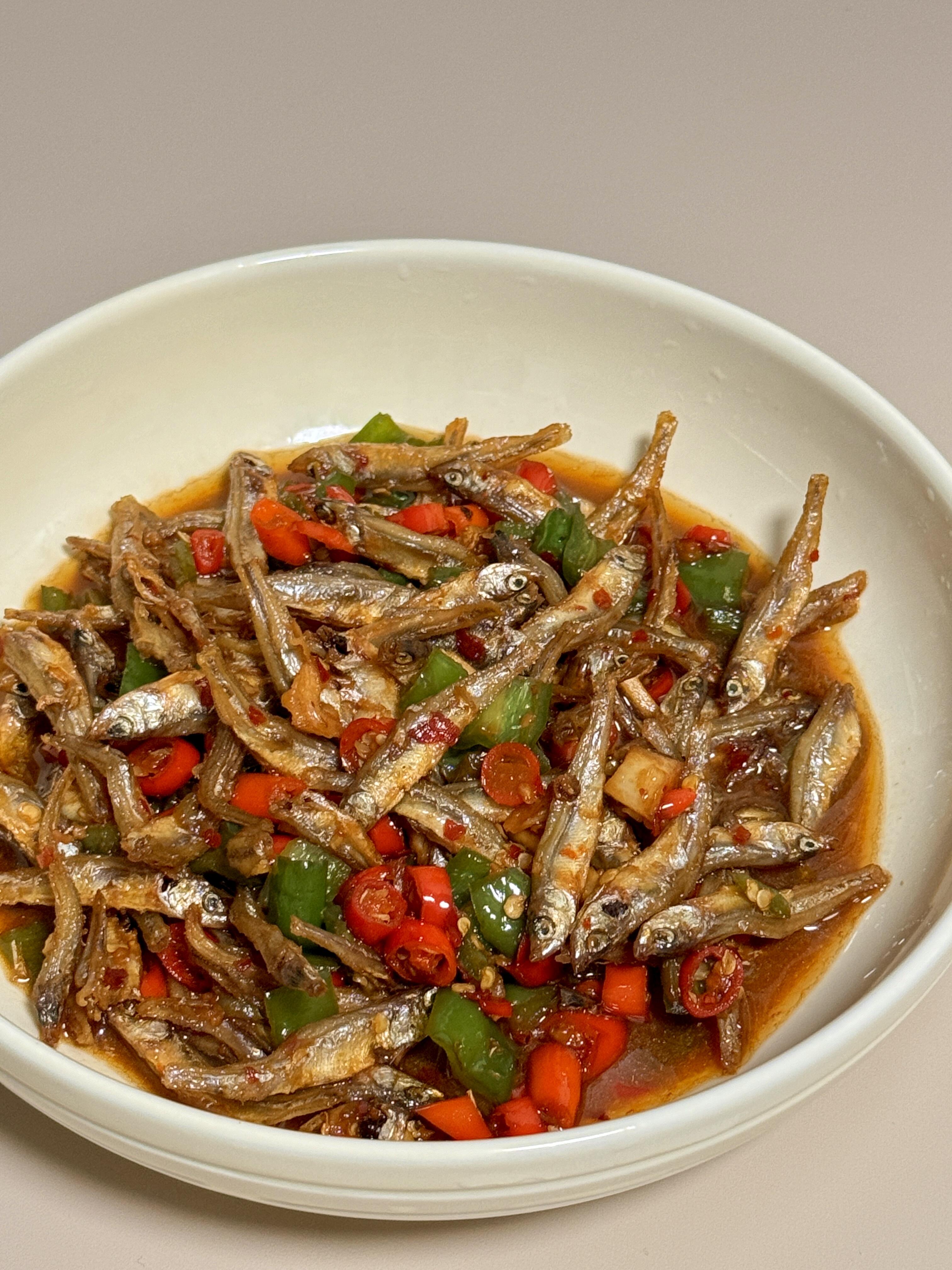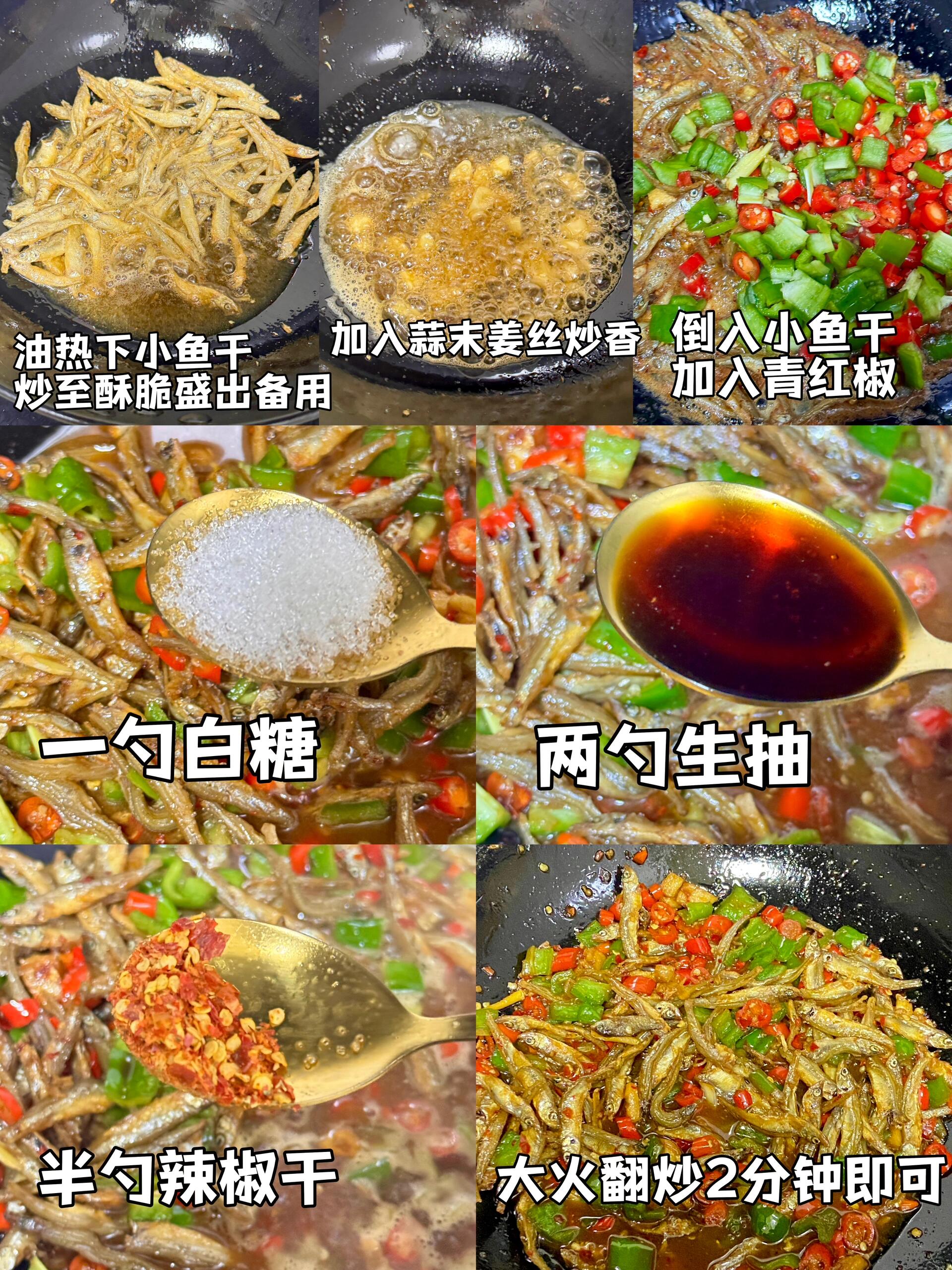 家常菜|越吃越上头的香辣小鱼干,超级过瘾 小时候不爱吃的菜长大后一个也拒绝不了,果然人人都逃不过真香定律呀~~~~ 食材:小鱼干,青椒,小米椒,姜丝,蒜末 做法: 1.将小鱼干温水泡10分钟捞出洗净 2.油热下鱼干炸制酥脆盛出备用 3.加入姜丝蒜粒炒香,倒入鱼干,小米椒,青椒翻炒 4.一勺白糖,2少生抽,一勺辣椒面大火翻炒2分钟即可