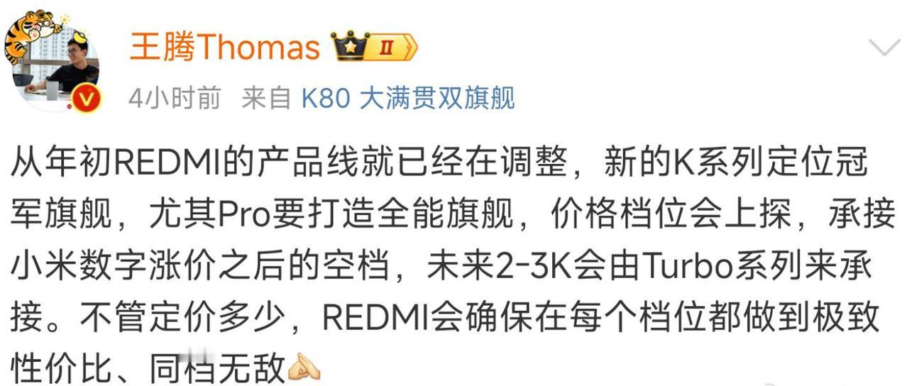 奉劝各位一句,K80系列可能是最后一次2499啦!其实当雷军允许卢伟冰说出来这段话的时候,就已经摊牌了,意思就是说xiaomi手机高端化越来越成功,会用更先进的科技,然后突破更高价位段,也就是涨价。而红米Turbo原来的价位段都是1899,1999起步。现在会突破2k价位段取代现在的K系列。而K系列继续往上突破 怎么说呢!珍惜眼前吧,至少目前K80还算是王炸,标准版就直接用6500mAh+90瓦无线+骁龙8Gen3处理器+金属中框+龙晶玻璃,IP69方式,颜值也承接了CIVI的设计。大家怎么看