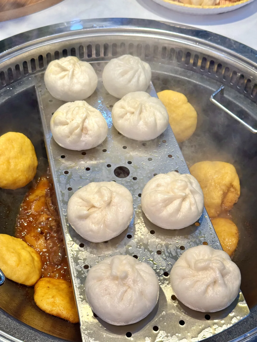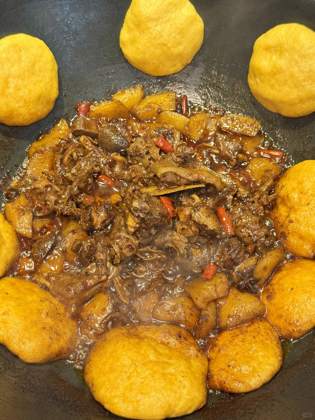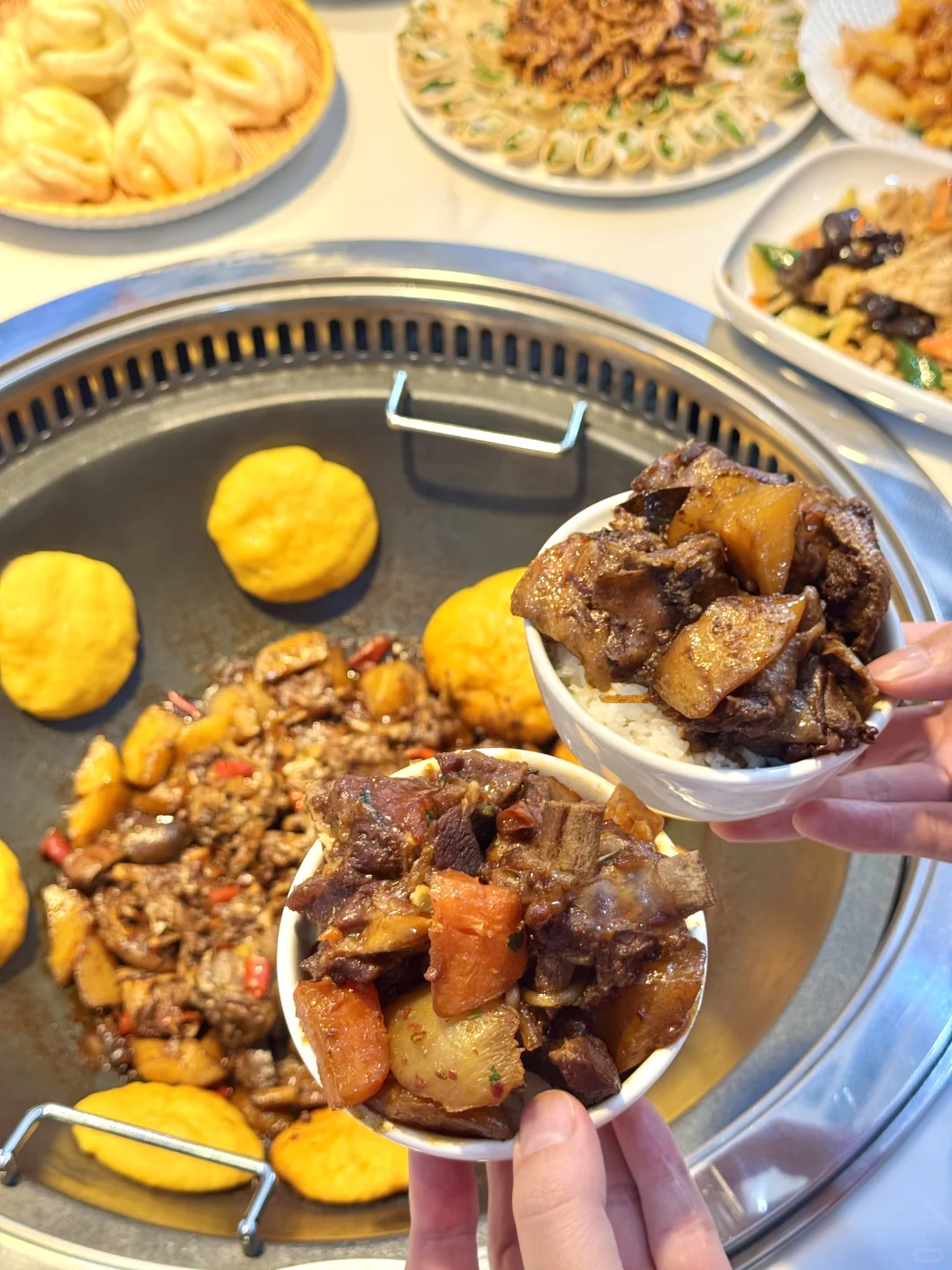 铁锅炖是招牌必点‼️这次家里人多点了炖大鹅和钝羊排🐑羊排超大一坨 炖得软烂入味 大鹅也特别鲜香 肉质细嫩不柴 而且份量超足!这品质和份量在曼谷真的是没有对手!他家的面食也是让我很惊喜‼️因为在曼谷很难能吃到手工现包的饺子和包子 酸菜馅和韭菜鸡蛋馅的都好好吃!