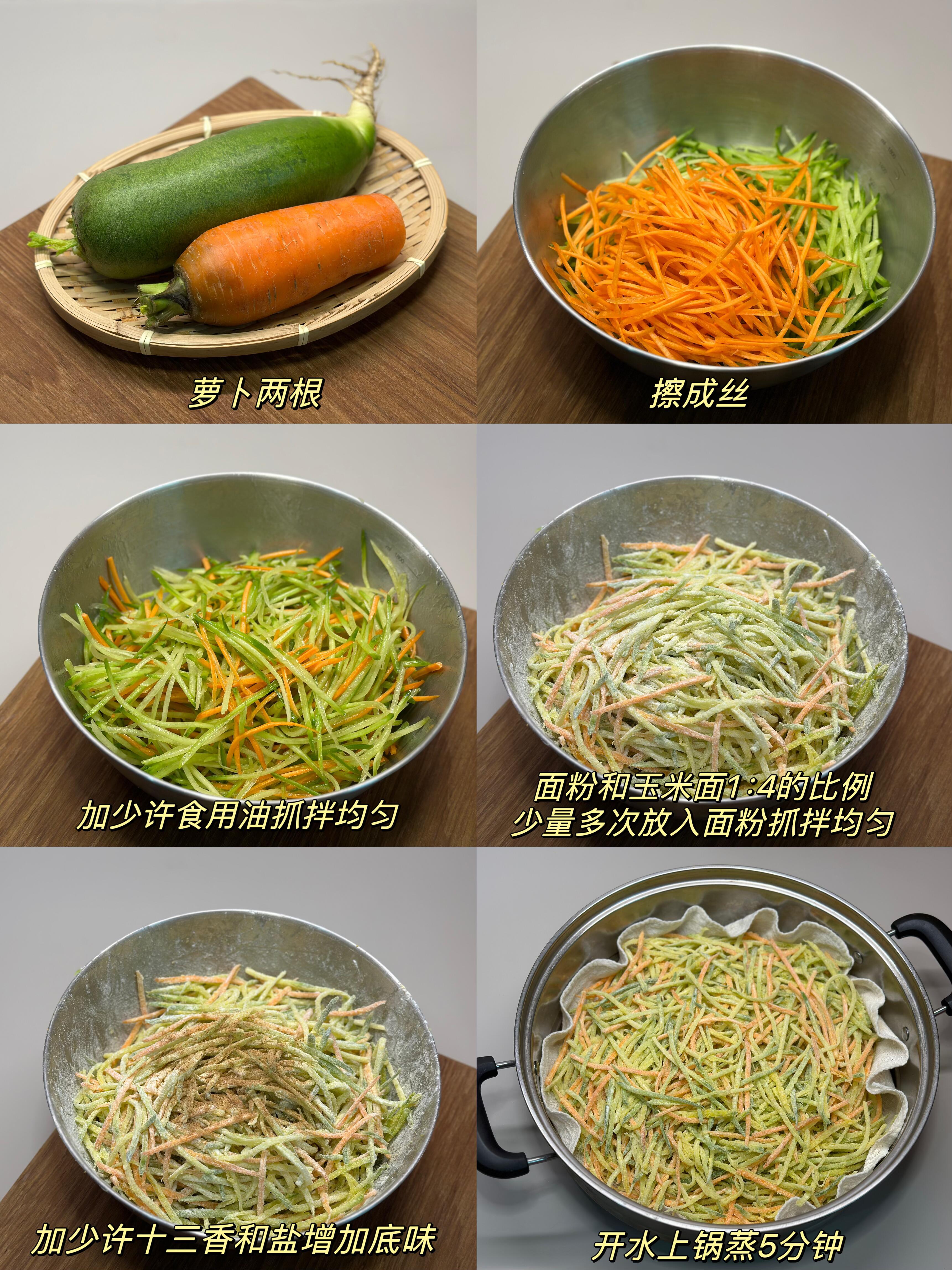蒸萝卜真好吃 太喜欢吃蒸菜了~五块钱买了三个绿萝卜,搭配家里剩下的胡萝卜一起蒸着吃,蒸完的萝卜丝蘸着蒜水辣子,一吃一个不吱声!超级美味,而且低脂又健康~ 炒着吃就是萝卜不烂子!搭配洋葱鸡蛋青椒,无敌了!答应我一定要试试! 萝卜蒸菜的做法和炒不烂子的做法很简单,都在图上~ 两个小tips: 萝卜丝多的话,可以每次取少量萝卜,少量多次拌面粉直到每根萝卜都沾上面粉,同时适当加点玉米面可预防粘连,达到根根分明的状态 蒸萝卜时不要铺的太厚,不然容易积水导致发黏