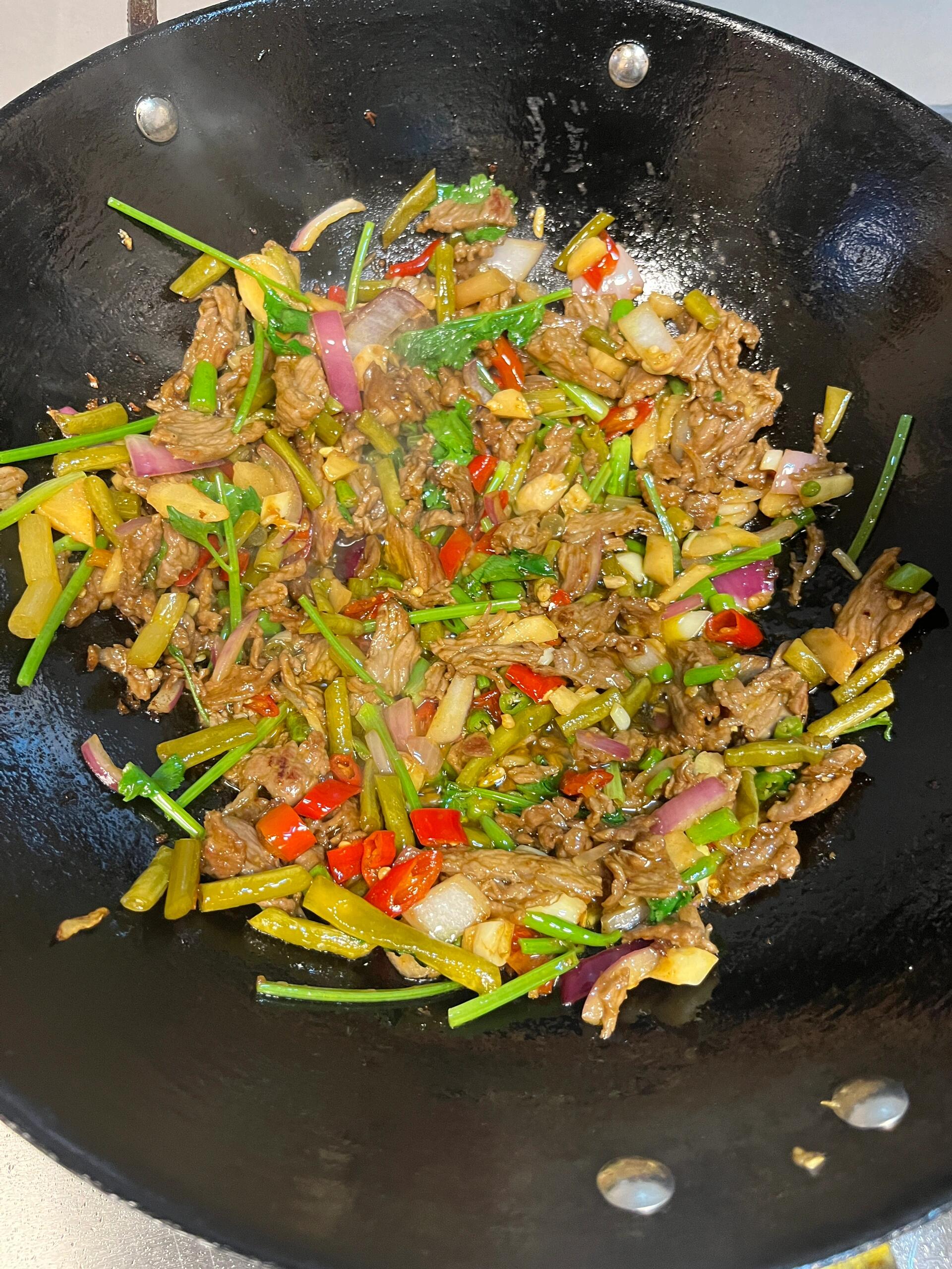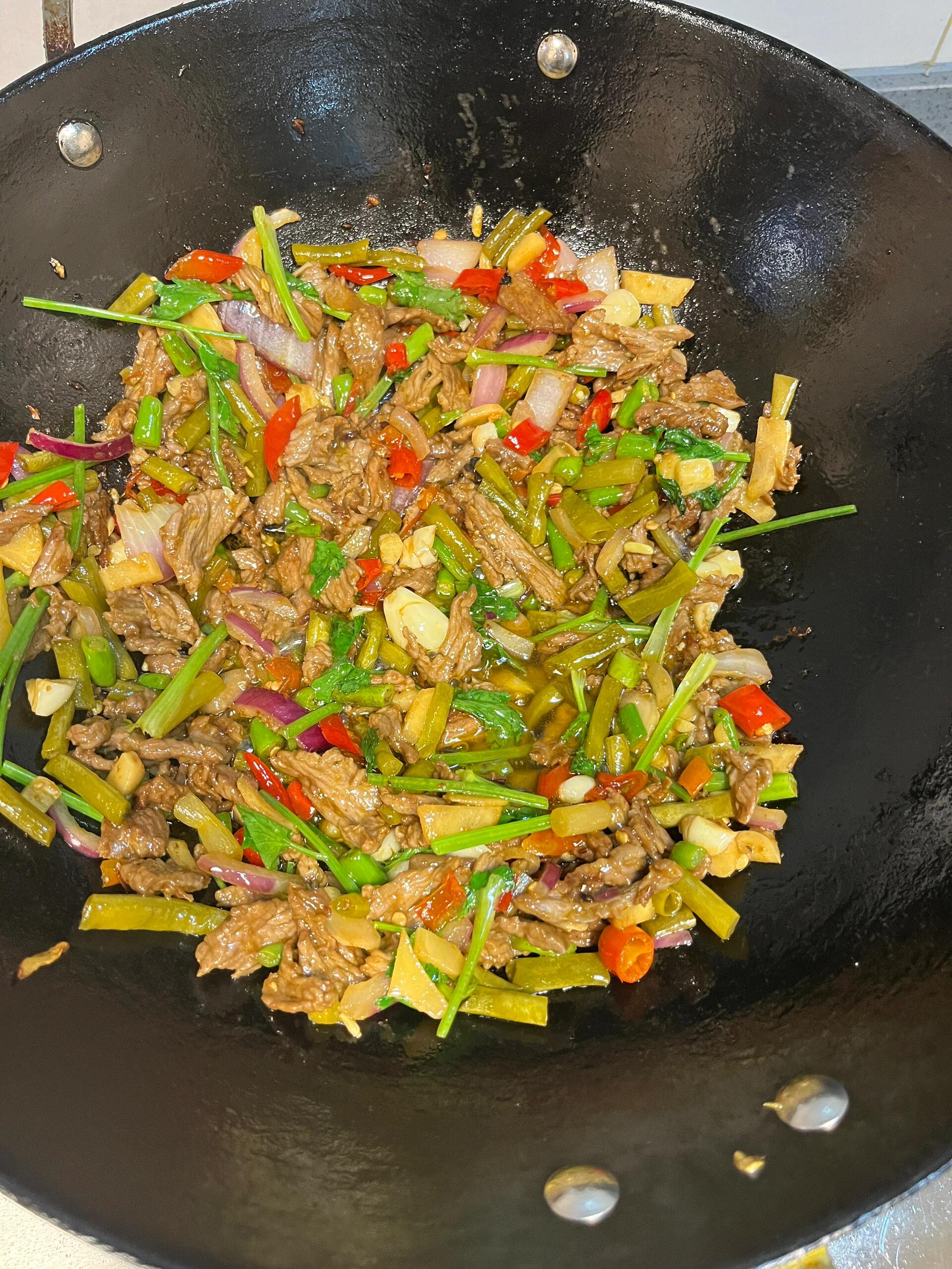 泡豇豆炒牛肉,真的好入味啊!!! 又是嘎嘎下饭的一道菜 做法: 1、牛肉加淀粉、老抽、蚝油、胡椒粉、食用油抓匀腌制 2、牛肉下锅滑散至变色后盛出,油热炒香姜蒜辣椒、洋葱、泡豇豆,然后放牛肉炒入味 3、放生抽、盐、花椒油调味,加入香菜翻炒几下即可 香香辣辣超级开胃,真的太好吃啦!