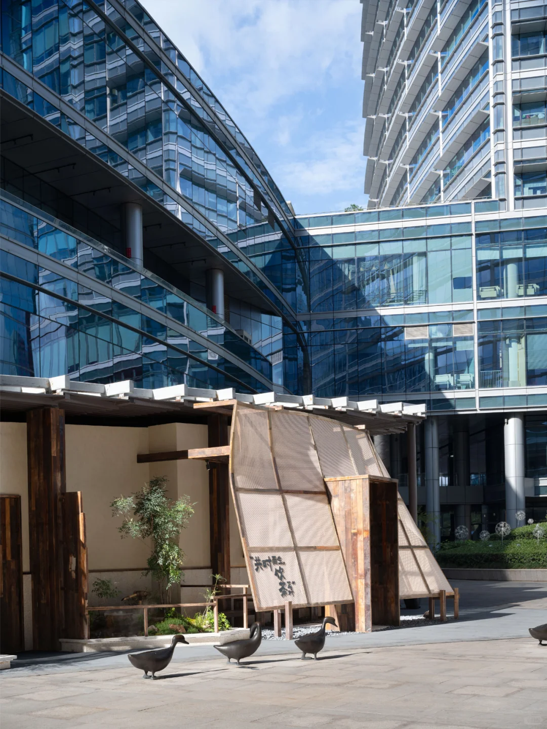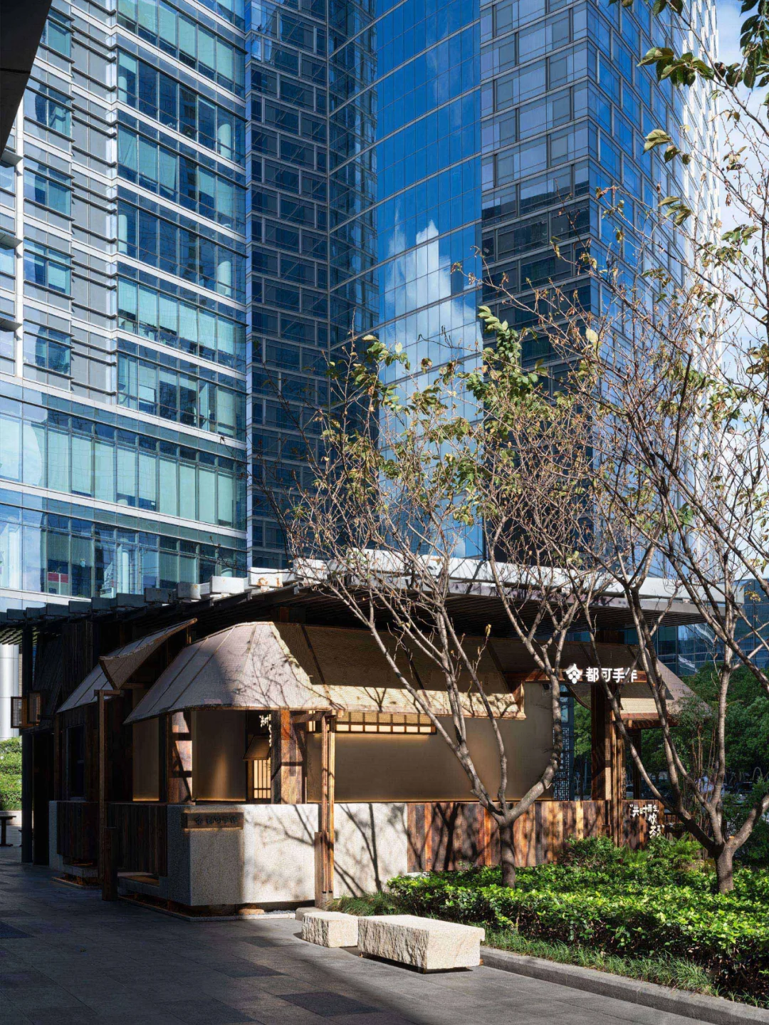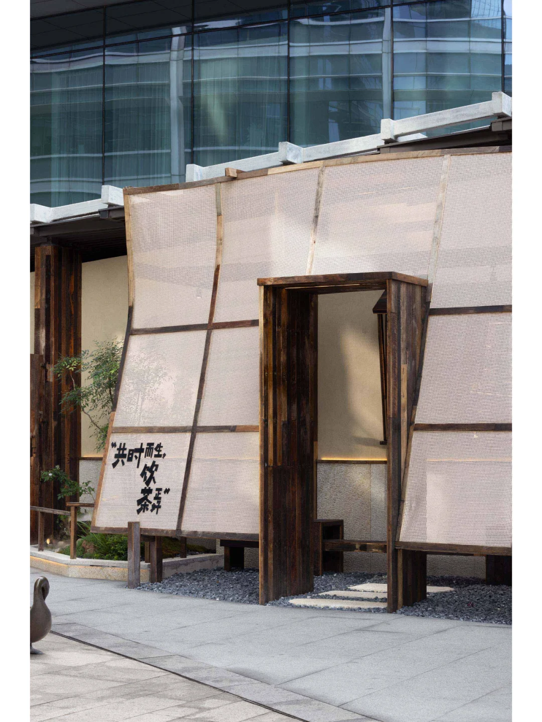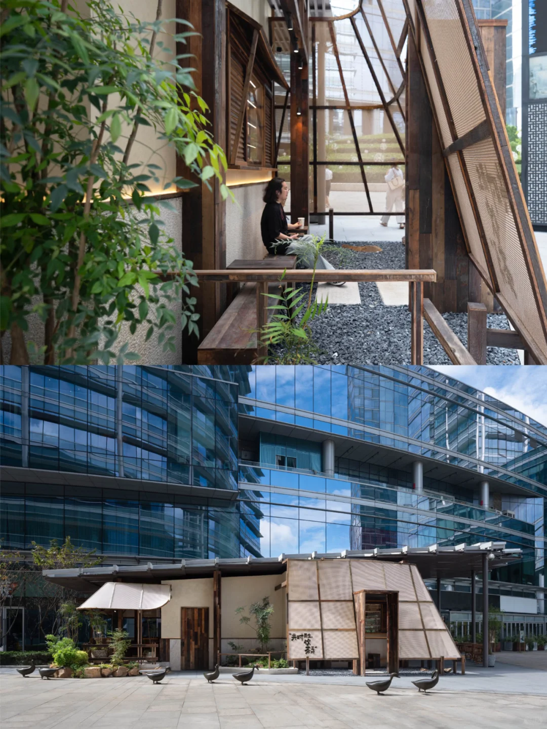 建筑主体伫立广场之上,以多元复合的空间形态寻访古朴意蕴。店面设有多个入口,因仿茶亭之意,实则内外相连,予人沉浸环境般的自在质感。