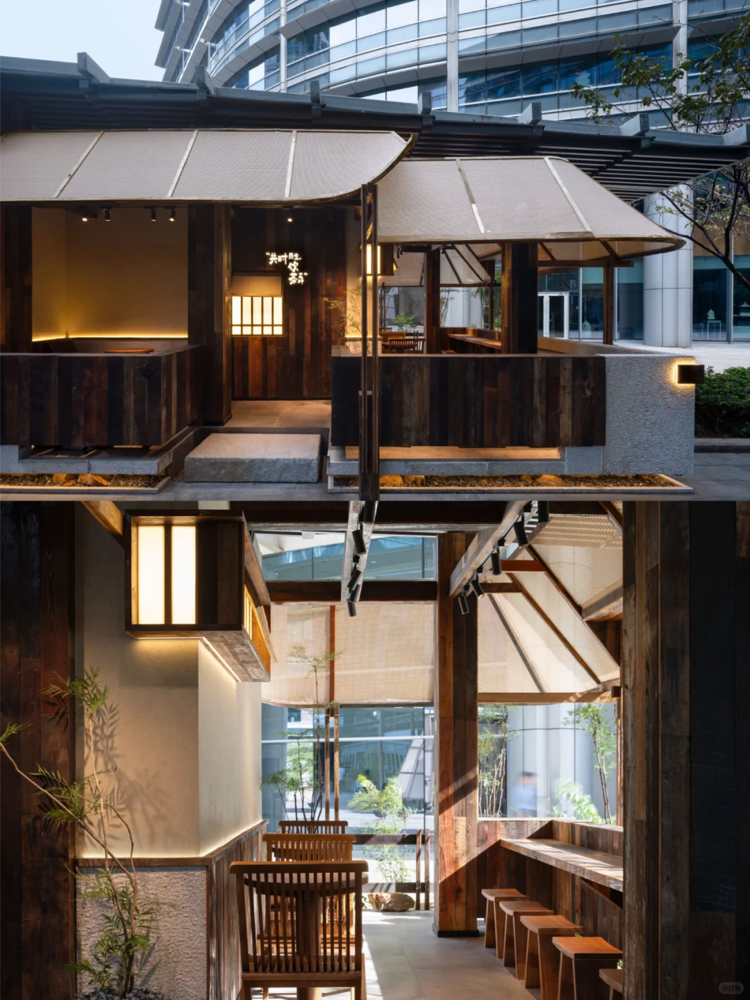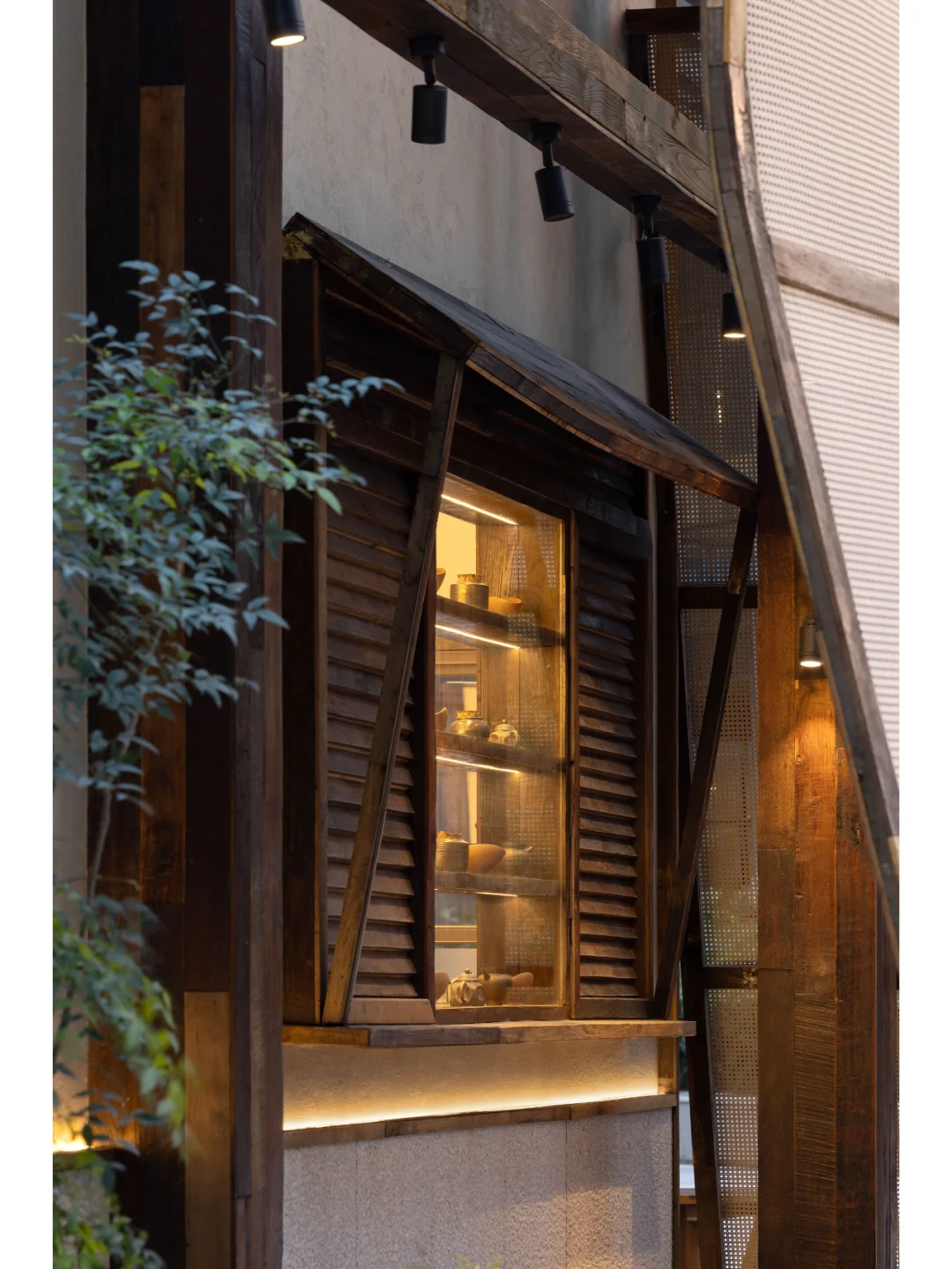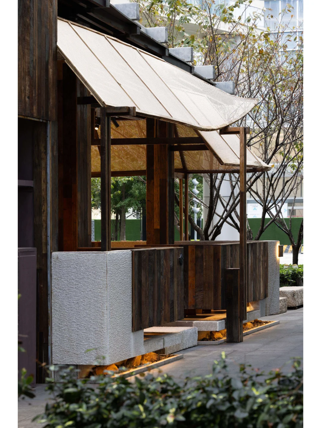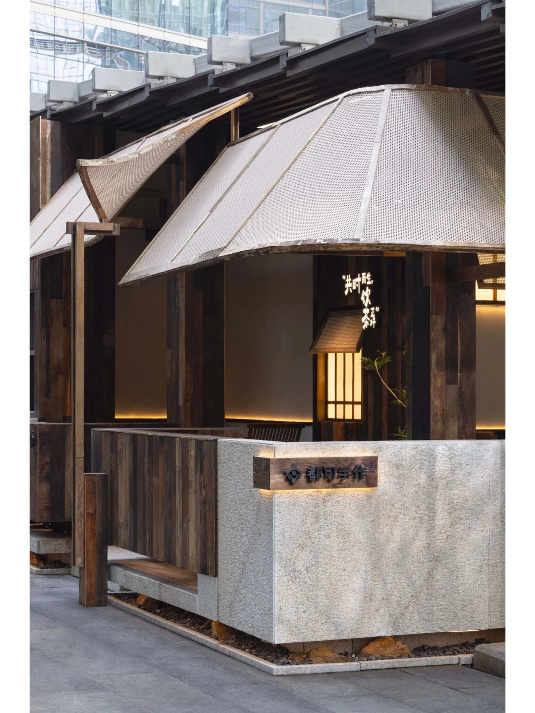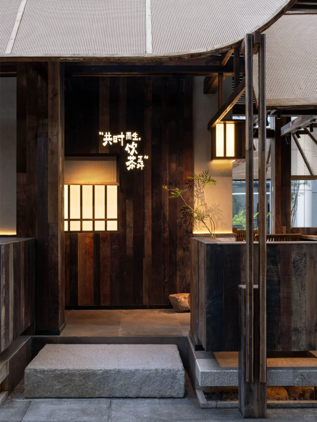 建筑主体伫立广场之上,以多元复合的空间形态寻访古朴意蕴。店面设有多个入口,因仿茶亭之意,实则内外相连,予人沉浸环境般的自在质感。