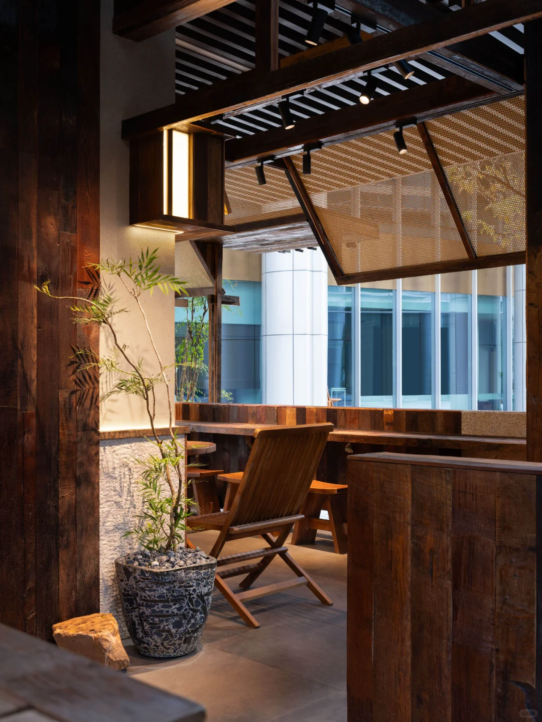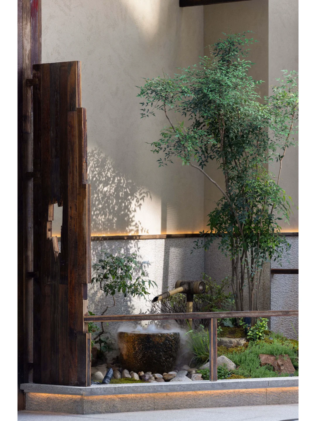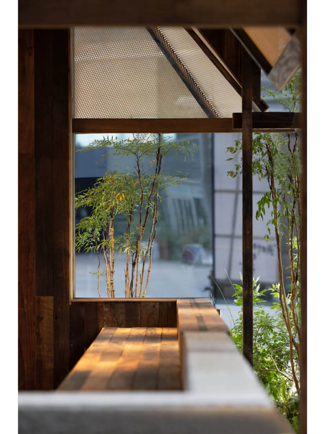 旧木、竹编将自然的温度注入肌理,勾勒出返璞归真的素雅质感。透过阳光的照射,空间在斑驳的光影中萌生通透与韵律,形成内外之间的流动。浅淡石板与深灰碎石铺展通幽小径,旧式条凳与古朴窗棂支撑旧日感怀。