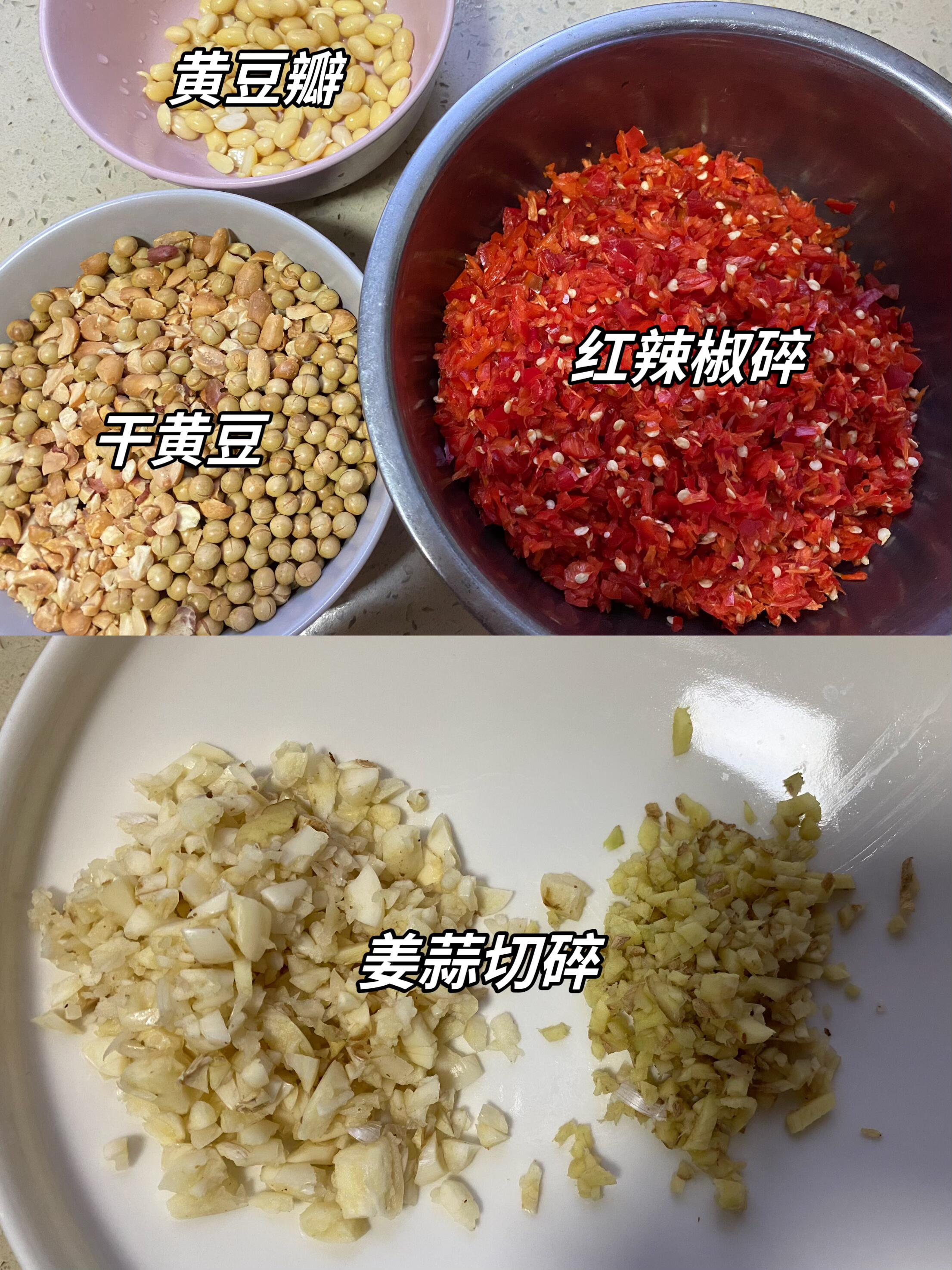 巨香巨下饭‼️谁都能学会的自制辣椒酱! 只需黄豆和辣椒,就能做出香而不辣的豆瓣酱,夹馍拌饭都很绝(根据口味,选择辣椒辣度哦~都是红椒,但辣度有差异) 而且里面的干黄豆会越放越香,久了会有豆豉的风味 1、准备干黄豆、泡软的黄豆瓣、红辣椒切碎、姜蒜沫 2、干黄豆空气炸锅 180 度、五分钟,炸好备用 3、起锅多倒一些油(没过所有食材即可),油稍微热一点,就放姜蒜沫炸香,随后放红辣椒 4、加入黄豆酱、甜面酱、盐、糖(喜欢甜口多放点)、老抽、十三香适量 5、小火不断搅拌,防止糊锅,大概二十分钟出锅
