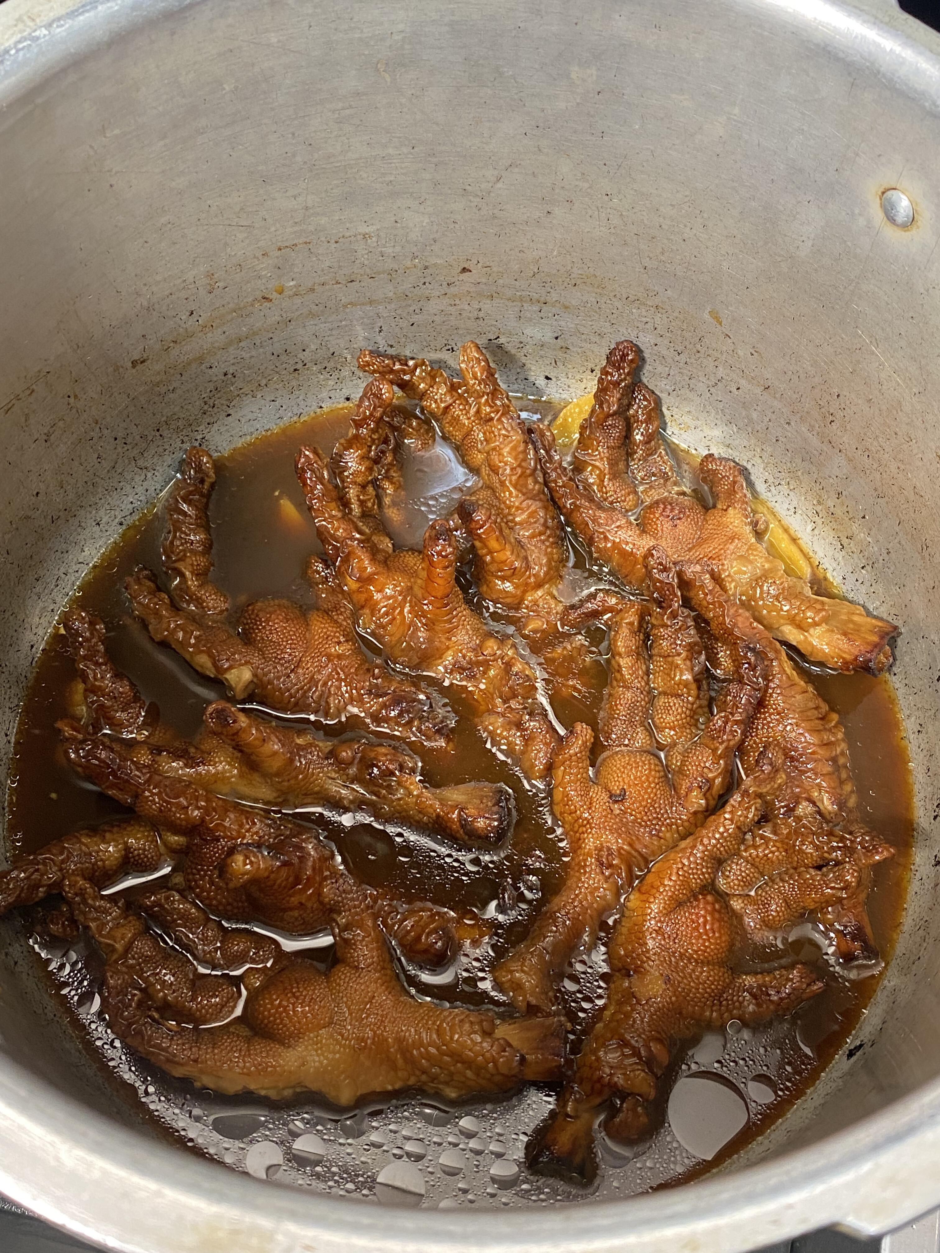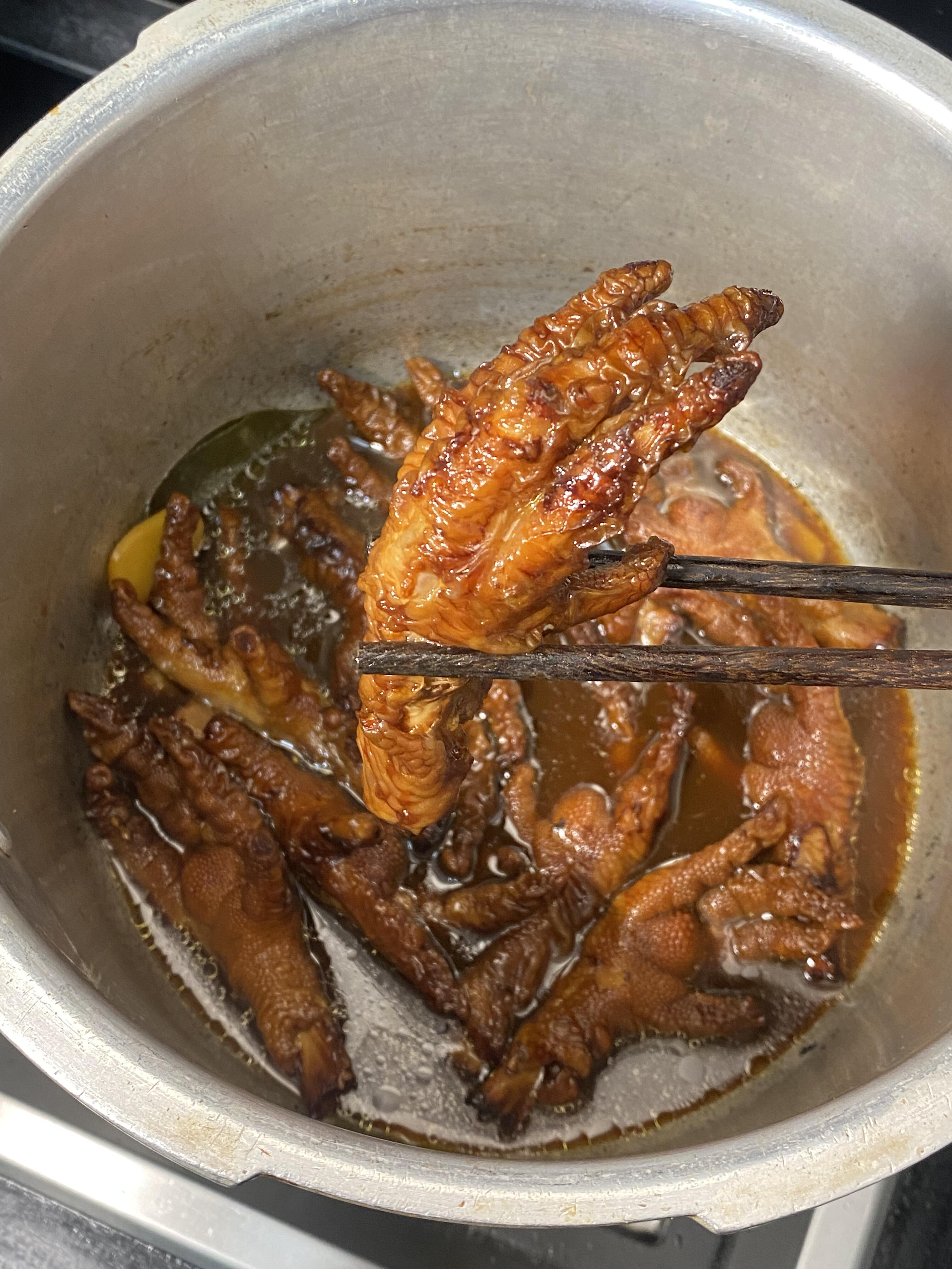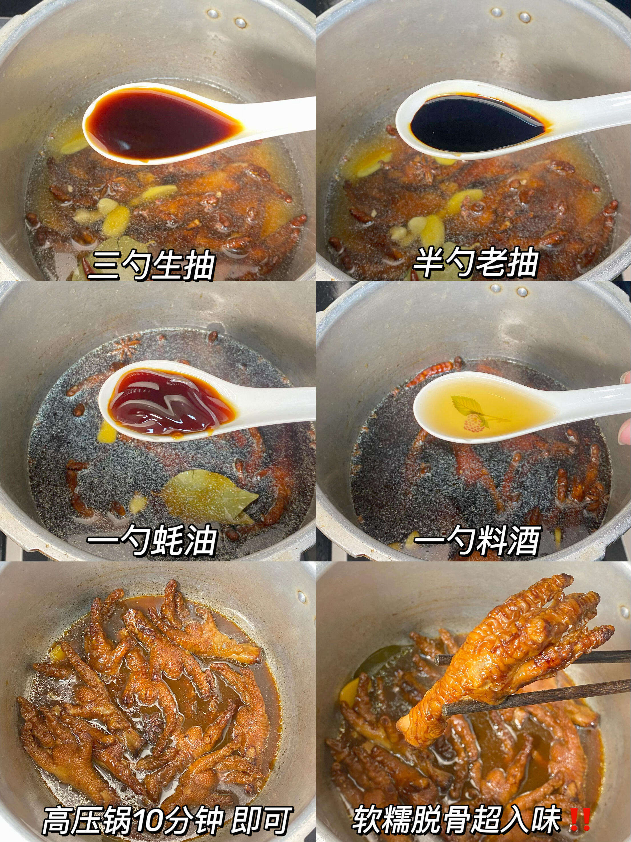 在家做出超好吃的虎皮鸡爪,空气炸锅免油炸 软糯入味的鸡爪谁不爱啊~ 在家一次性做一大锅,吃不完分装冷冻起来,吃螺蛳粉和泡面煮一个,一口软糯脱骨太满足了 这个是我研究的懒人速成版,传统的油炸溅油太危险啦,还是空气炸锅方便,可以提前泡一晚更能泡出虎皮,懒得话不用泡也没事,图省事高压锅压10分钟,如果是炖锅的话煮30分钟收汁 1、鸡爪剪指甲,放姜葱料酒去腥焯水,煮开沸腾,有浮沫捞出,放一勺老抽,戴手套抓匀上色 2、鸡爪摆入空气炸锅,200度烤25分钟,中途翻面一次再烤,看自家的炸锅功率哦,我喜欢吃有肉一点,就烤到我图上的程度我就ok 3、然后马上放入冰水里泡出虎皮 4、接着把鸡爪倒入高压锅里,适量清水,姜片八角香叶花椒干辣椒,三勺生抽,半勺老抽,一勺蚝油,一勺料酒,高压锅煮10分钟即可 大家也快去试试吧~再也不用怕油炸烫到了~ 懒人速成版