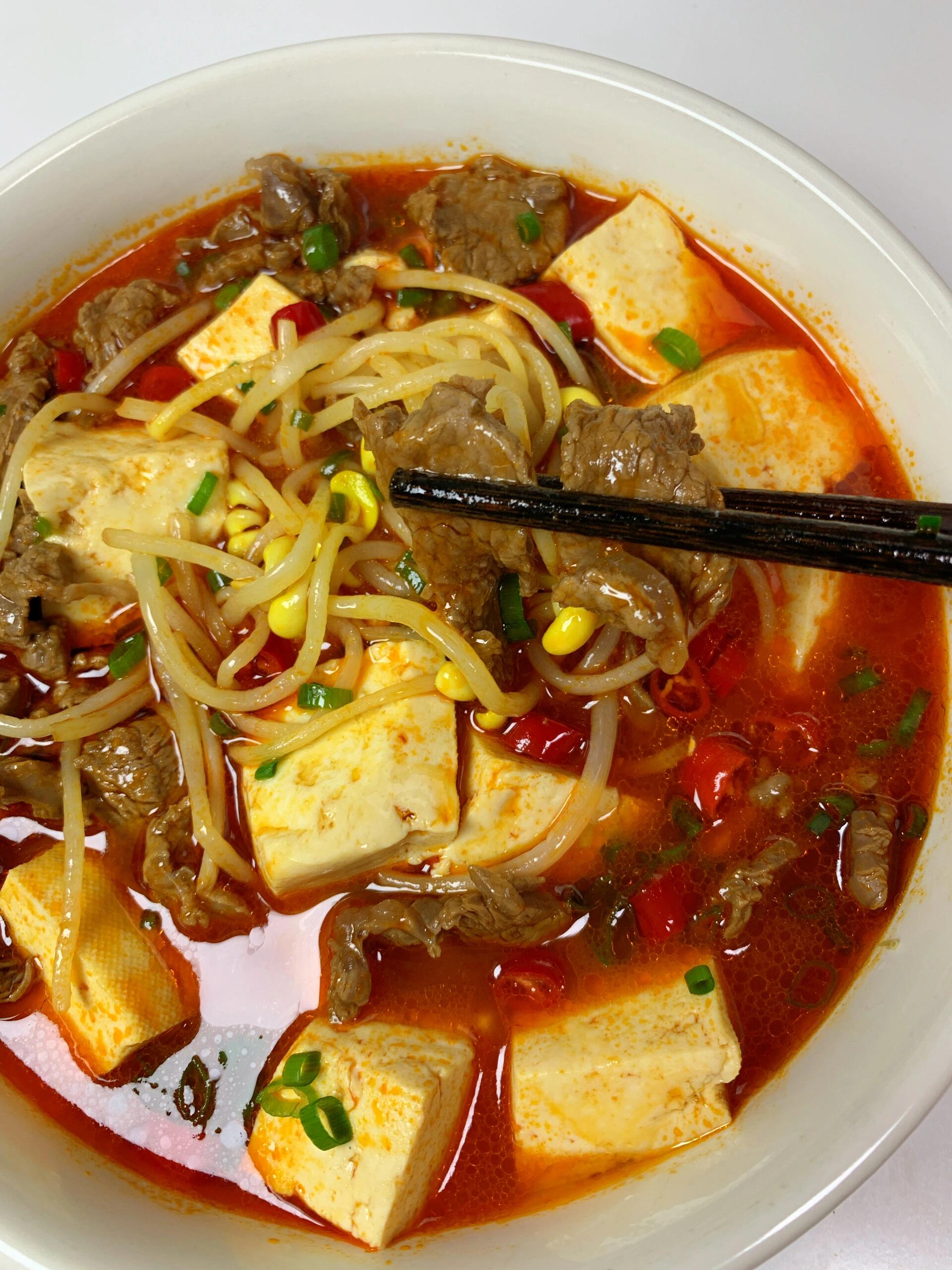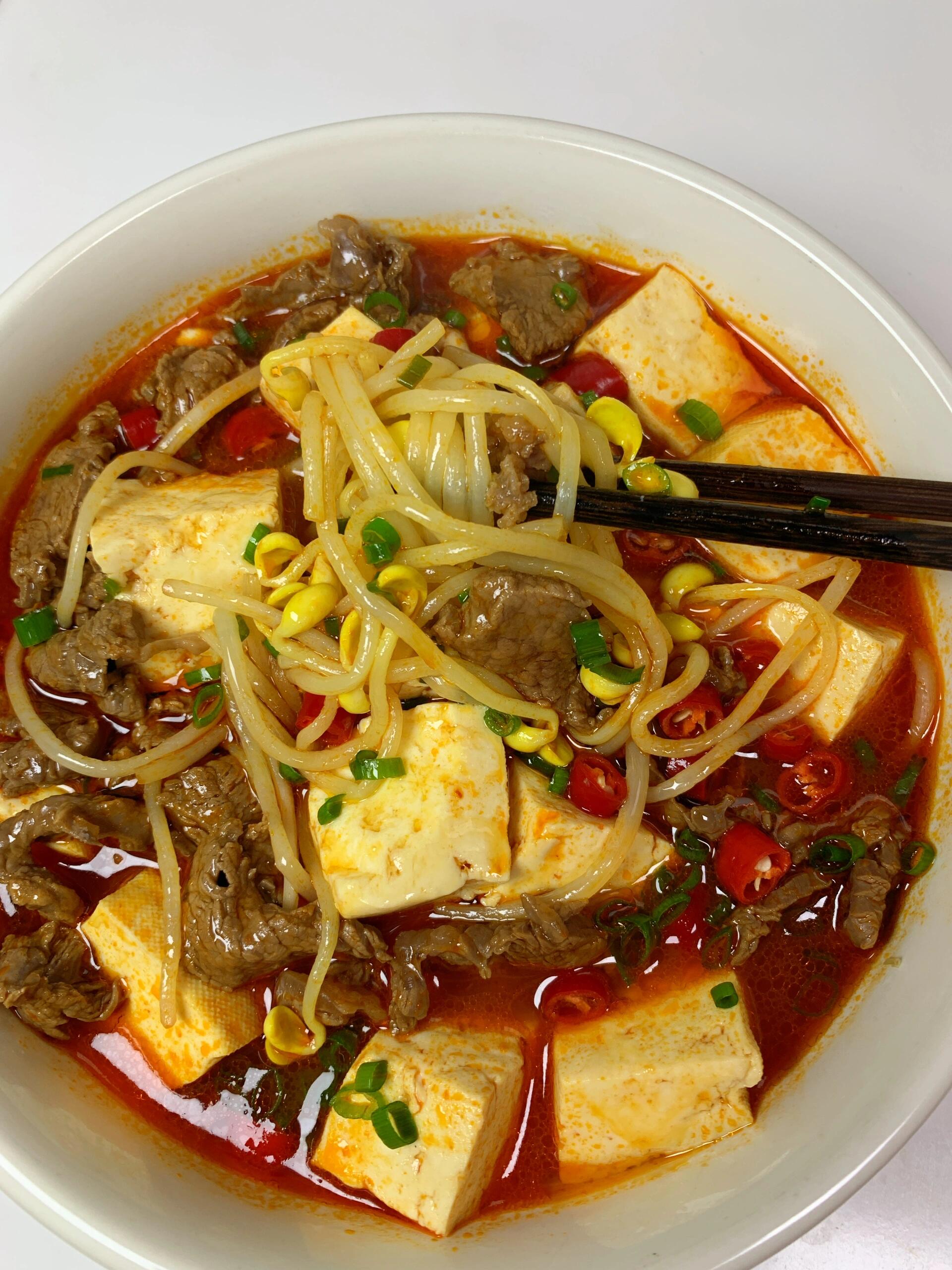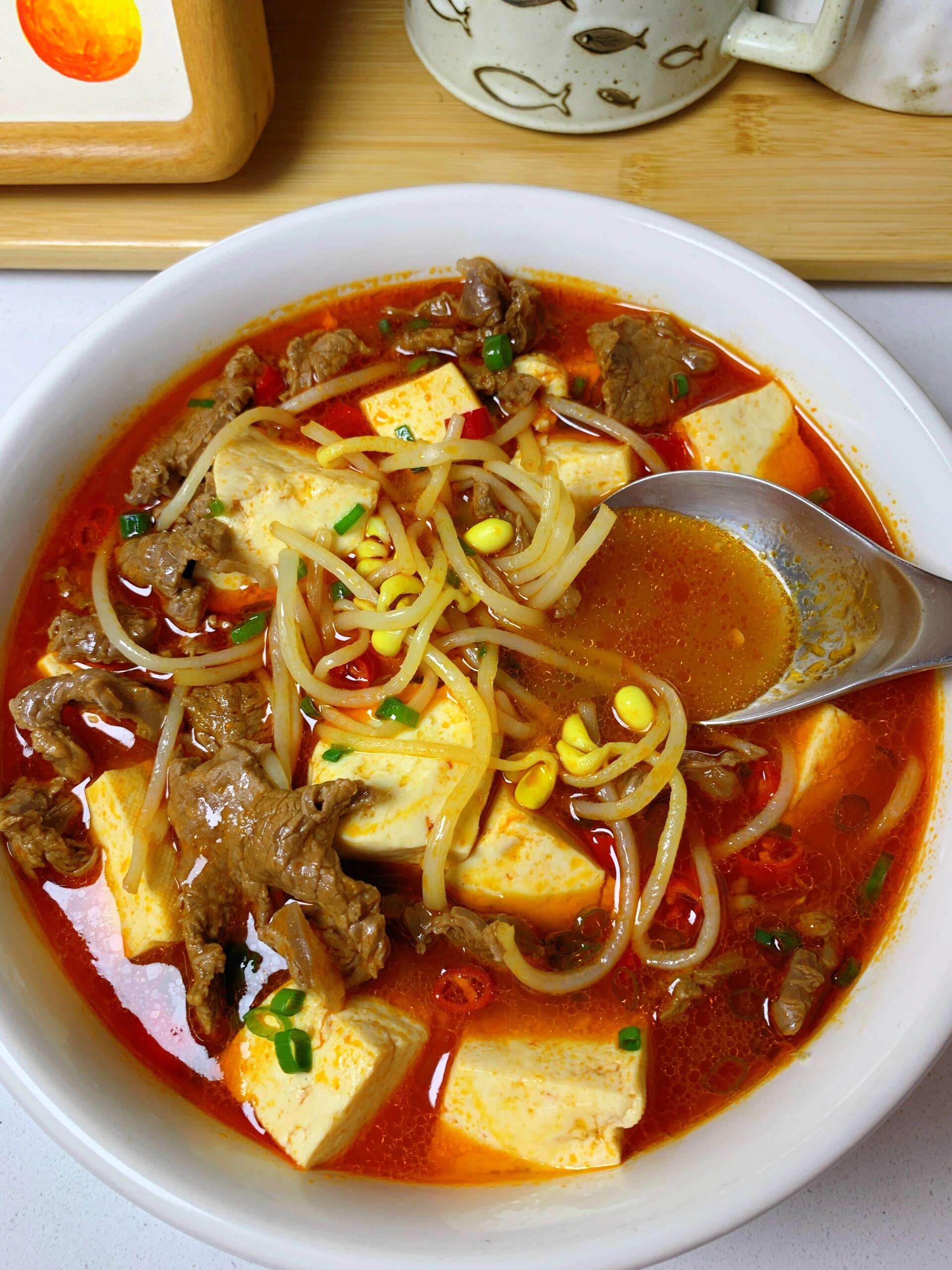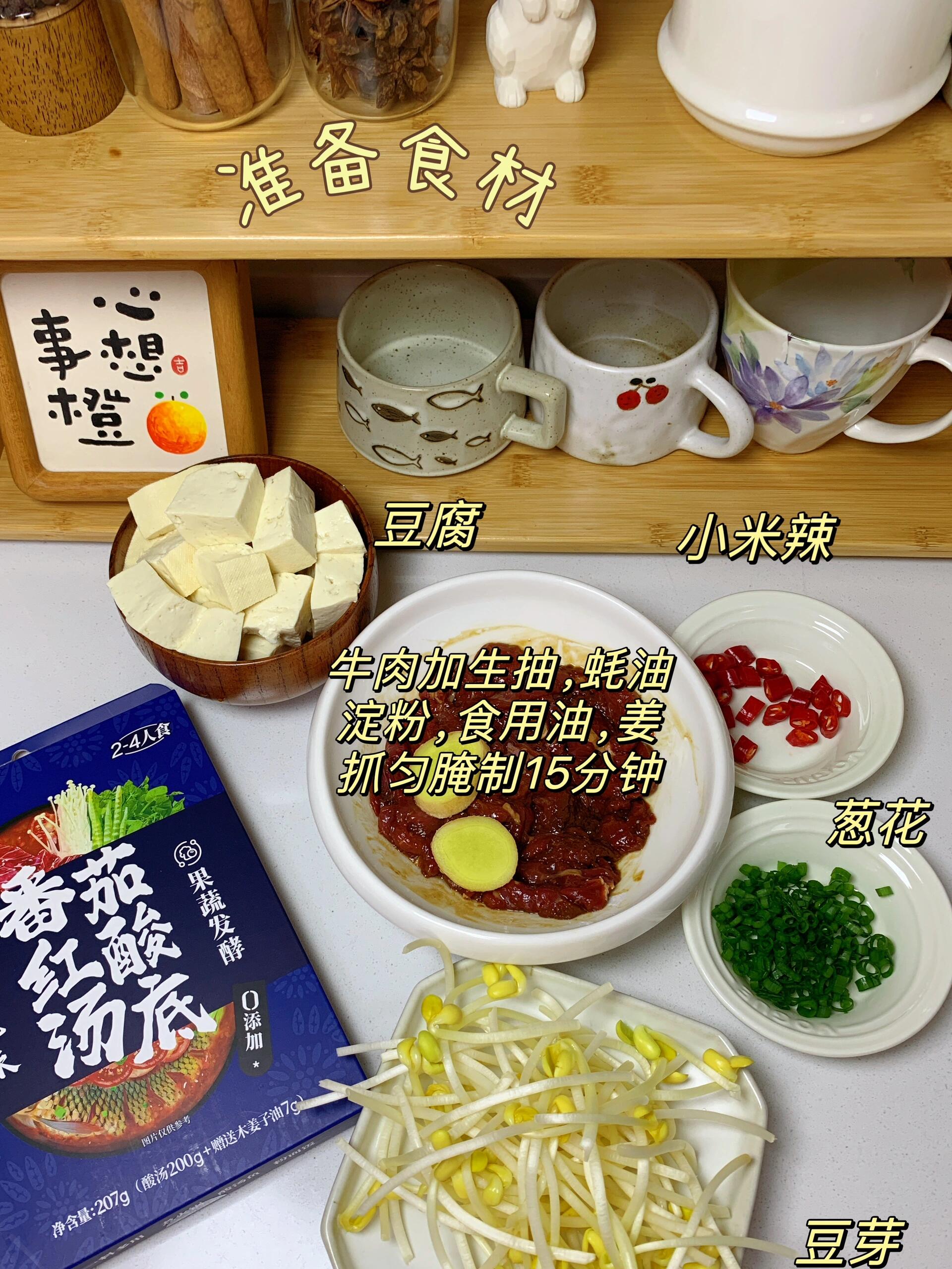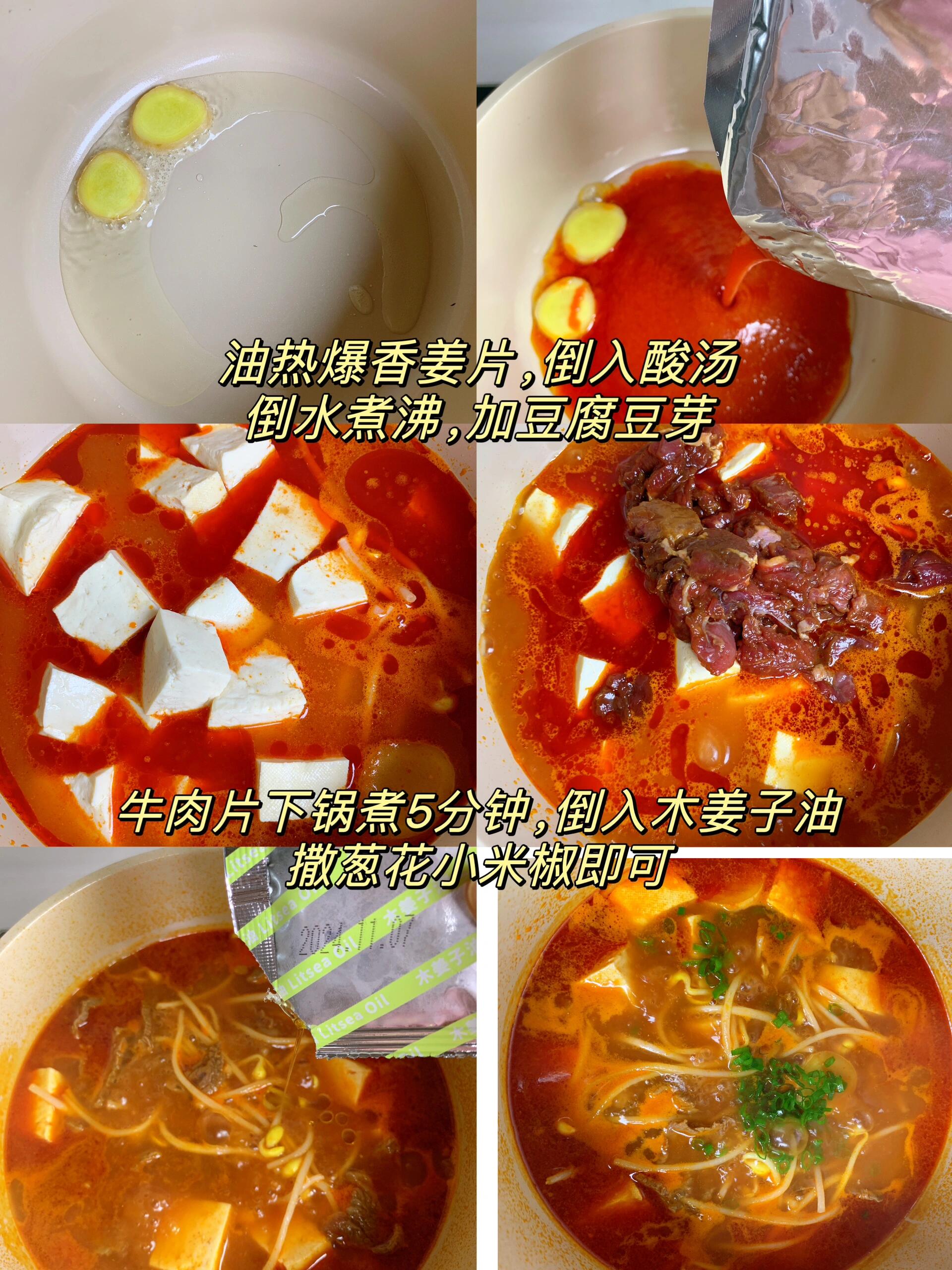 5分钟就出锅!巨巨巨好吃的酸汤牛肉! 给啥都不换,冬天就应该来这么一碗牛肉汤! 贵州红酸汤口味,酸爽开胃一口惊艳! 牛肉鲜嫩爽口,豆芽脆爽,酸酸辣辣的超过瘾! 食材:牛肉,黄豆芽,豆腐,小米辣,葱花,姜、贵州风味番茄红酸汤底 做法:1.牛肉切薄片,加生抽,蚝油,淀粉,食用油,姜,抓匀腌制15分钟 2.倒入贵州红酸汤底(木姜子油包按照个人口味适当添加),加水煮沸,加豆芽和豆腐,加牛肉煮5分钟,放葱花小米辣即可