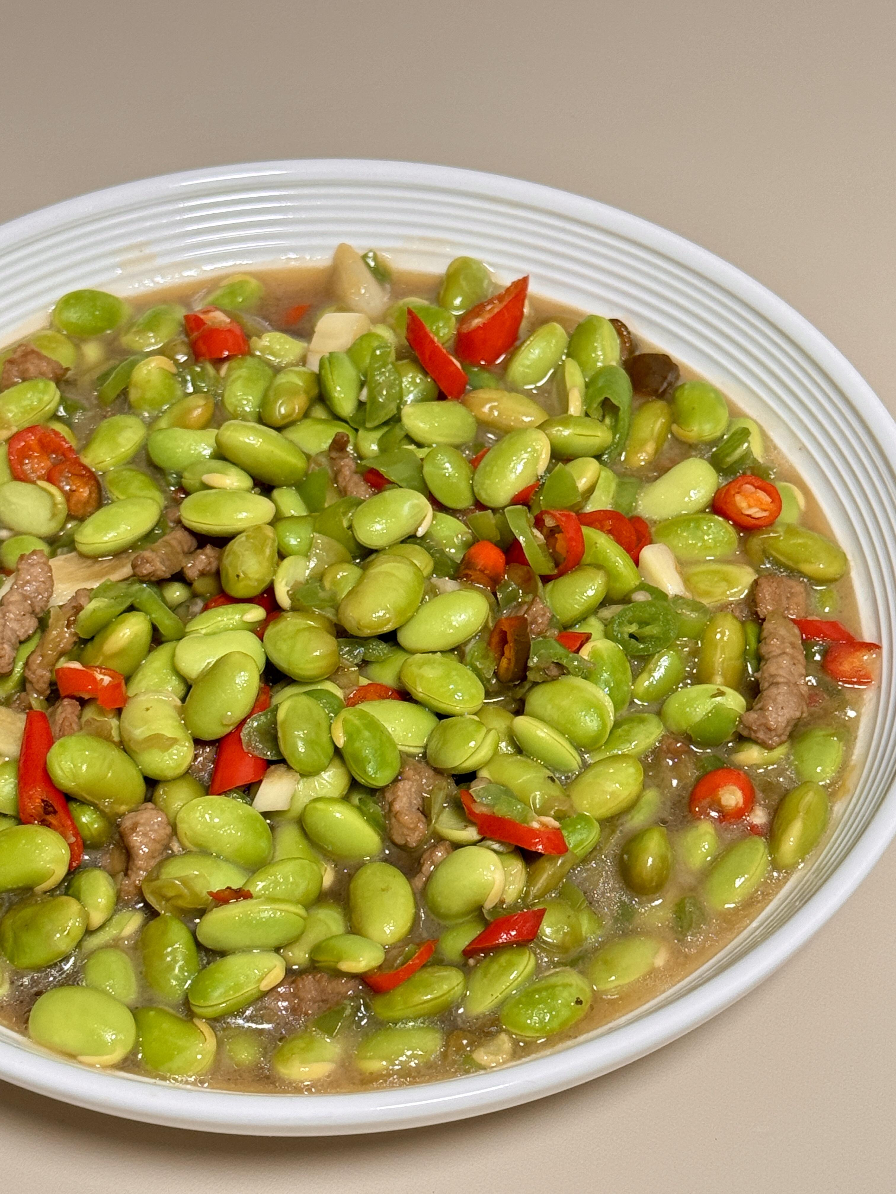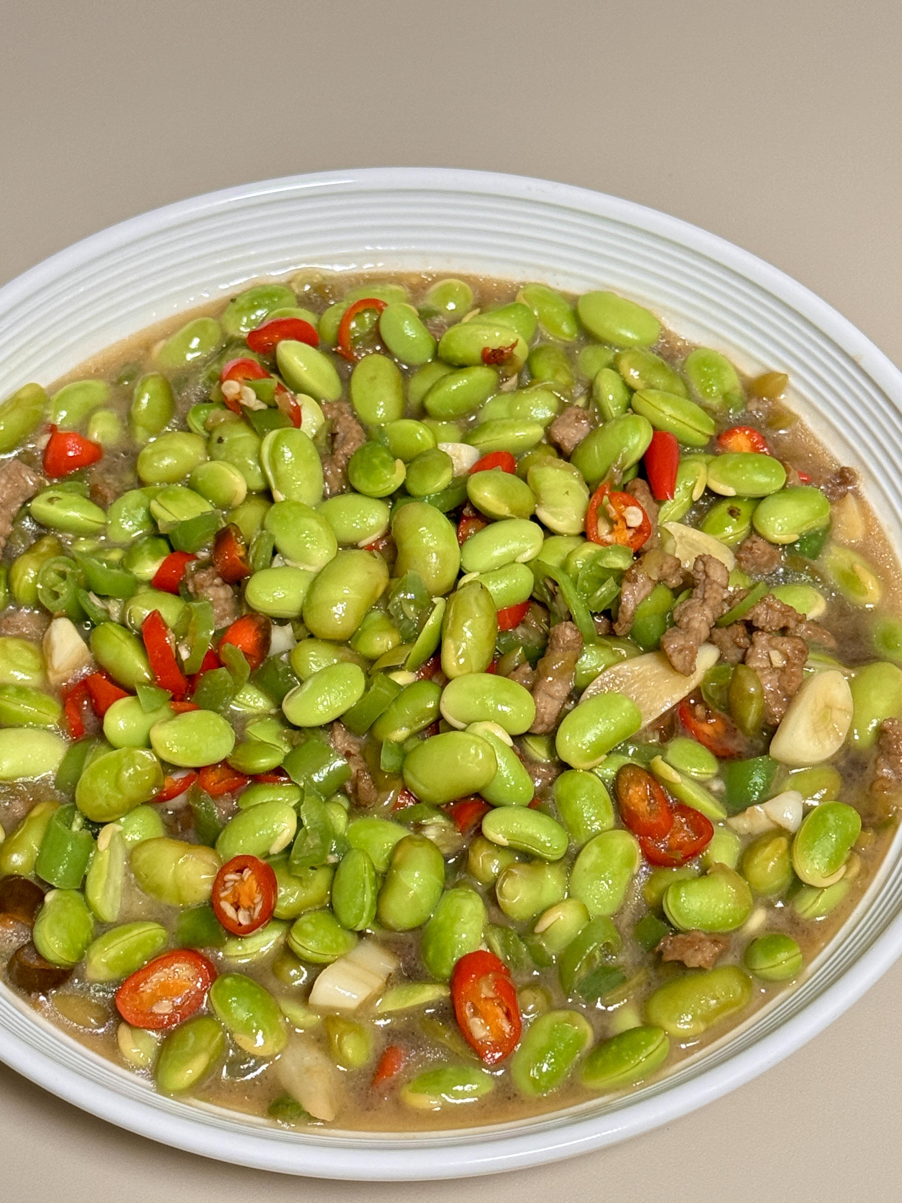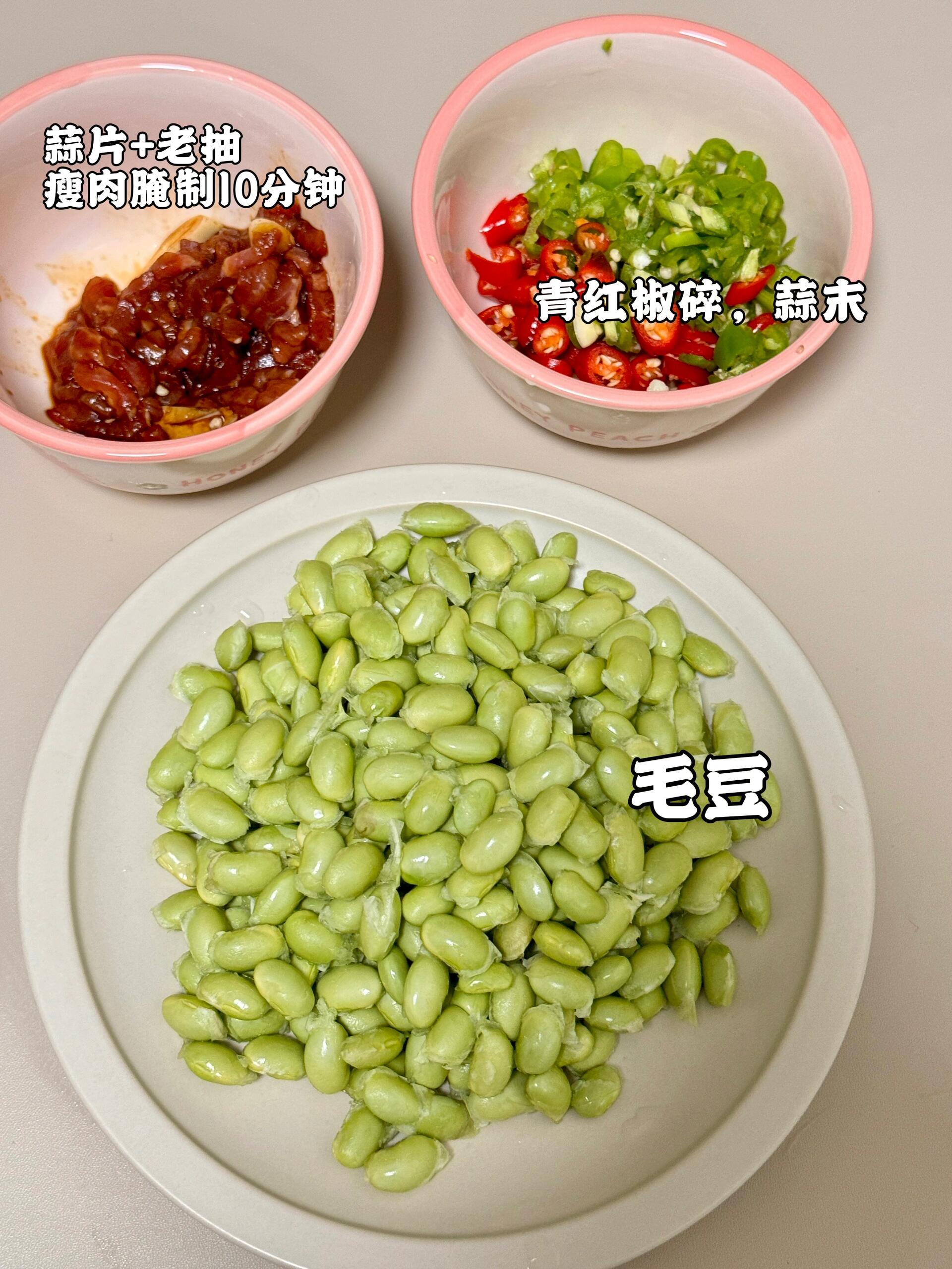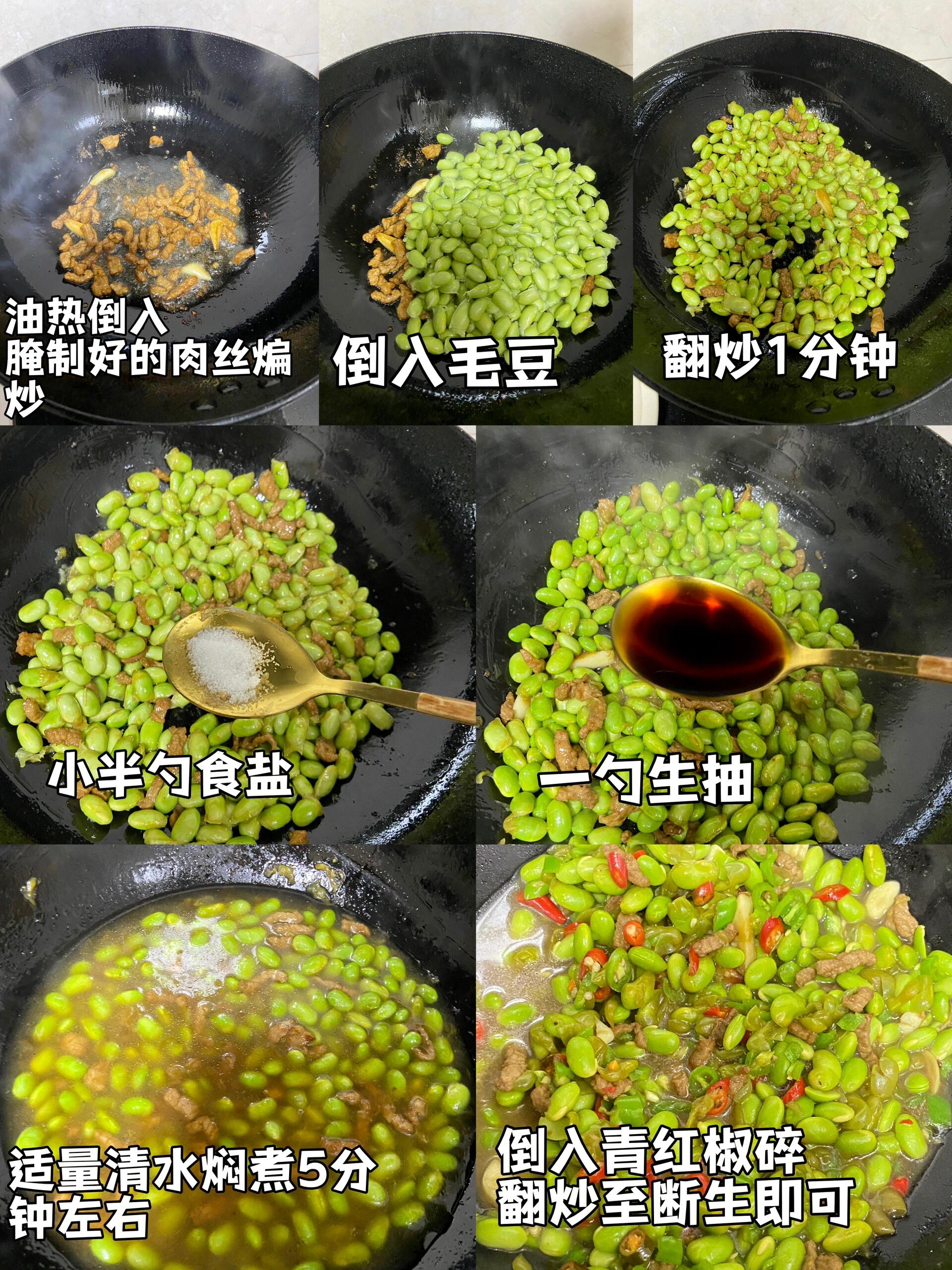 巨无敌下饭菜肉丝炒毛豆 肉丝炒毛豆拌饭吃的快乐谁懂!!轻轻松松炫3碗饭 食材:肉丝,毛豆,蒜,小米椒,青椒 做法: 1.肉丝加半勺老抽,蒜片腌制10分钟 2.油热下入肉丝炒至变色,再倒入毛豆翻炒1分钟 3.加入一勺生抽,小半勺食盐,适量清水焖煮5分钟左右 4.倒入青红椒碎,翻炒至断生即可