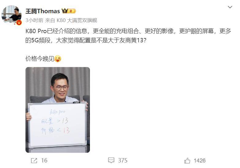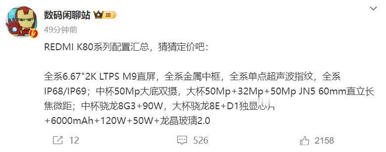 红米K80的手机实物外观放出来的那一刻开始 其实也不用狡辩了 事实胜于雄辩 因为体验和价格才是最有说服力的,K80标准版,2499还是雷军广场,加200变成2699也能接受,毕竟有超声波指纹,电池容量6500mAh,IP69和骁龙8Gen3 而K80pro的定价,其实高管比用户纠结。不过说句实话骁龙8Elite的前期成本高,定价低不了。做等等党,到明年618直接捡漏,预算足直接上,毕竟红米的性价比,事实证明,这都七八年时间了一直被挑战,从未被超越。骁龙8Elite+无线充电+龙晶玻璃2.0,xiaomi15同款浮动镜头,10cm微距才是王炸,我觉得3799能接受
