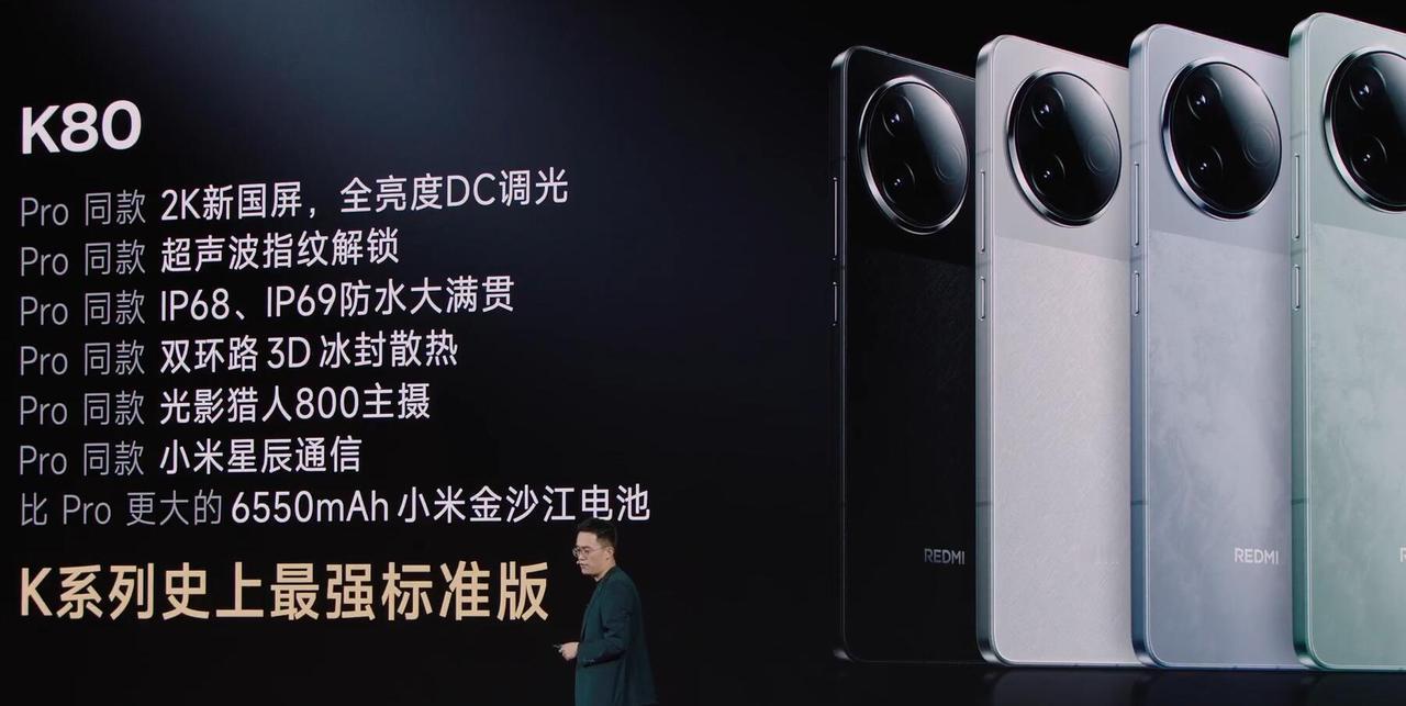 当然雷军把K80的价格宣布以后,全场都沸腾了。 2499的K80完全是加量不加价 其实配置大家都知道,2k分辨率加上圆偏振光全程DC调光。再加上6550mAh,IP69防水。同时还有小米星辰通信,骁龙8Gen3处理器。这基本上应该没有什么对手了吧!小米澎湃T1S信号增强芯片,手套触控,超声波指纹也都有