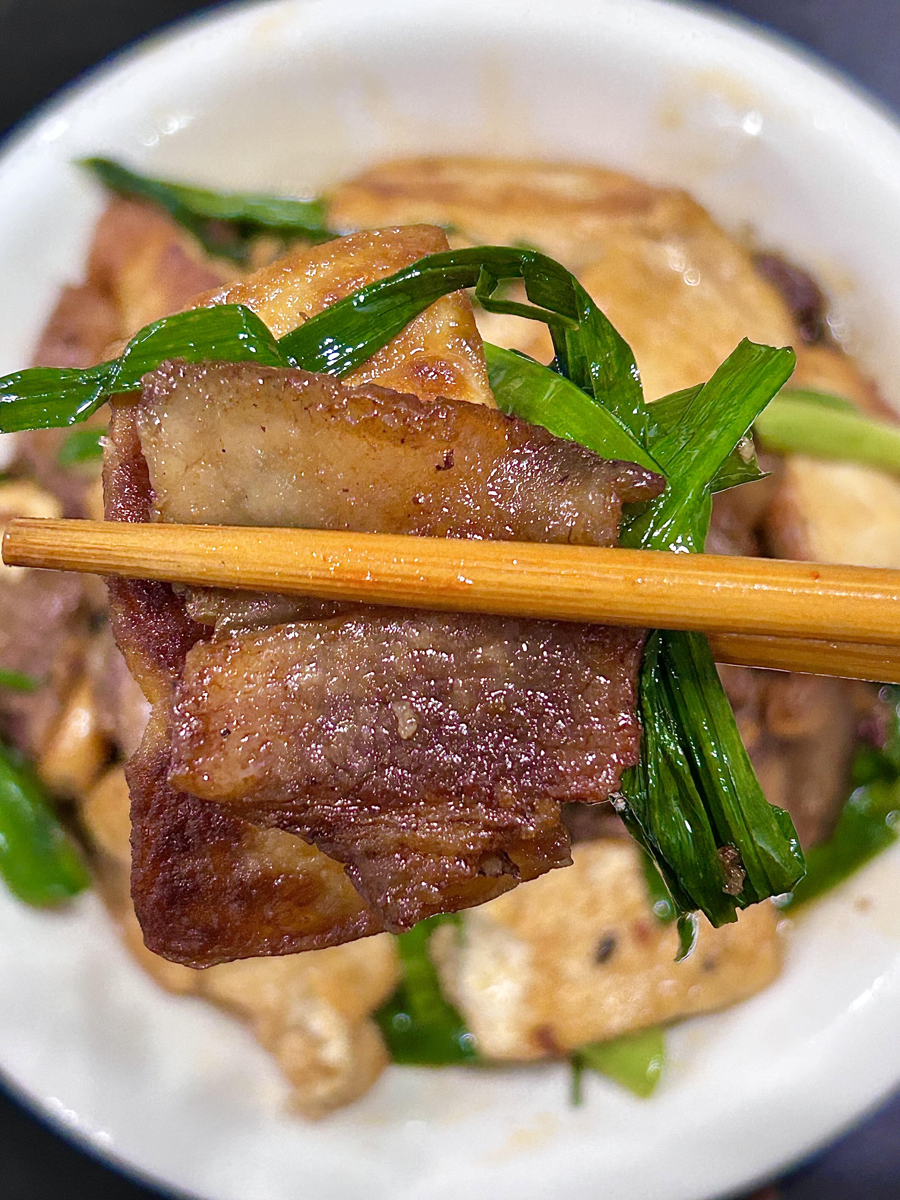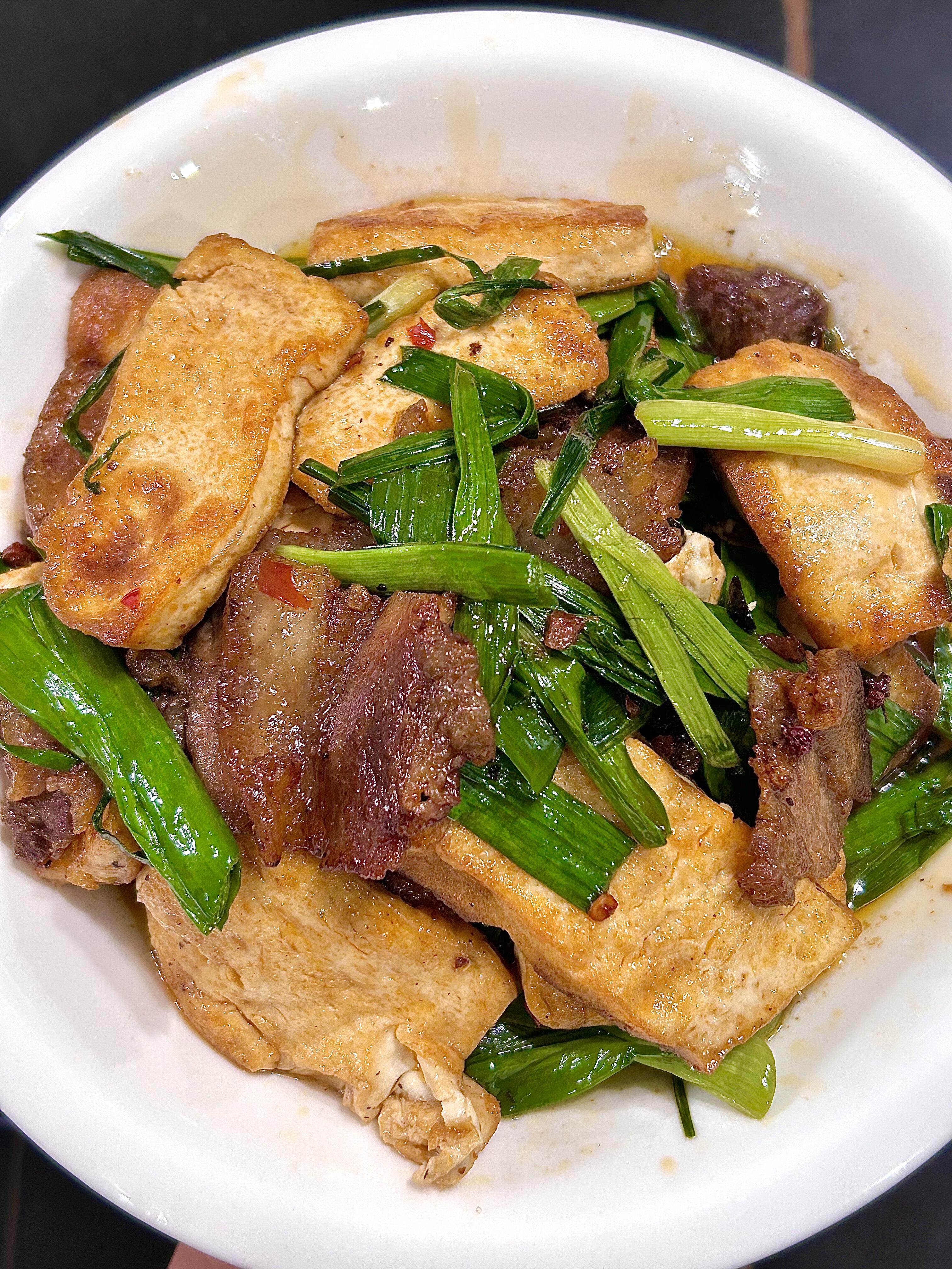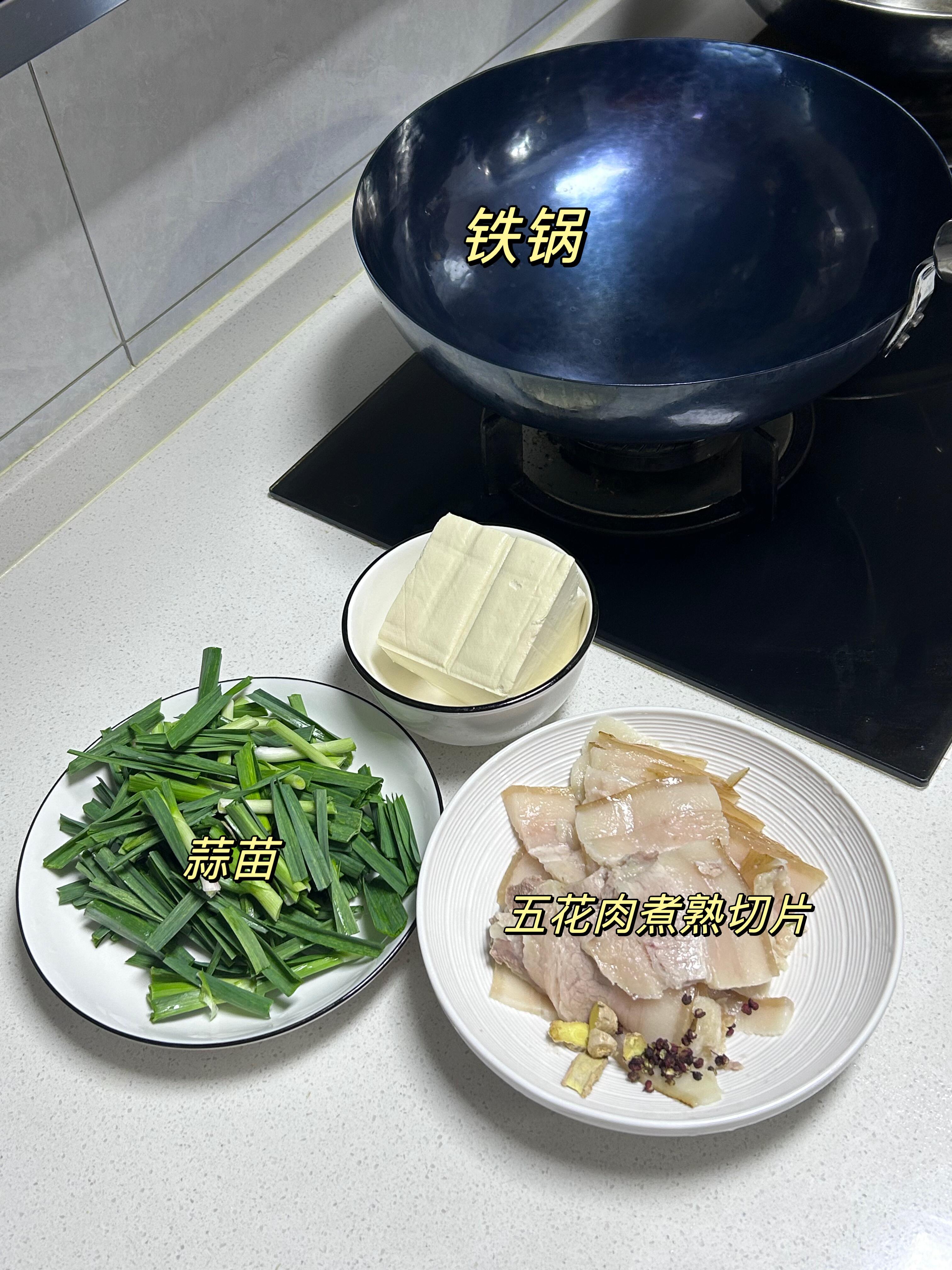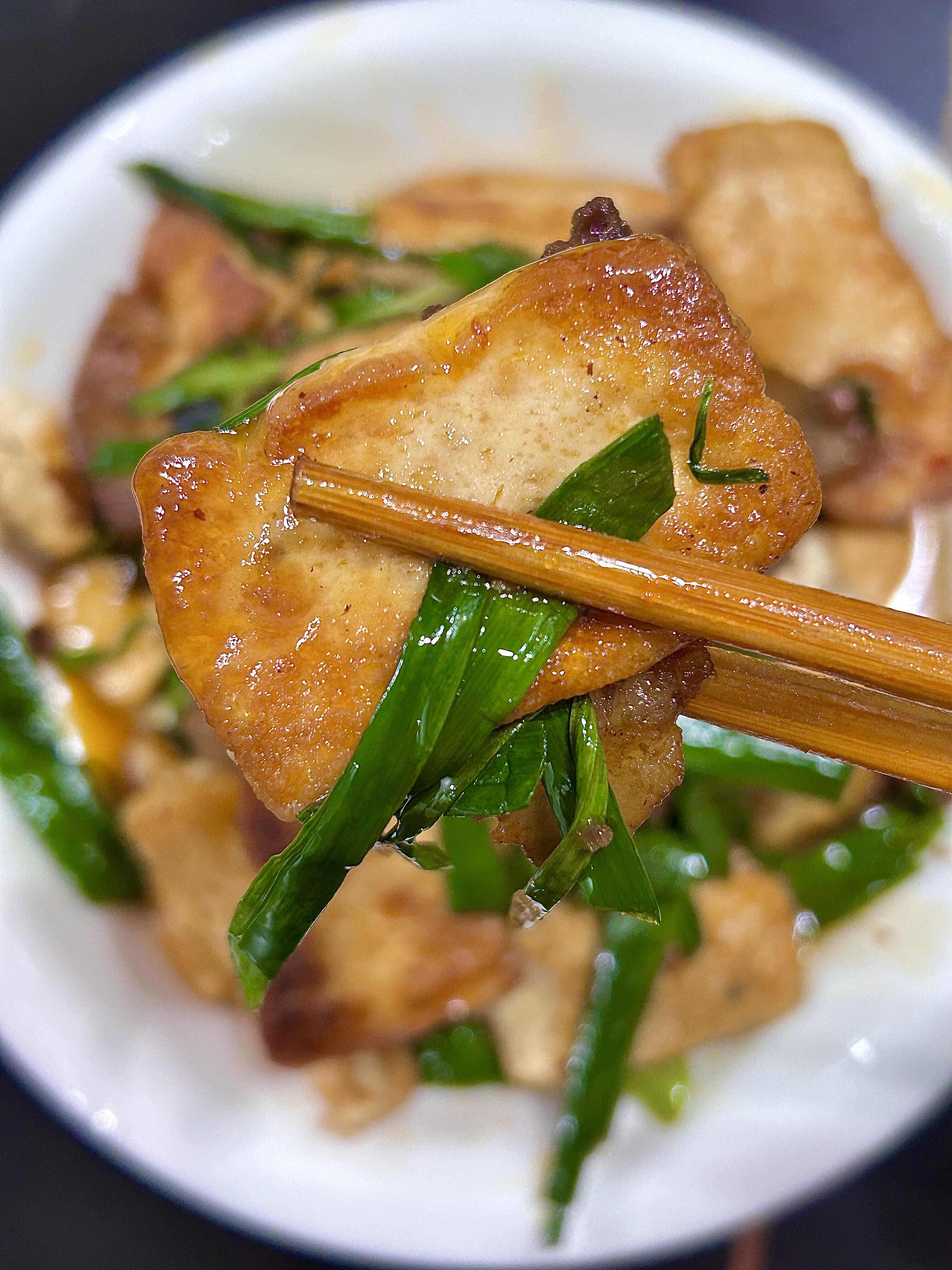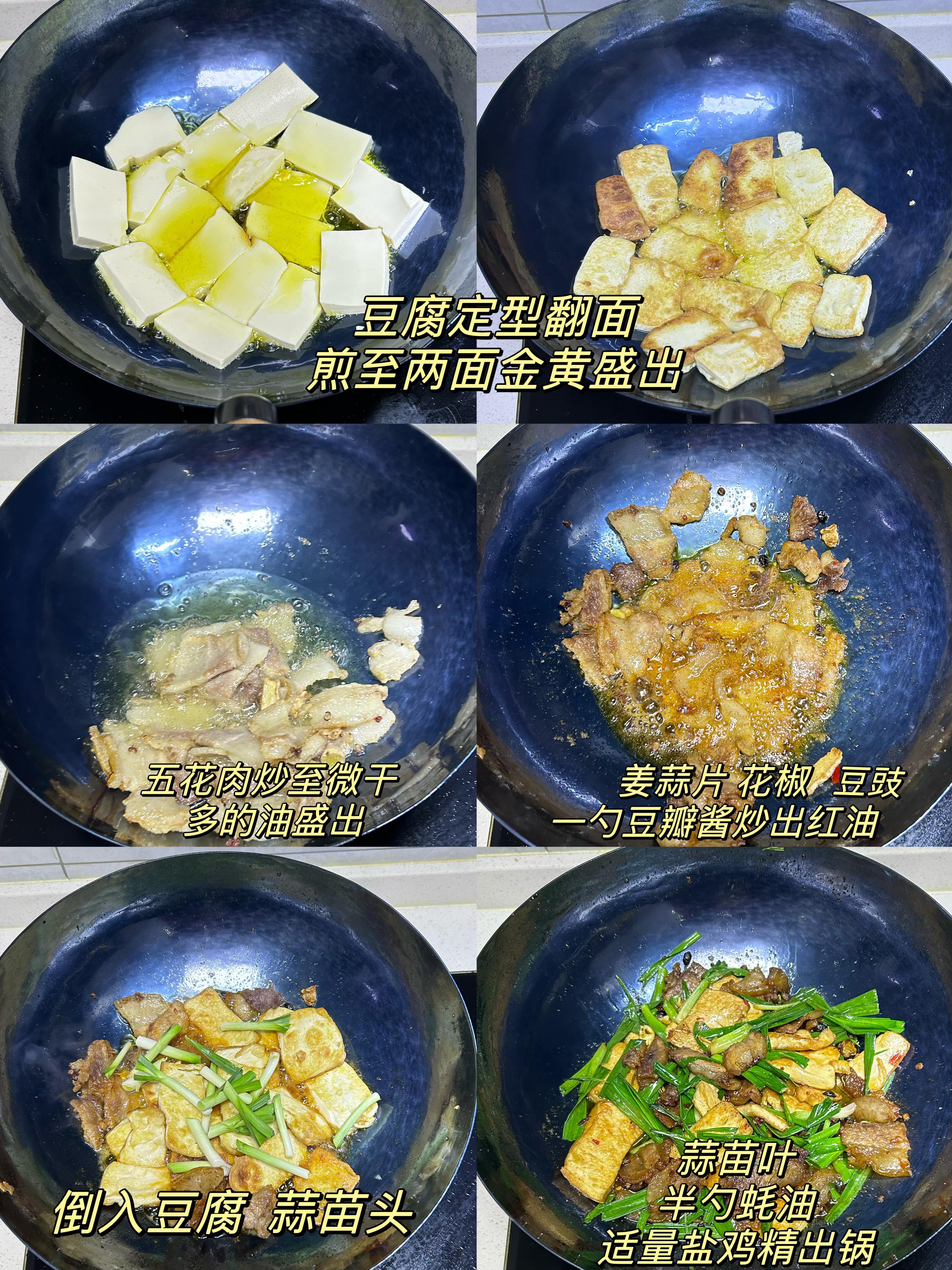 蒜苗豆腐回锅肉 巨下饭! 超级爱吃的一道简单家常菜,和米饭绝配 准备食材:五花肉 蒜苗 豆腐(老嫩豆腐都可以) 做法:1、五花肉煮熟切片,豆腐煎至两面金黄盛出,五花肉炒至微干,油多可以盛些出来,花椒 姜蒜片 一勺豆豉豆瓣酱 炒出红油。 2、倒入豆腐 蒜苗头 翻炒均匀,放入蒜苗叶 半勺蚝油 适量盐 鸡精出锅。