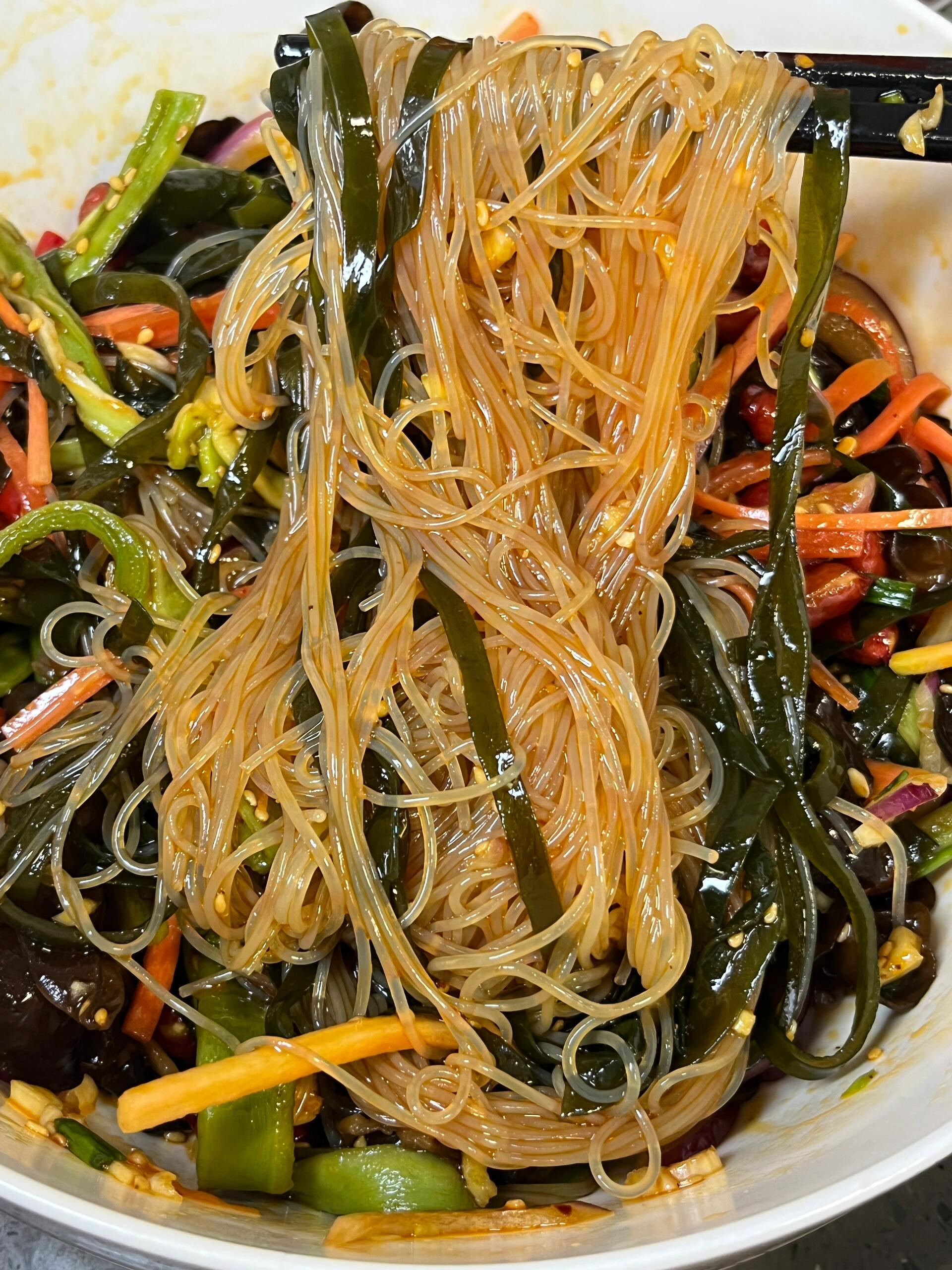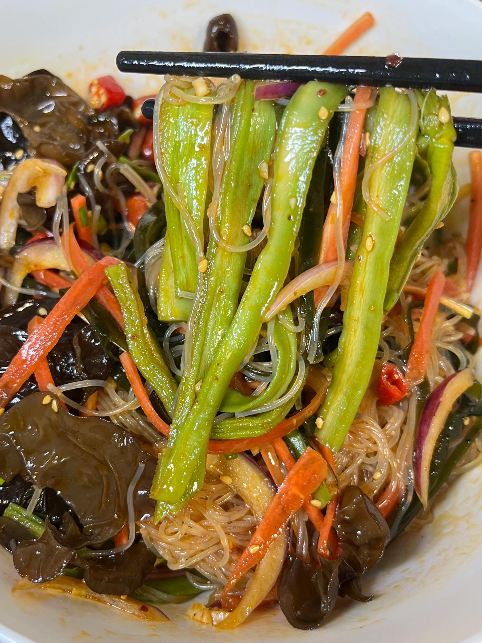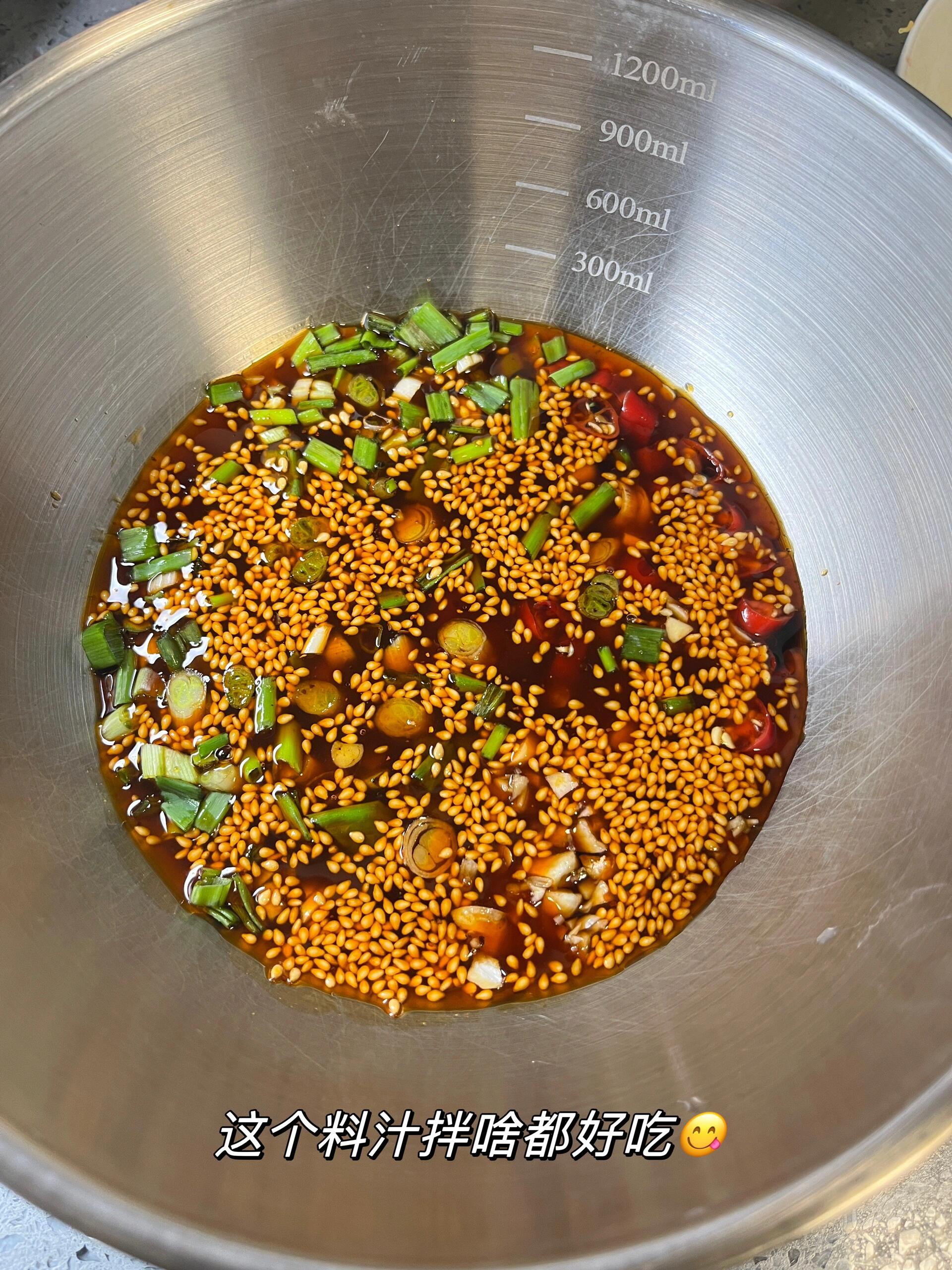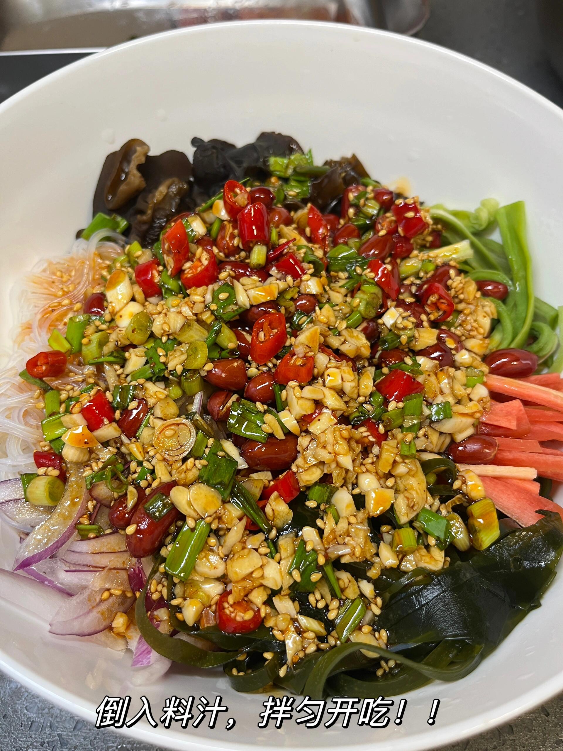 爽口大拌菜!!我真的可以炫一盆~ 凉拌菜真的是无法拒绝!晚上不想吃主食的话,可以来一份,香辣爽口,饱腹感很强,减脂期也可以吃哟~ 先把需要煮的食材煮熟放大碗里 调个料汁:碗里放蒜末、葱花、小米辣,3勺生抽,3勺醋,一勺花椒油,少许盐和白糖,然后倒入适量钵钵鸡红油调料