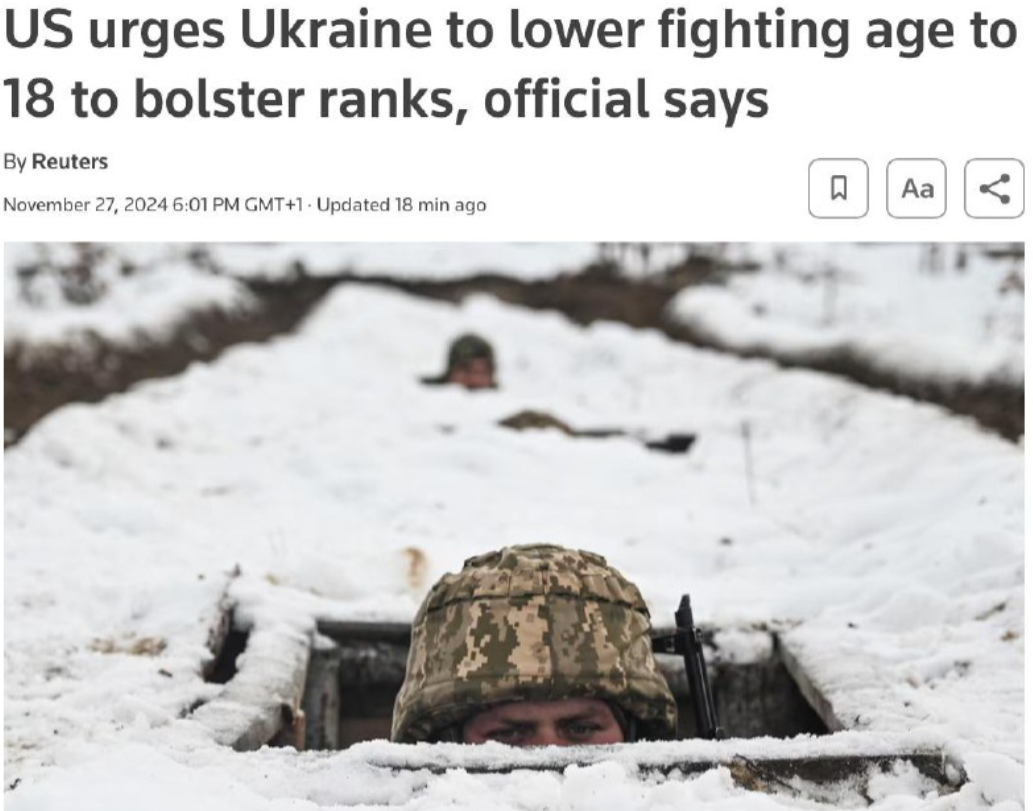 种种迹象表明,白宫和五角大楼正赶在川普上台之前,将俄乌冲突推上“风口浪尖”,据美联社11月27日报道,一名不愿意透露姓名的白宫高级官员透露,白宫正在敦促基辅当局尽快修改该国的《动员法》,将乌克兰征兵年龄进一步下降至18岁(如果需要,保留进一步下降至16岁的可能性),高中毕业男生且符合征兵要求的则强制必须参军,以此将至少扩大大约200万人的部队规模,并迅速提升乌军的兵员容量。