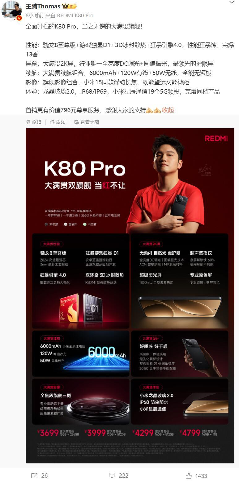 雷军的决策真TM绝了 不好意思,是我肤浅啦!说句实话在看到K8pro之前,我一直觉得3699的价格,你给上超声波指纹+2k屏+骁龙8至尊其实挺良心的。但是当我看到真机之后,我才发现红米这回是真的和之前不一样了,起码懂得照顾到用户的感受了。单说颜值,其实我一直觉得红米千元机Note13pro+的素皮拼接是最漂亮的,但是现在红米K80pro算是新高度了 不过有一说一,K80的2499不涨价。也是赔本赚吆喝了,超声波,6500电池,骁龙8Gen3,同样而言挺极限的,其实你看友商高管都赞同啦!但是背面平整度太高,当然这也是看个人,只是和K80pro放在一起,看着区别挺大的