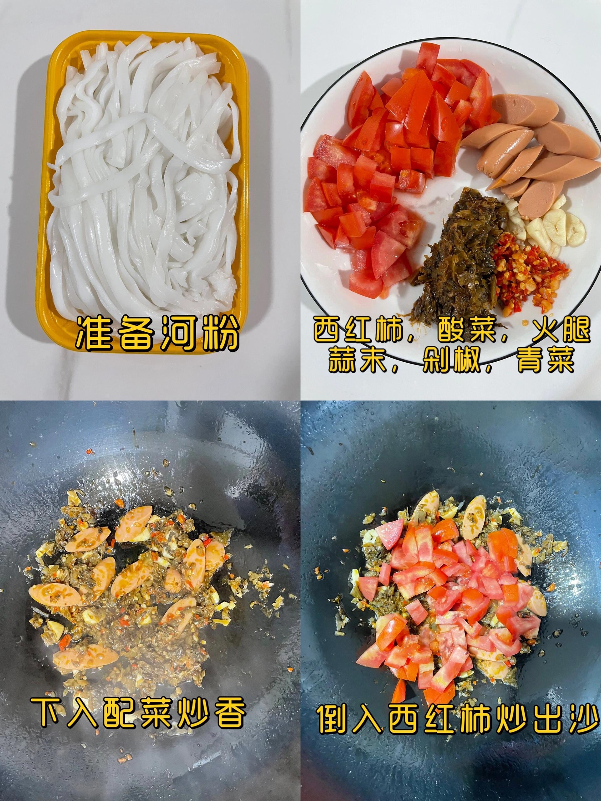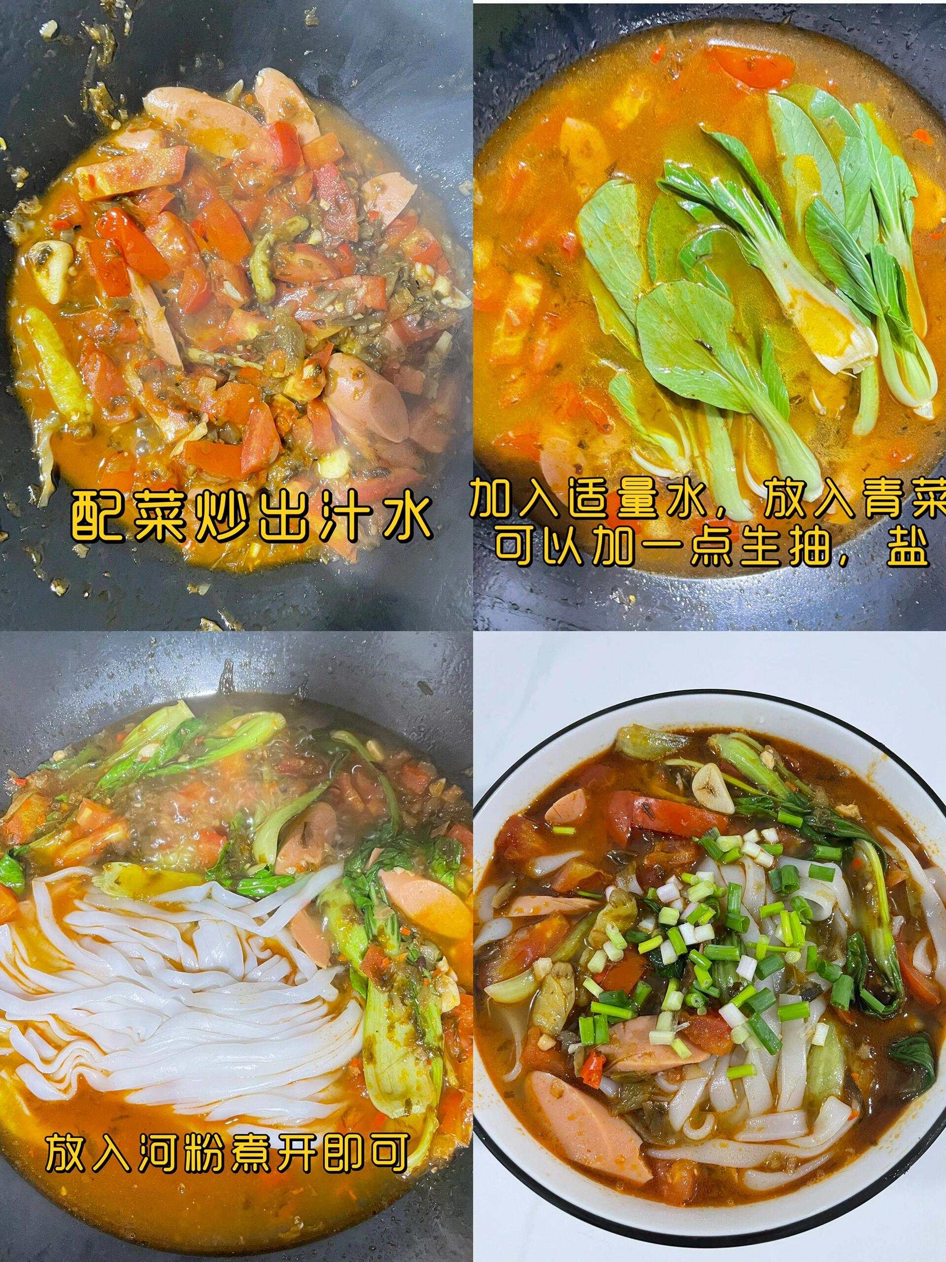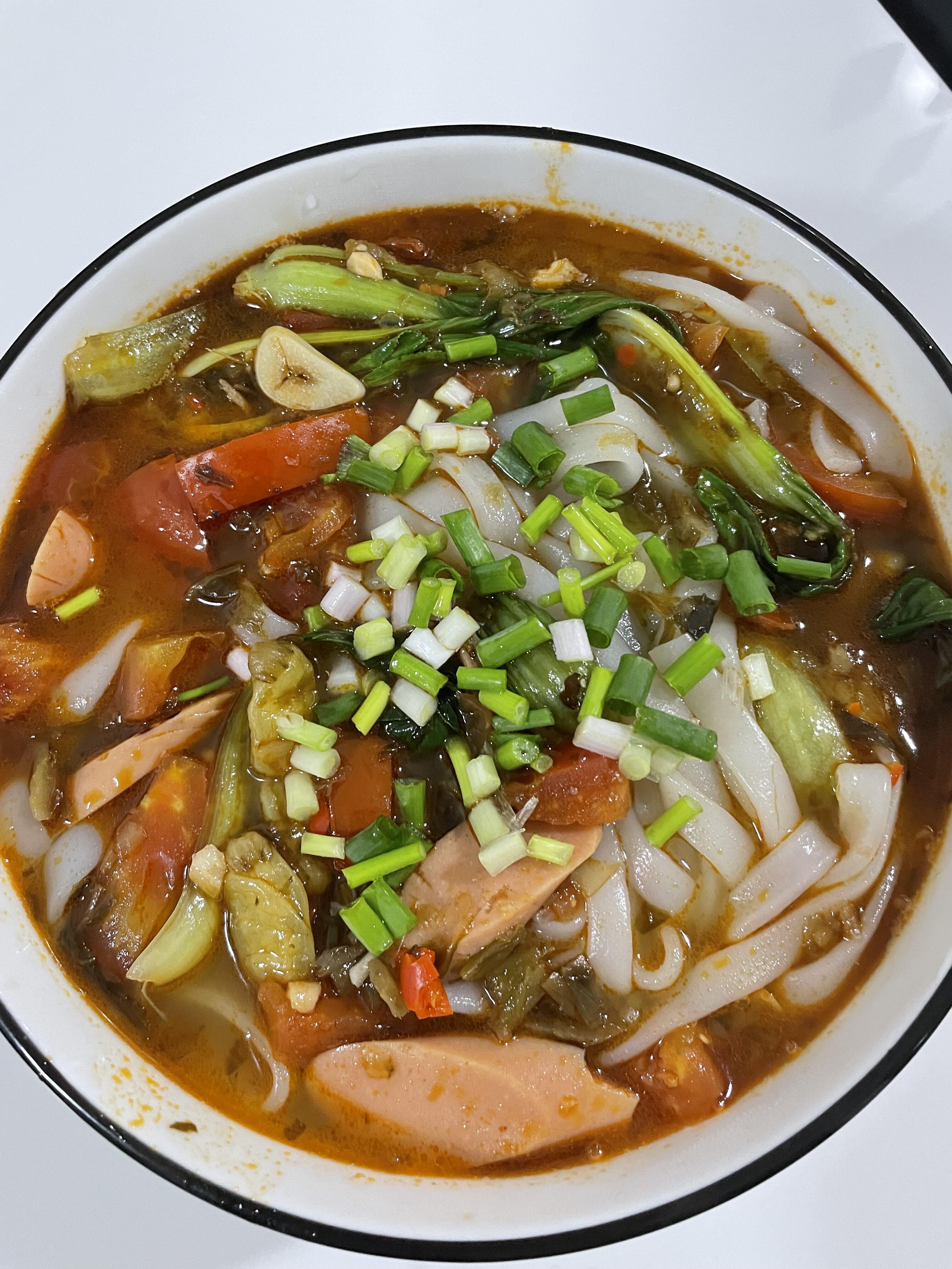 巨巨好吃的酸汤河粉,开胃爽口,河粉软糯弹牙,汤汁酸辣,热乎乎的很适合冬天 做法也很简单 准备食材,西红柿,河粉,酸菜,蒜末,青菜,剁椒,泡椒(辣度根据自己口味调整) 1、油热下入配料炒香,再下入西红柿炒出汁水 2、加入适量的清水,可以加点生抽,我的酸菜是有盐味的,我就没有再加盐 3、放入青菜和河粉烫熟即可