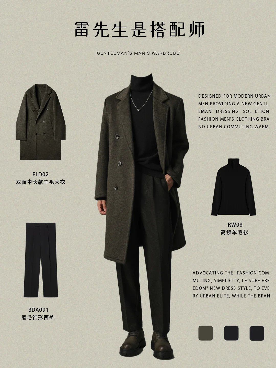 橄榄绿中长款双面羊毛大衣+黑色高领针织衫+黑色锥形西裤