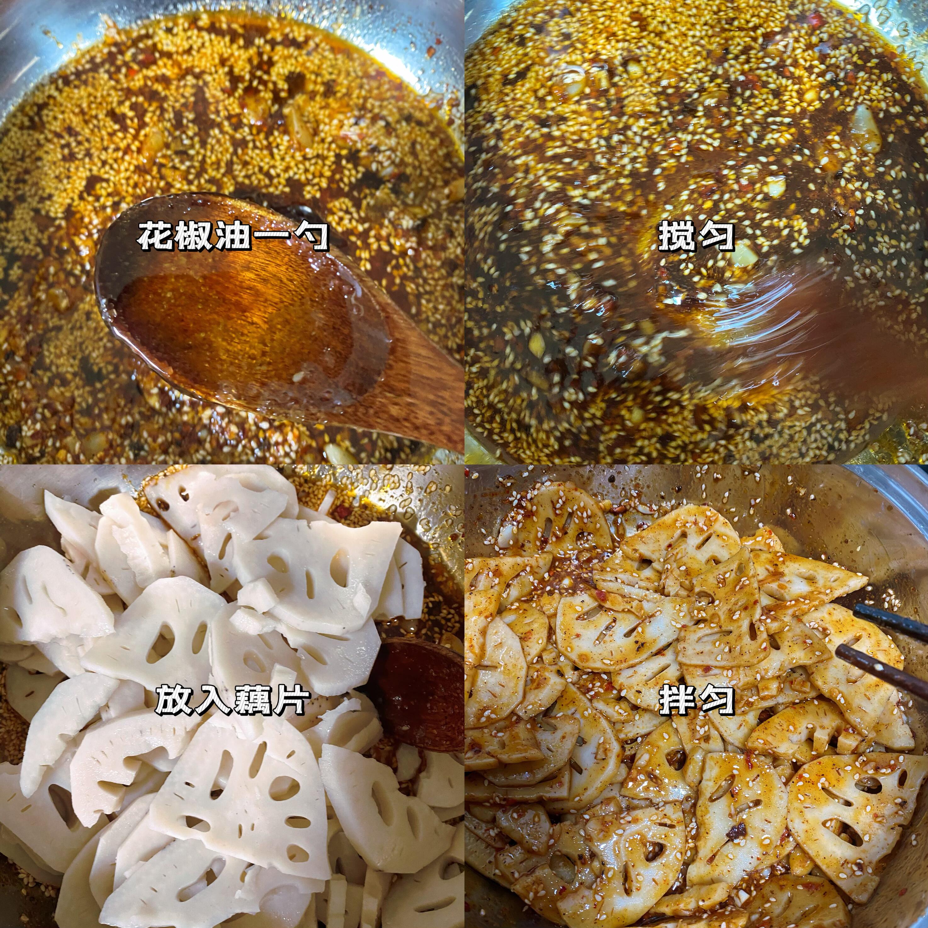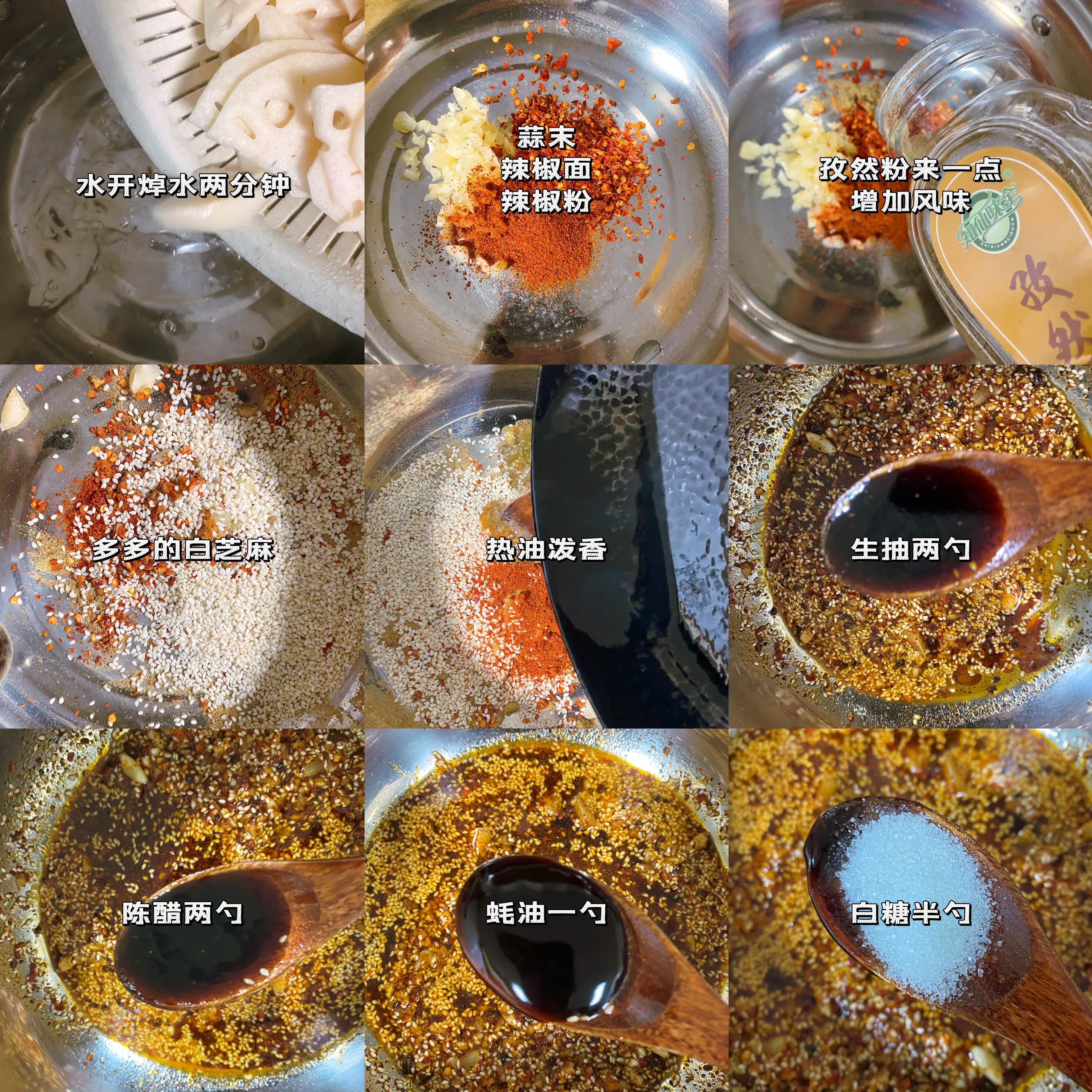 1、一大节藕去皮洗净切成一元硬币的厚度,冲洗掉藕粉后水开焯水两分钟,立马过冷开水沥干水分备用。 2、准备料汁,蒜末 辣椒面 辣椒粉,喜欢吃这三种可以多放,来点孜然粉增加风味,多多的芝麻,热油分次泼香,调味家里吃饭的小勺子两勺生抽,两勺陈醋,一勺蚝油,半勺白糖,一勺花椒油,倒入藕片,拌匀即可! 口味重的你可以再补点盐, 这样做的凉拌藕片真的无敌好吃! 超超超超超超推荐,一定要试一下!