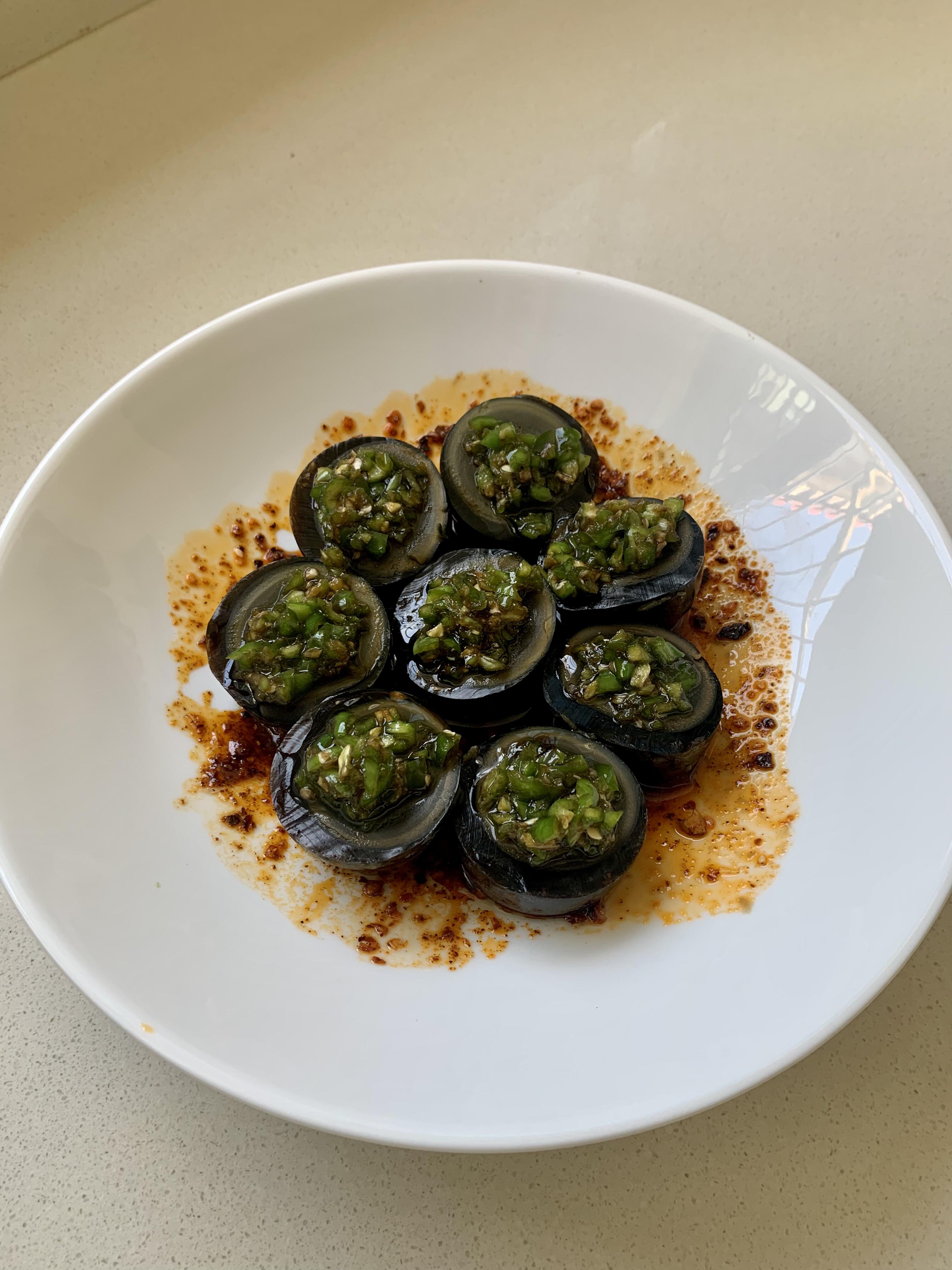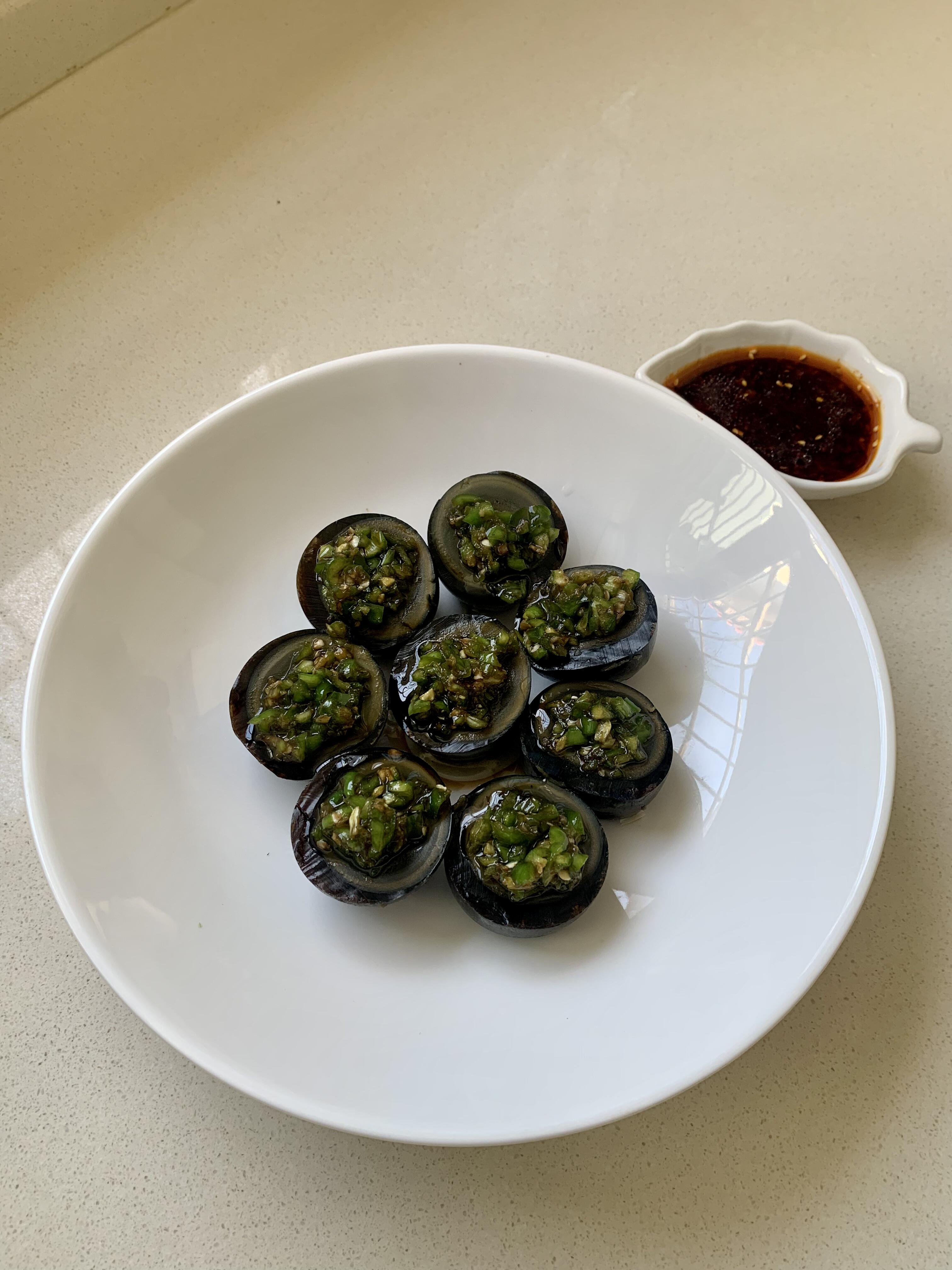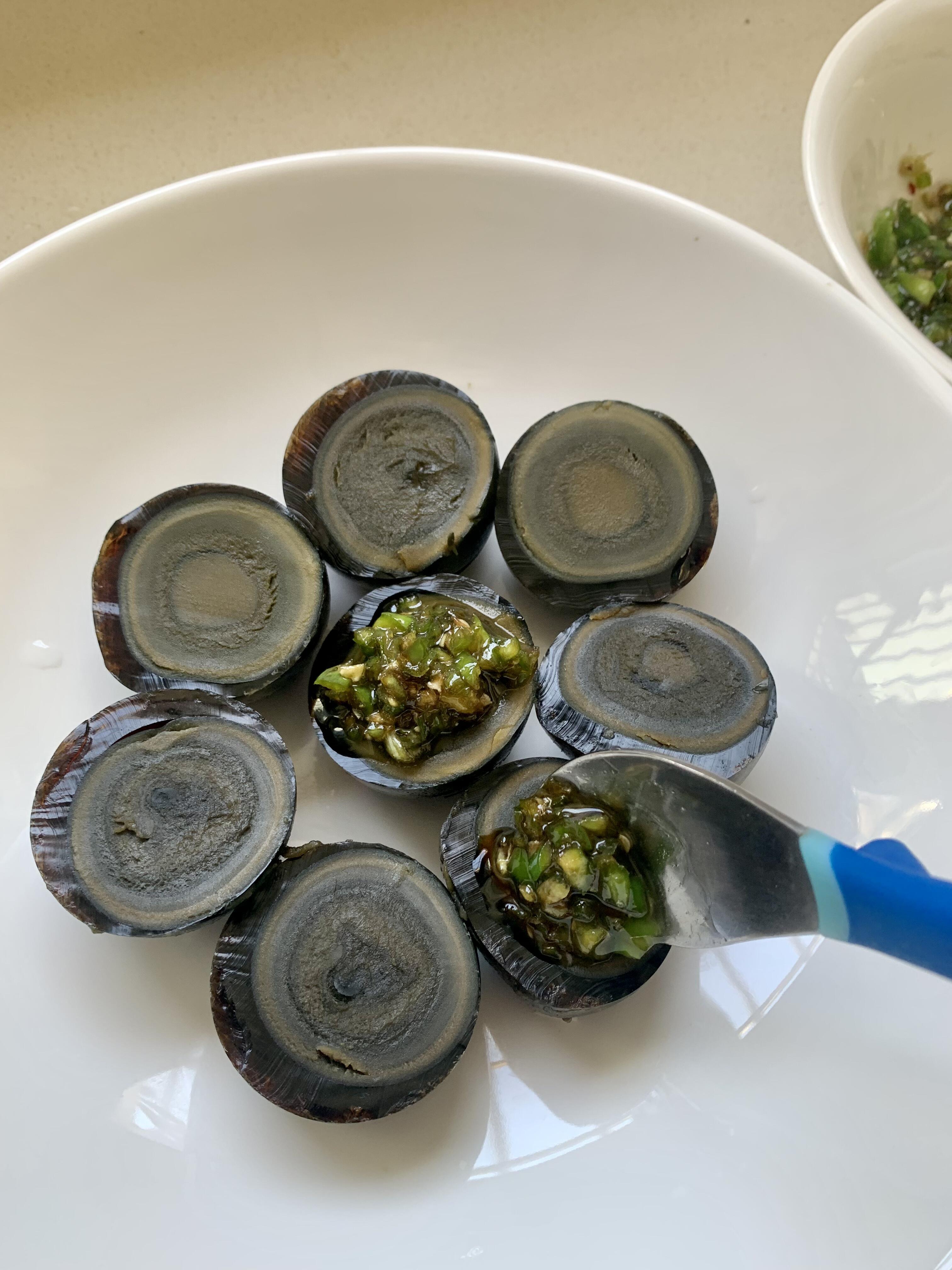 2、青椒剁碎,+盐、胡椒粉、白糖、糖油生抽,热油调匀,舀到皮蛋上。