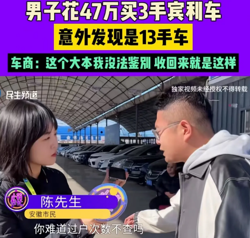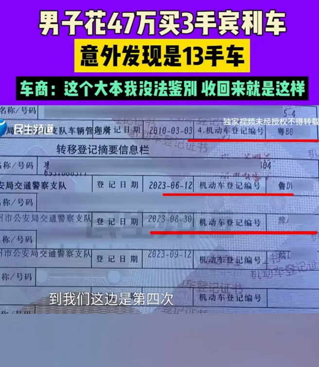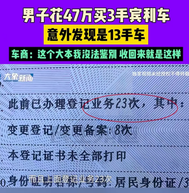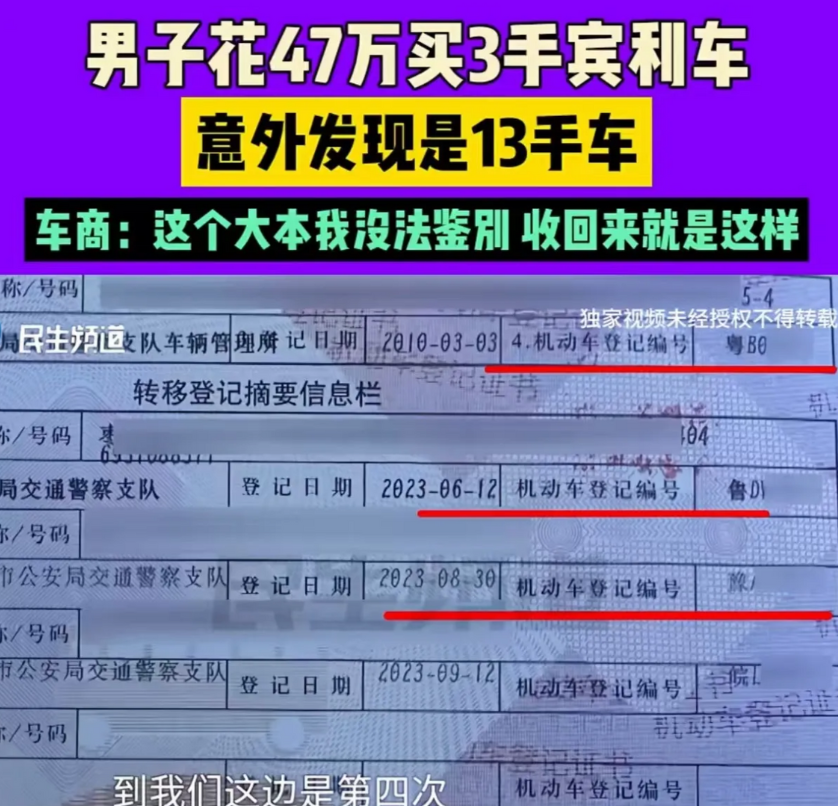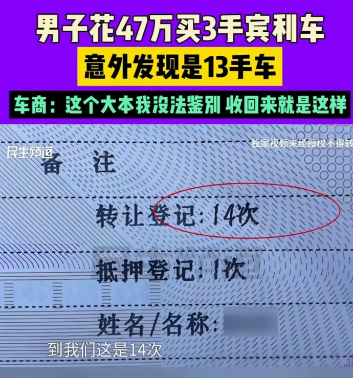 冤大头!2023年9月一男子为了有面子,花 47 万买了一辆 3 手的宾利,而一年后他意外发现车辆竟是 13 手!男子:“旧的车辆大本上显示只过户 3 次,但新补办的大本却显示变更登记 13 次,之前发证的车管部门里有没有内鬼?”