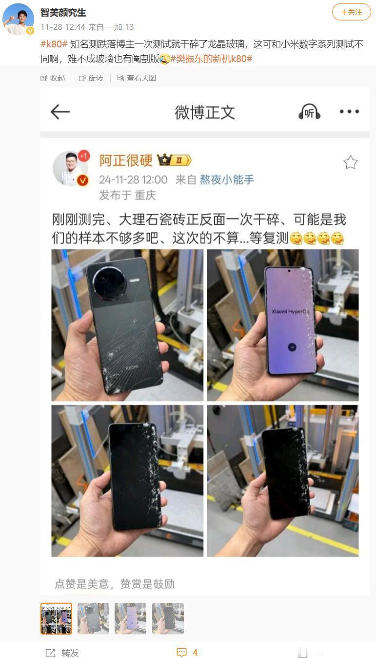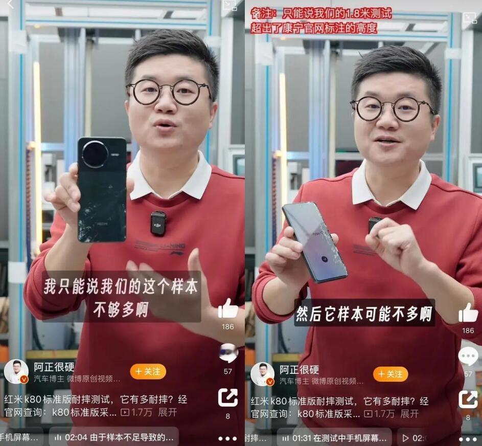 红米K80跌落测试,打醒了多少人 估计就连雷军也没有想到吧!我觉得就是雷军脾气太好了。反正我不按照标准测试,就想要恶心小米一下,真的是如鲠在喉啊!这可是明目张胆,事情的起因是名字叫“阿正很硬”的博主测试了红米K80标准版的抗摔能力,最后结果是双面玻璃都碎了:然后神奇的事情发生了,一共三点: ①K80用的不是龙晶玻璃,而是康宁的玻璃。 ②而康宁的玻璃本身官网也表明了实验条件下,就是一米高度,模拟沥青路面跌落完好无损。而博主用的是1.8米高度。 ③最后博主打圆场说:我们的测试的样本不够多,随后再去测试。你看吧!就是这样没有重度宣传防摔的红米K80,被莫名摆了一道。反正就是想要恶心你一下 因为按照不按照测试标准,其实大家看的是过程。节奏已经带起来了,所以你看“加人们”开始行动起来了:开始朝着龙晶玻璃说事情,压根不理会你K80用的是康宁玻璃这件事情。另外对于普通消费者来说,看的就是过程。结果就是你的手机摔碎了,就是红米质量不好等等这些言论就起来了..... 说句实话这事情也不偏袒谁,也不是替谁说话。扪心自问,这样的测试不就是蹭一下热度,说句实话换做任何一个品牌估计都忍不了吧!