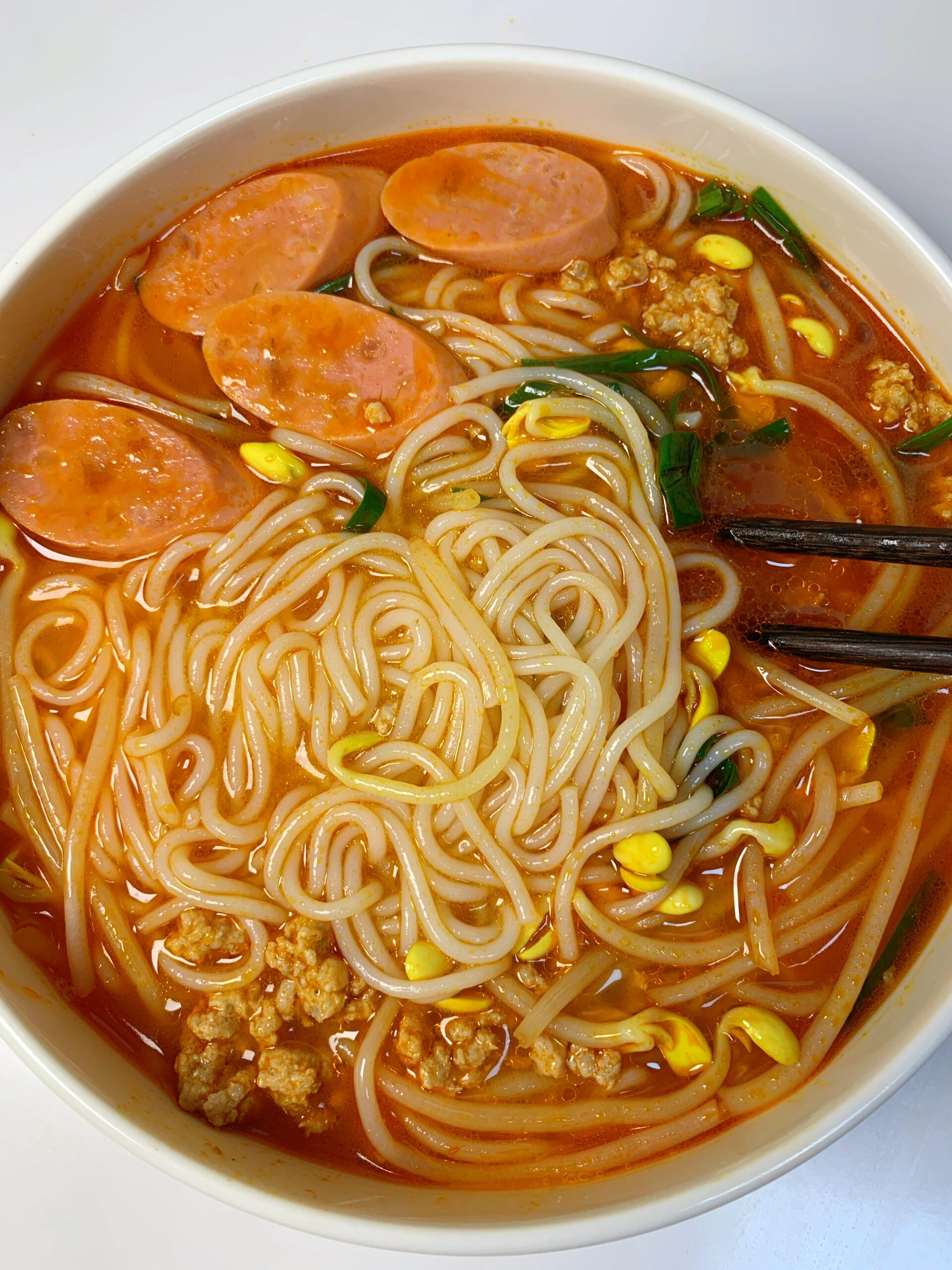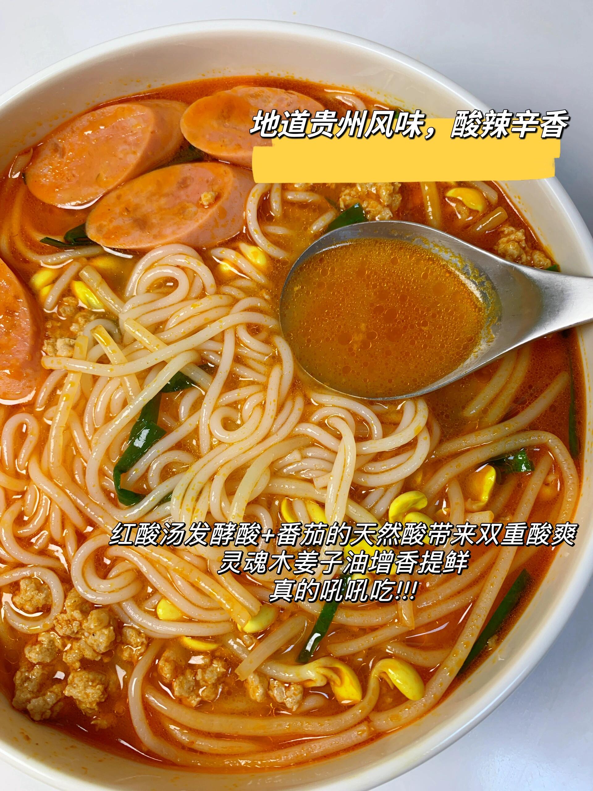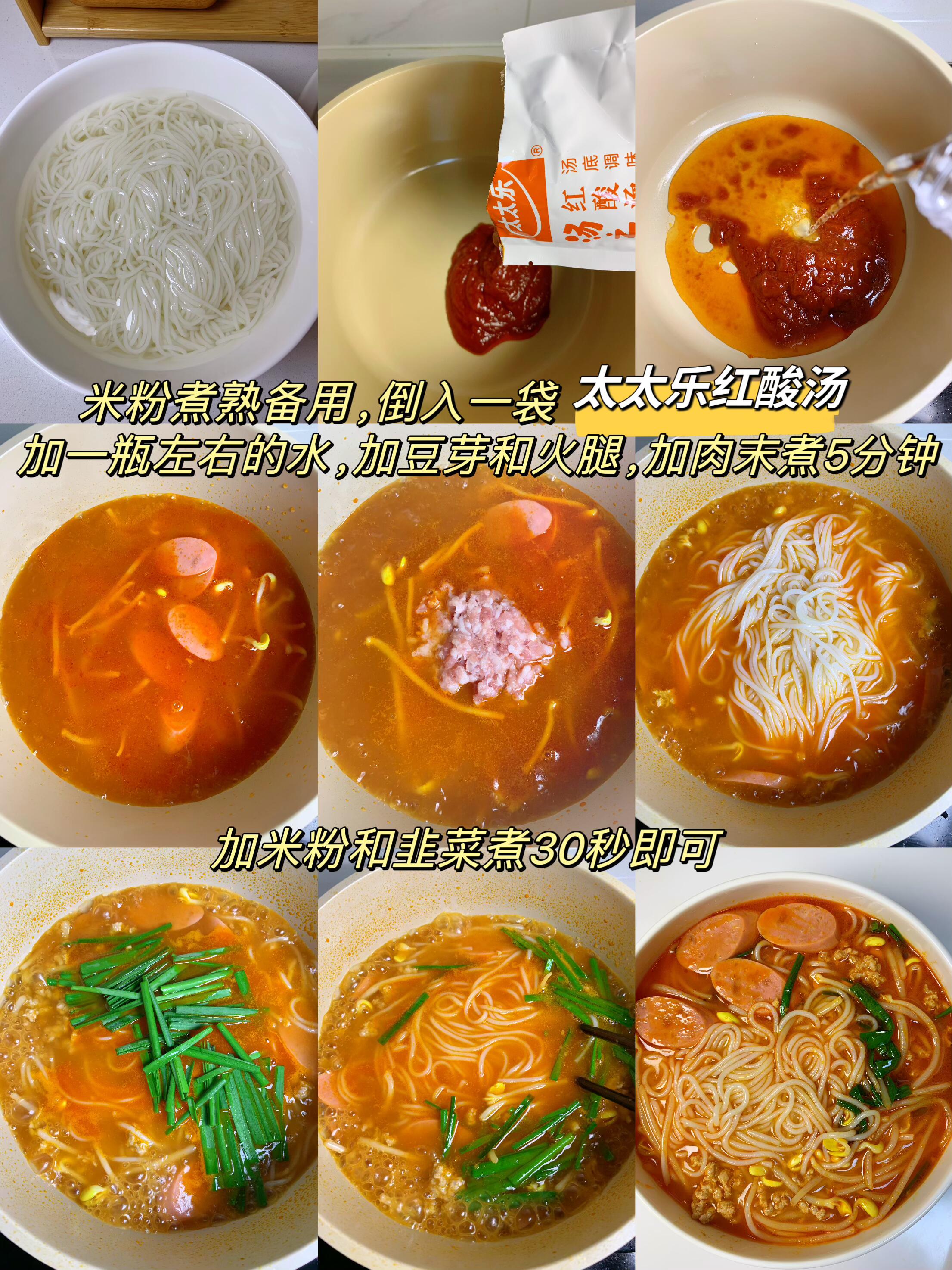 答应我,一定要试试这个红酸汤米粉! 天天看着你们分享在家吃红酸汤米粉, 今天我终于也吃上这一口啦 酸辣辛香,真的巨过瘾! 食材:米粉,肉末,豆芽,火腿,韭菜,太太乐红酸汤 做法: 1、米粉泡软煮熟备用 2、锅内倒入一小包太太乐红酸汤,加一瓶左右的水煮开(不用炒制也不用再调味啦,超级方便的有没有~ 3、加豆芽和火腿,加肉末煮5分钟,加米粉和韭菜煮30秒即可!