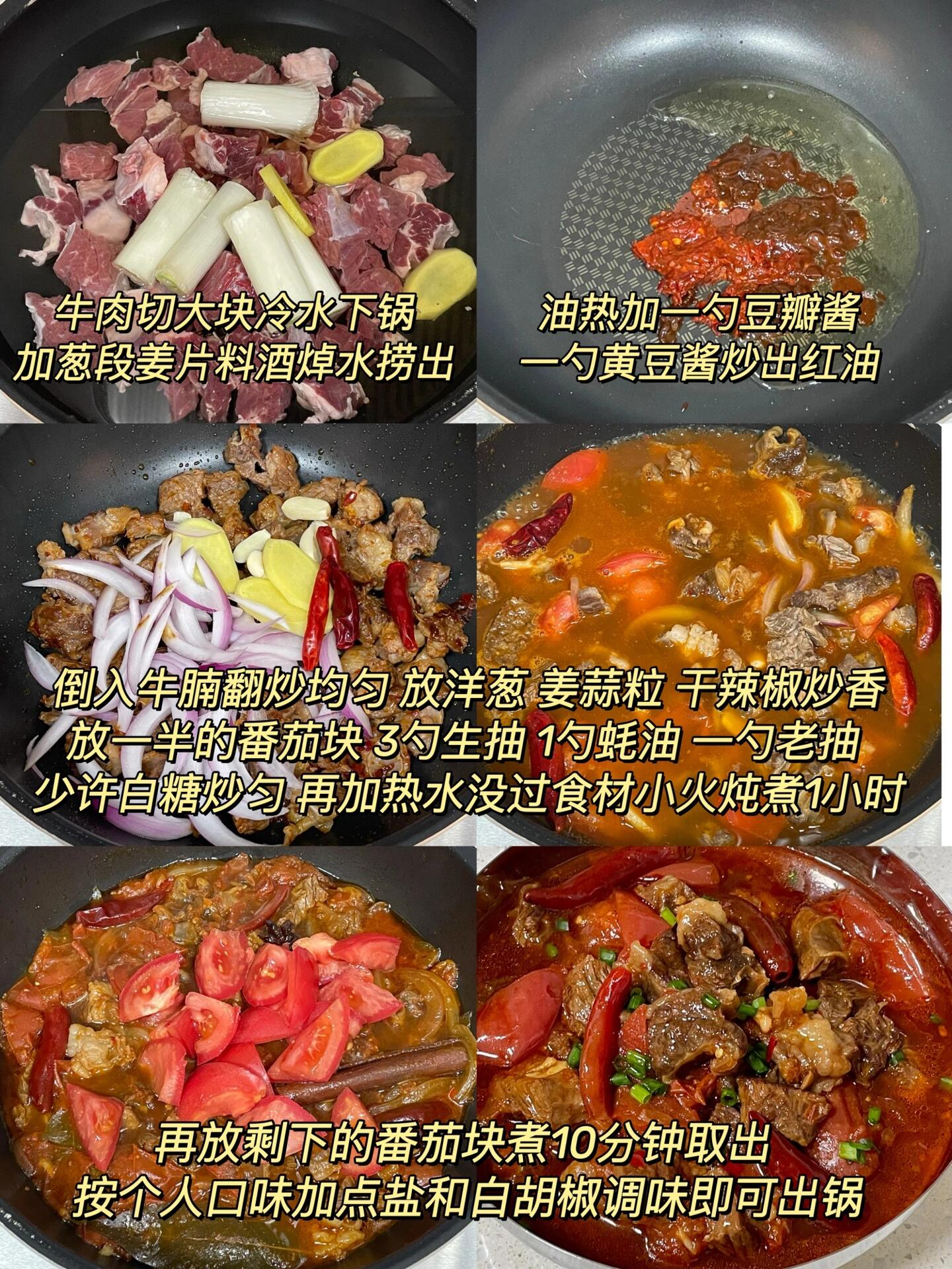一次成功的番茄炖牛肉!真的巨巨香!! 都去做这个酱香浓郁的番茄炖牛腩! 牛肉软烂入味,番茄融入汤汁里酸甜鲜美 拌上米饭真的香迷糊了 - 食材:牛肉/牛腩,葱姜蒜,番茄,洋葱,干辣椒,豆瓣酱,黄豆酱,料酒,生抽,老抽,蚝油,白糖,盐,白胡椒粉 做法在图片上 爱吃土豆的姐妹还可以加点土豆块下锅一起煮,会很入味!!